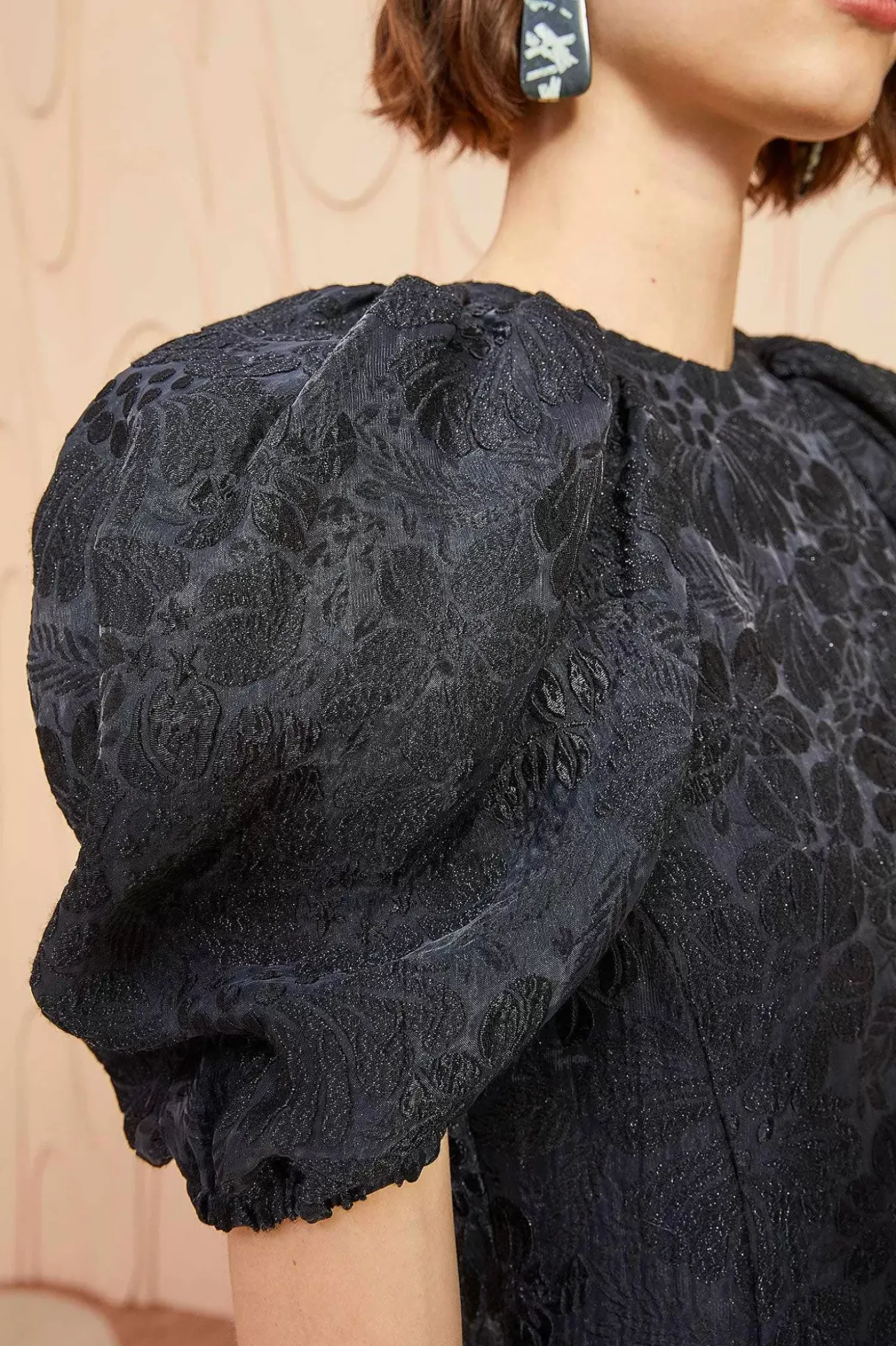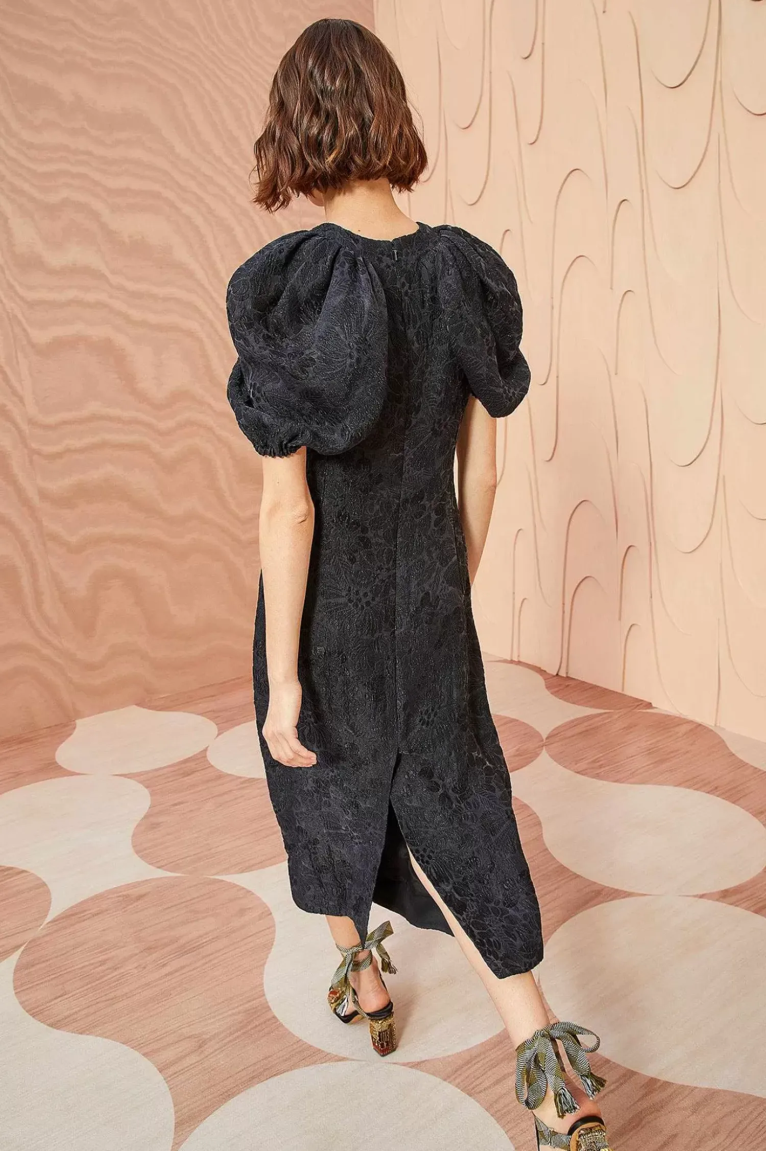 Crafted From Our Standout Cloque Jacquard, The Amandine Dress Features A Gorgeous Moon Flower Motif And Is The Perfect Style For A Special Occasion. This Timeless Black Midi Dress Features Our Signature Puff Sleeves, A Body-Skimming Silhouette, And A Back Hem Split For Ease Of Movement. It Is Finished With A Hidden Center-Back Zipper.