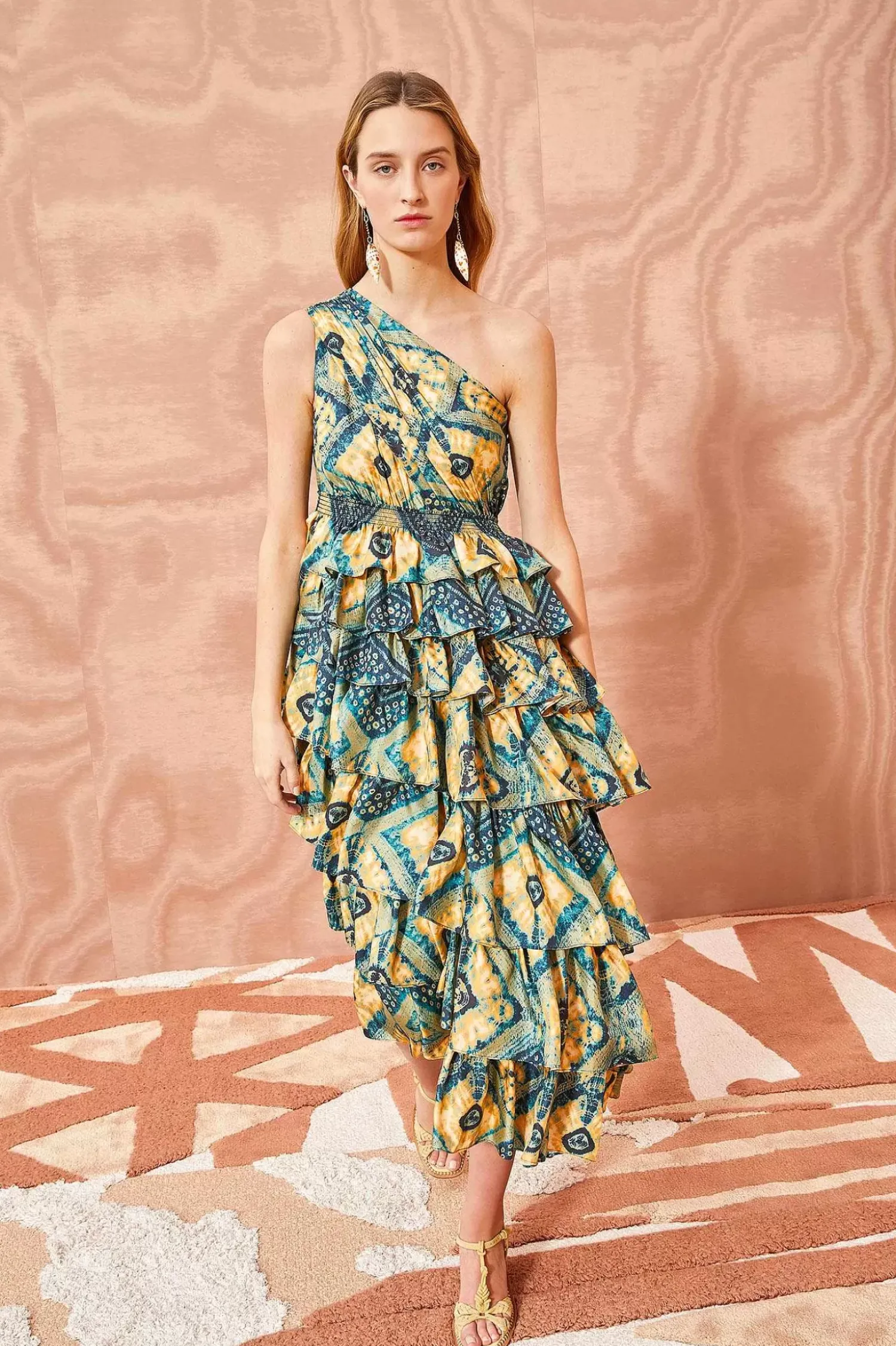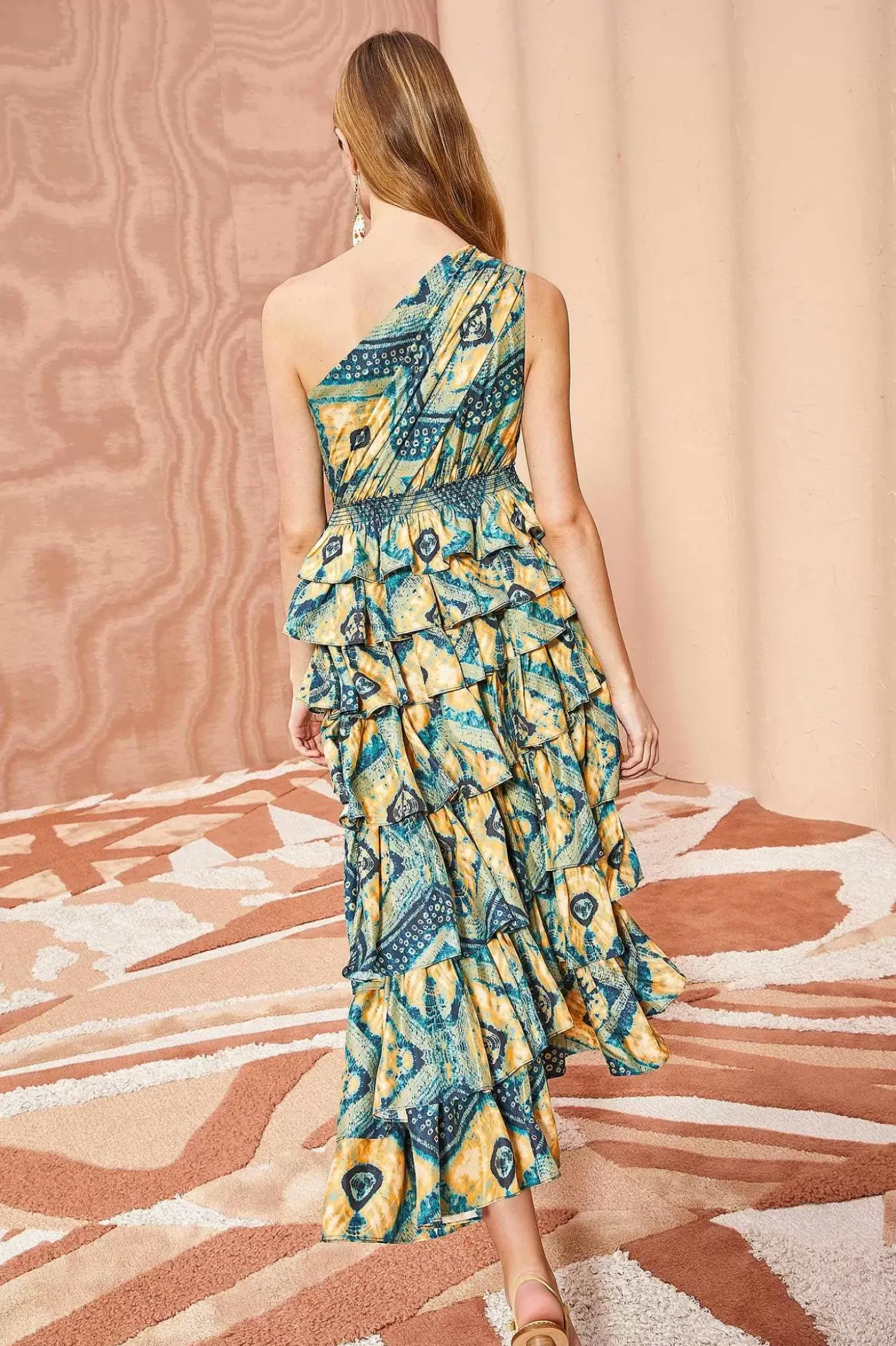 The Auryn Gown Is A Stunning Maxi Dress That Boasts A Mesmerizing Diamond Shibori Motif That’S Been Digitally Printed On 100% Silk Twill. This One-Shouldered, Blue And Yellow Silhouette Features Cascading Tiers And An Asymmetrical Hemline. Finished With A Side-Seam Zipper.