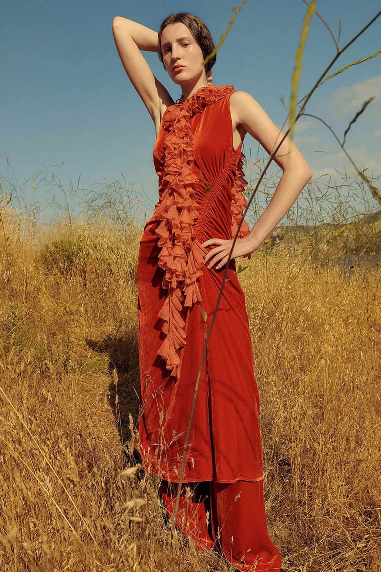 As Featured In Look 16 Of Our Pre-Spring ’24 Lookbook, The Cornelia Dress Is Made From Our Luxurious Liquid Velvet In Carnelian Red. This Sleeveless Midi Dress Features A Round Neckline And Gorgeous Ruching That Defines The Silhouette And Cascades Down To The Front Split. It Is Finished With A Side-Seam Zipper And Back Button Keyhole.