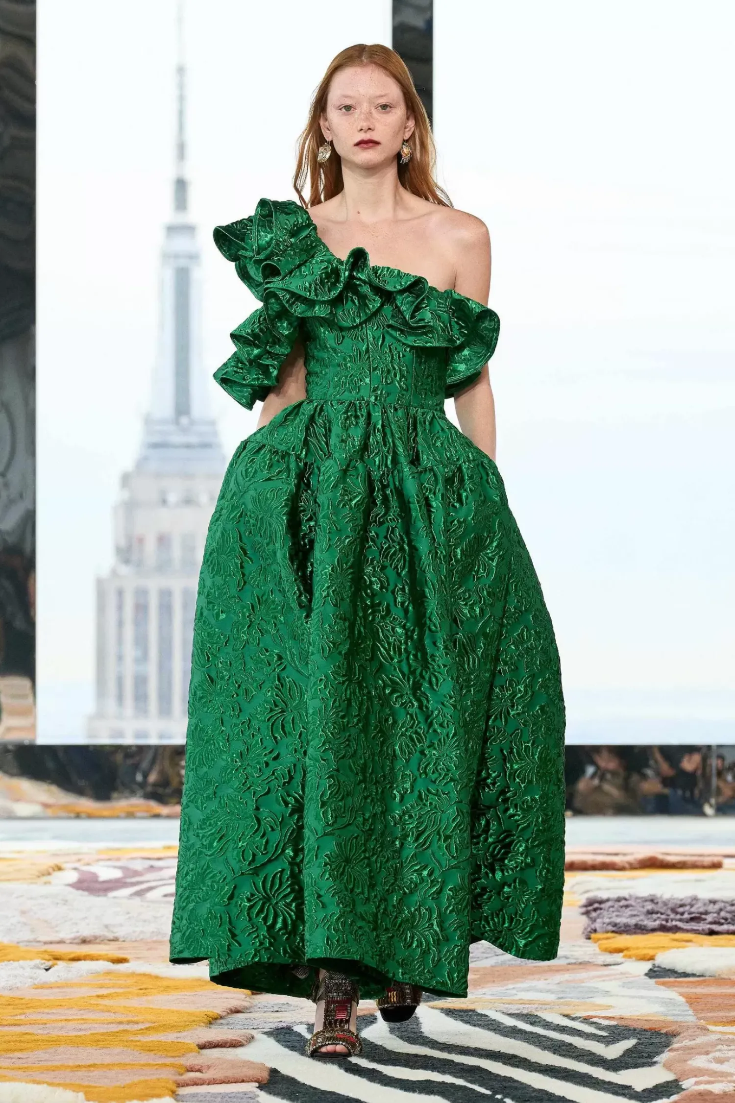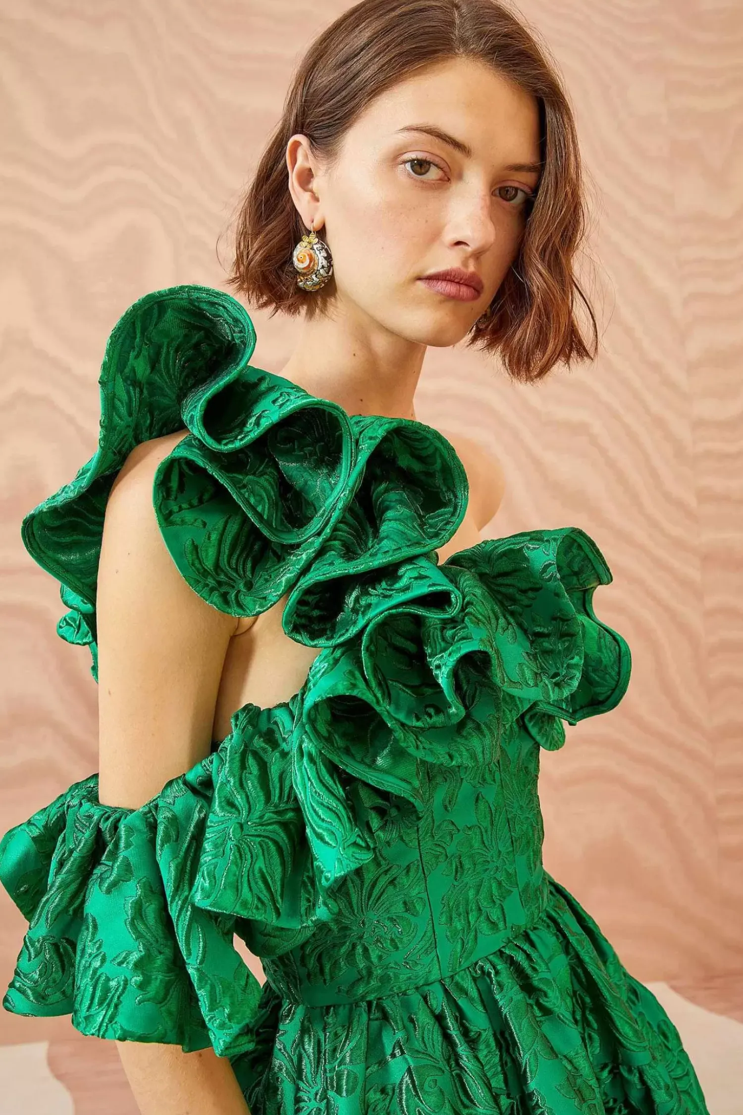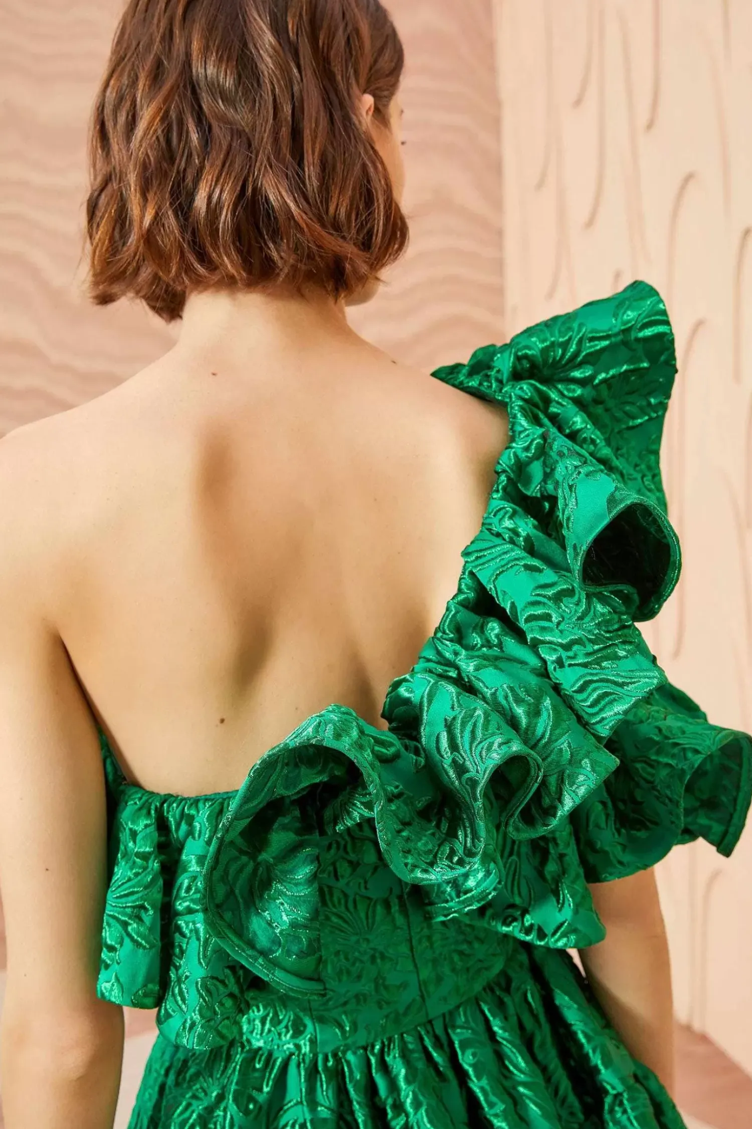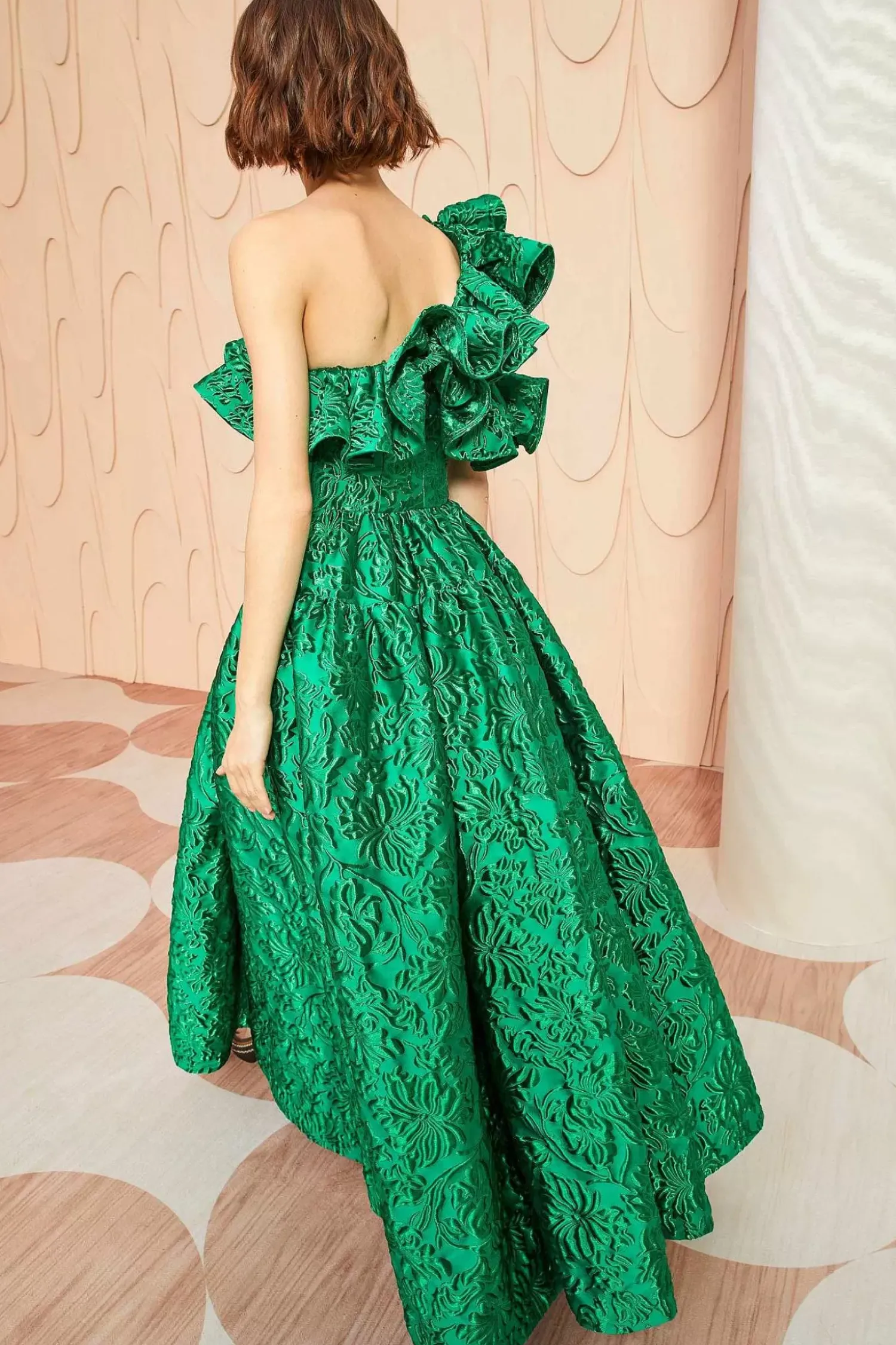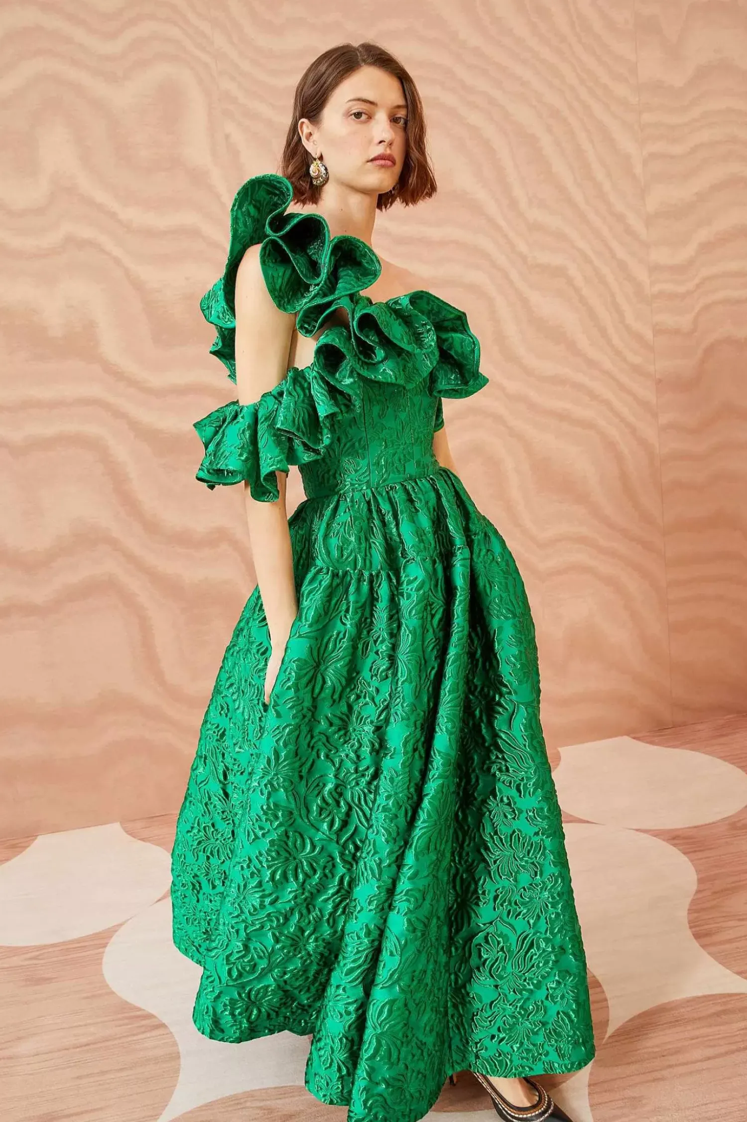 As Featured In Look 52 Of Our Autumn/Winter ’23 Runway Show, The Cosima Dress Is Made From Our Italian Lurex Cloque Jacquard Which Arrives In An Ethereal Yet Striking Monochrome Emerald Hue. This Impactful Ballgown Features Light Boning Within The Bodice, A Full Gathered Skirt, And Is Adorned With Architectural Ruffles Along The One-Shoulder Silhouette. It Is Finished With A Hidden Side-Seam Zipper.