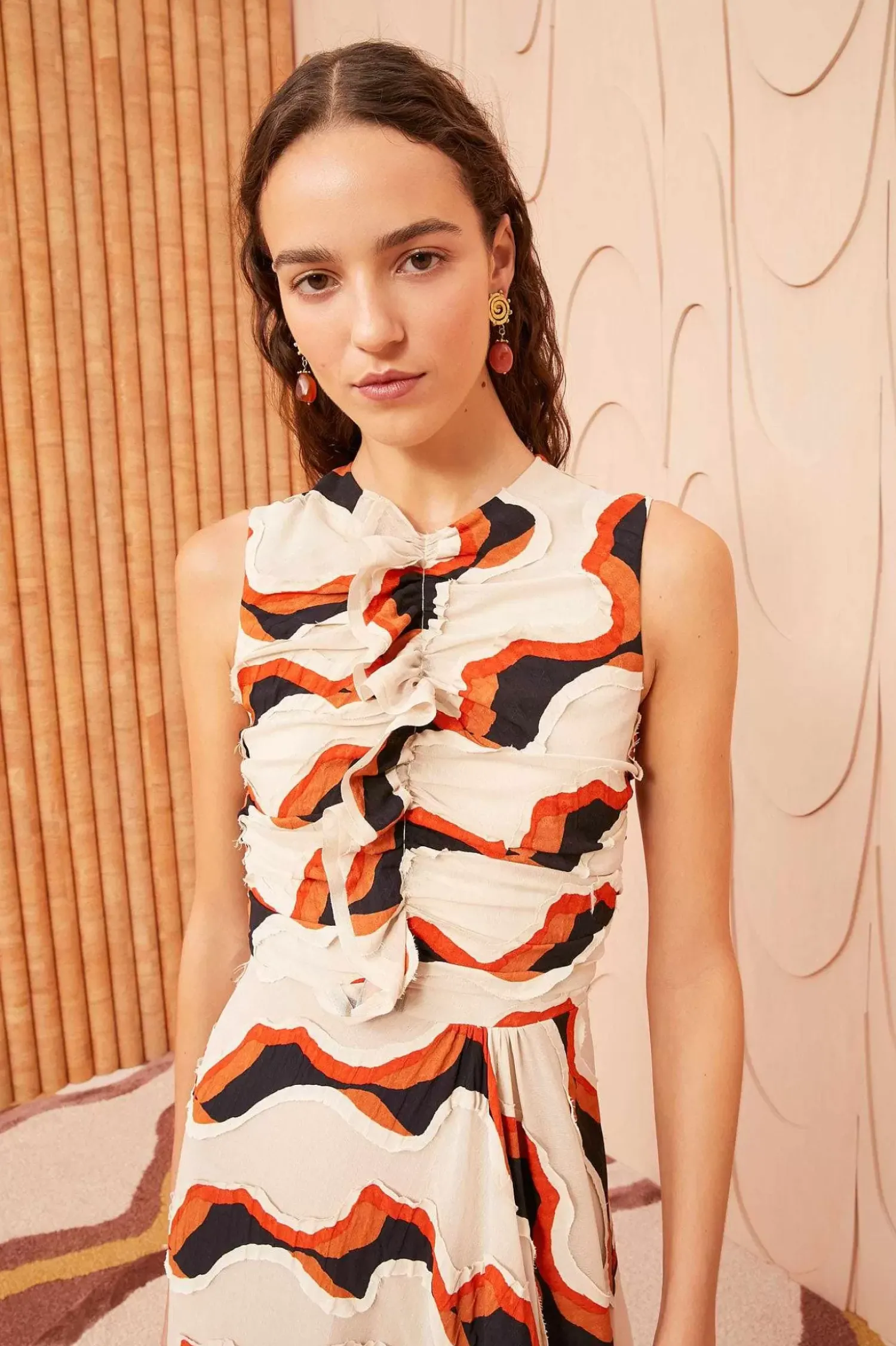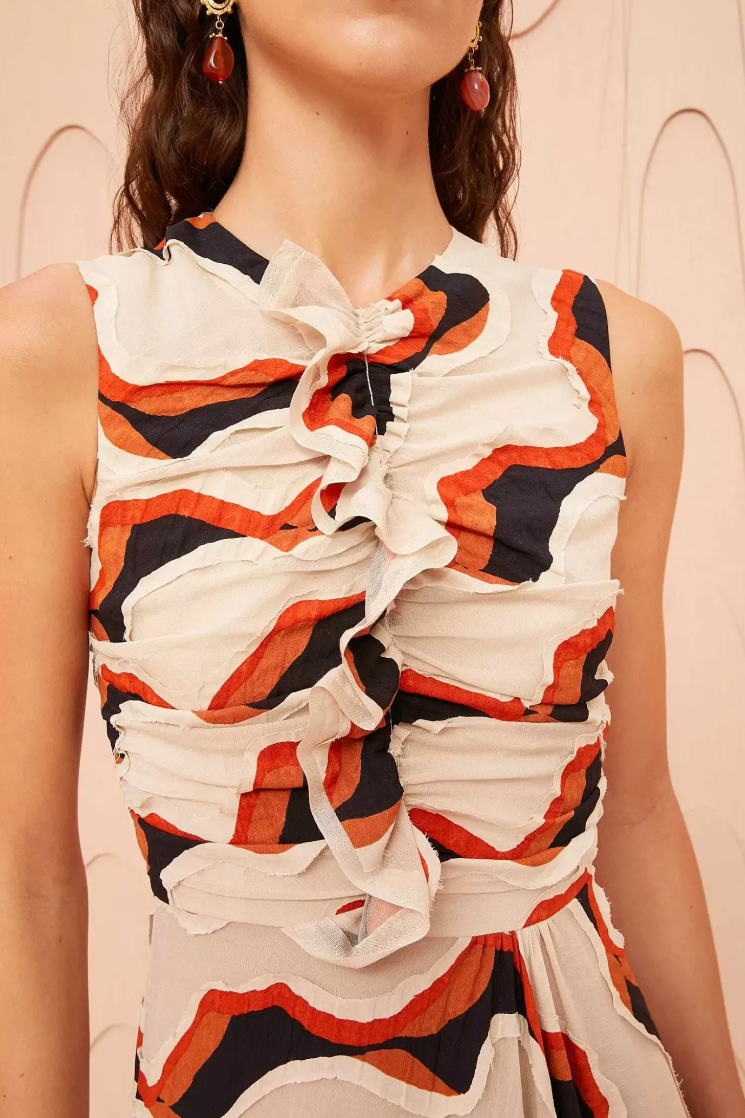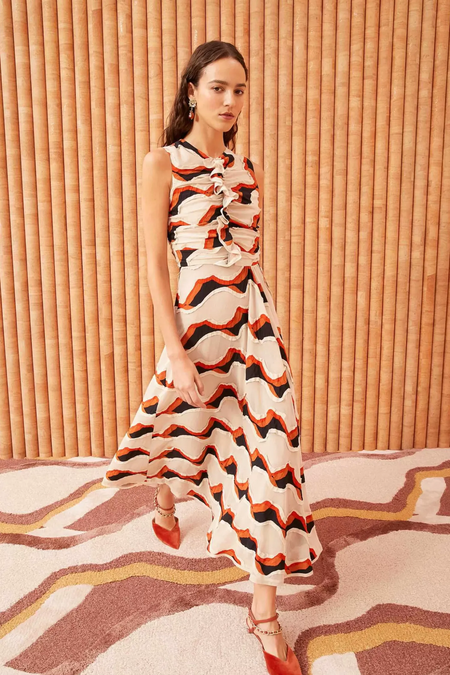 The Cruz Dress Is Skillfully Made From Our Waving Stripe Devore–A Fabric Made In Italy With Diagonal Graphics That Create An Alluring Patchwork Of Sheerness And Opacity. This Off-White, Orange, And Black Midi Dress Boasts A Fluid, Sleeveless Silhouette Elevated With Ruching And Ruffles. It Fastens With A Concealed Center-Back Zipper.