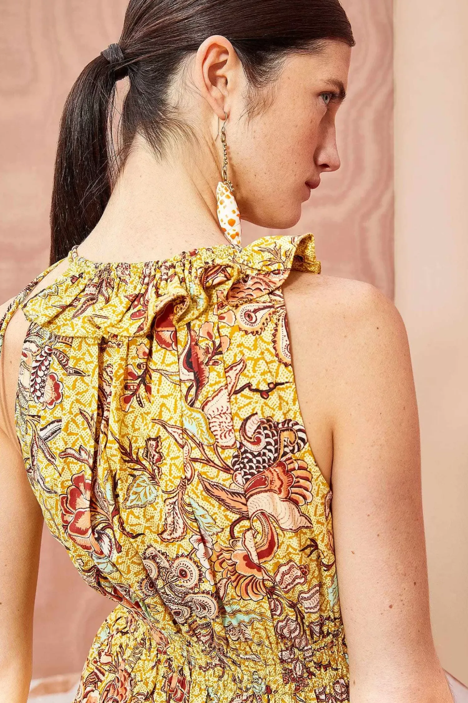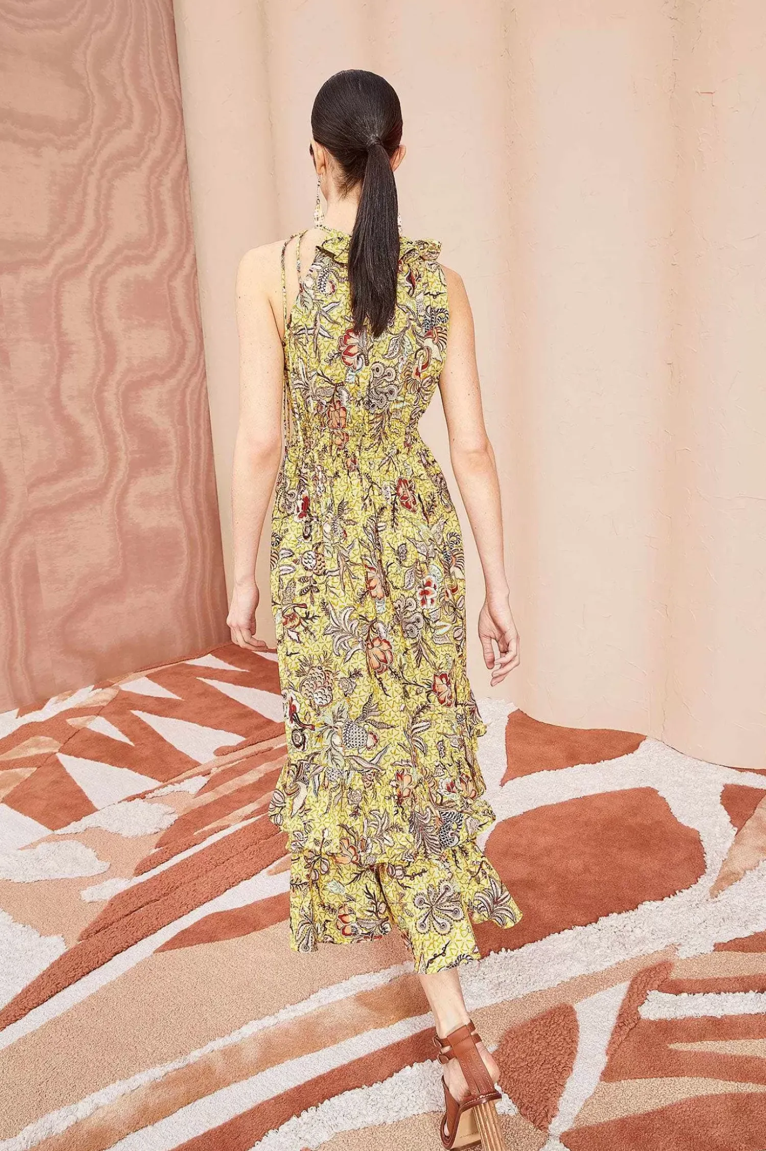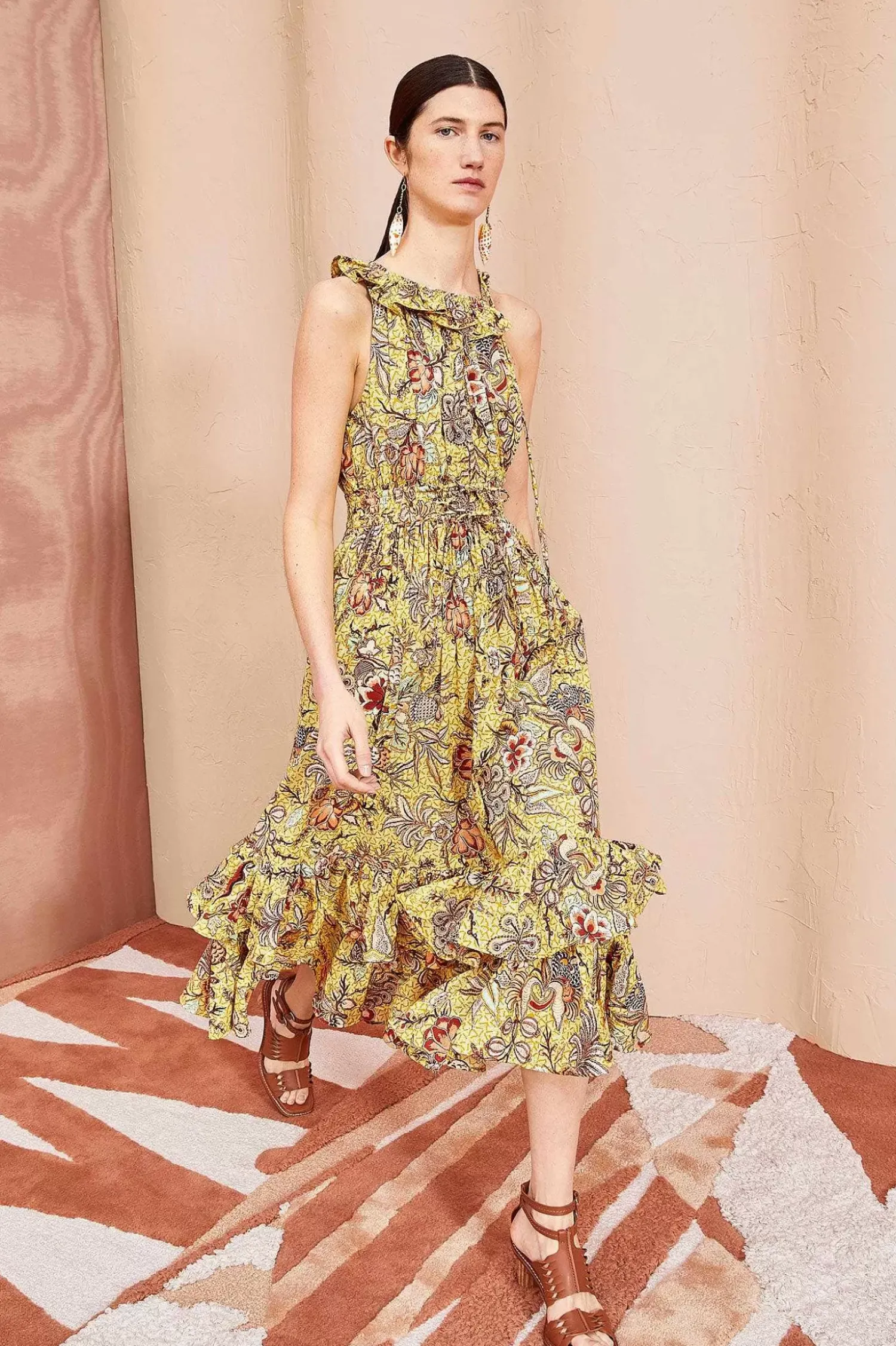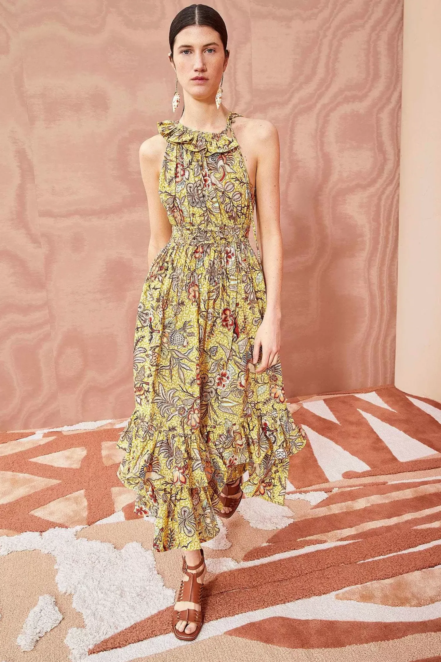 As Featured In Look 36 Of Our Pre-Fall ’23 Lookbook, The Delfina Dress Is Made From Our Wild Hibiscus Printed Poplin In Yellow And Red Hues. This Silhouette Introduces This Season’S New Asymmetrical Neckline, Featuring A One-Shoulder Ruffle Sleeve Paired With A Delicate Drawstring Tie On The Opposite Side. The Extra-Long Drawstring Detail Is Completed With Functional Button Loops, Allowing The Strings To Lay Flat In The Front Or The Back As Is Shown. Finished With An Elastic Waist, Pockets, And Double-Tiered Ruffle Hem.