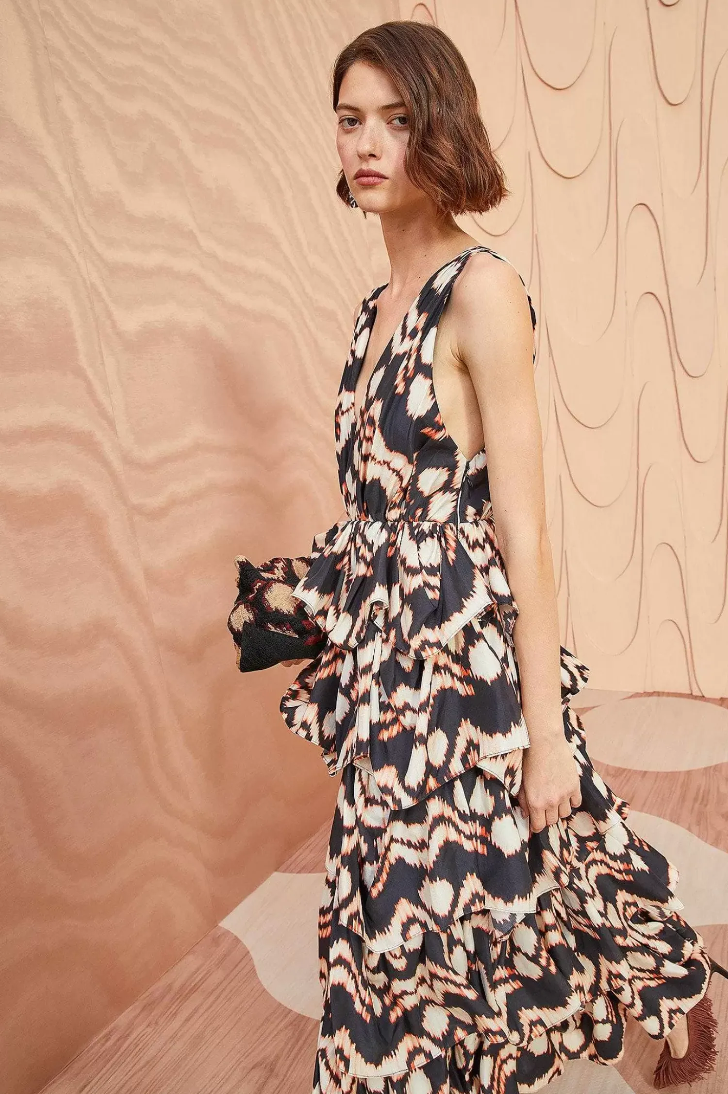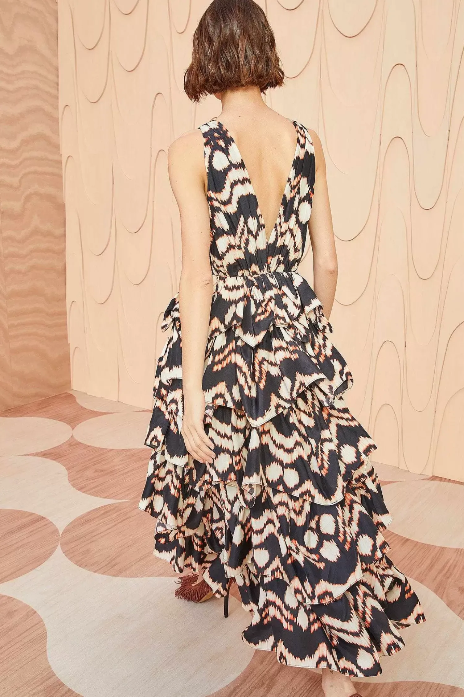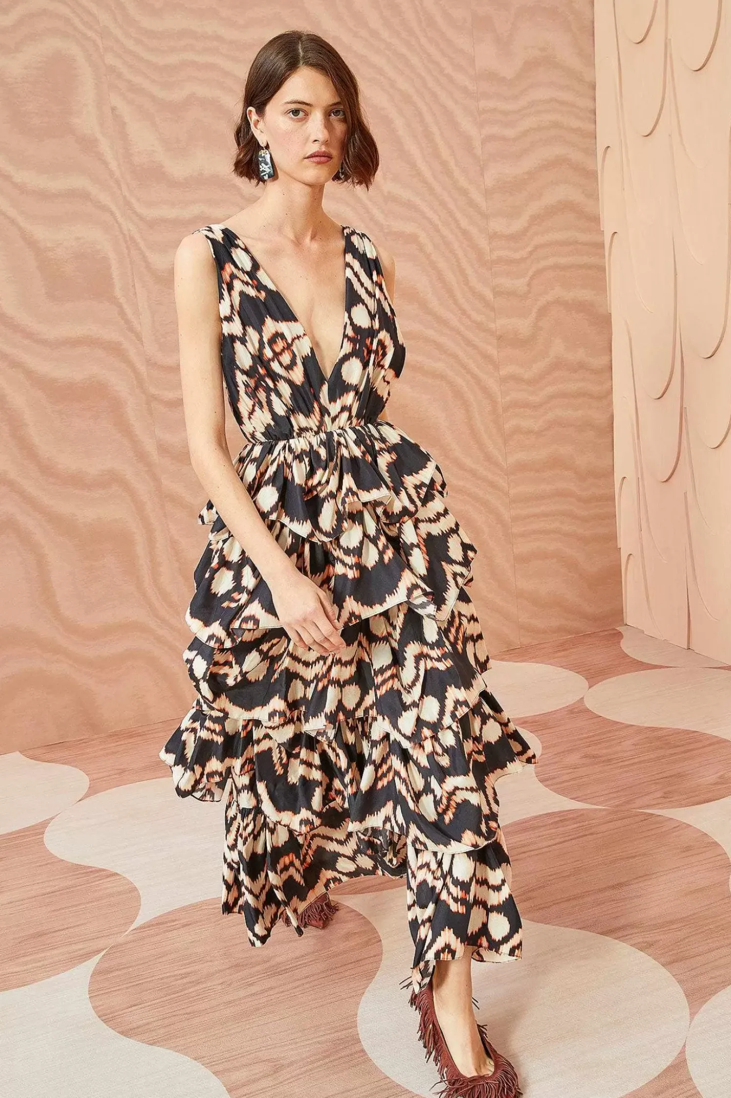 An Ulla Johnson Exclusive Only Available In Our Stores Or On Our Website, The Dephne Dress Is Made From Silk Taffeta Printed In A Graphic Ikat-Inspired Stripe. This Gorgeous Cream And Black Dress Features A Midi-Length Ruffle Skirt With Bubble-Edged Tiers Reminiscent Of Peony Petals. It Has A Deep V-Neckline And Side-Seam Zipper.