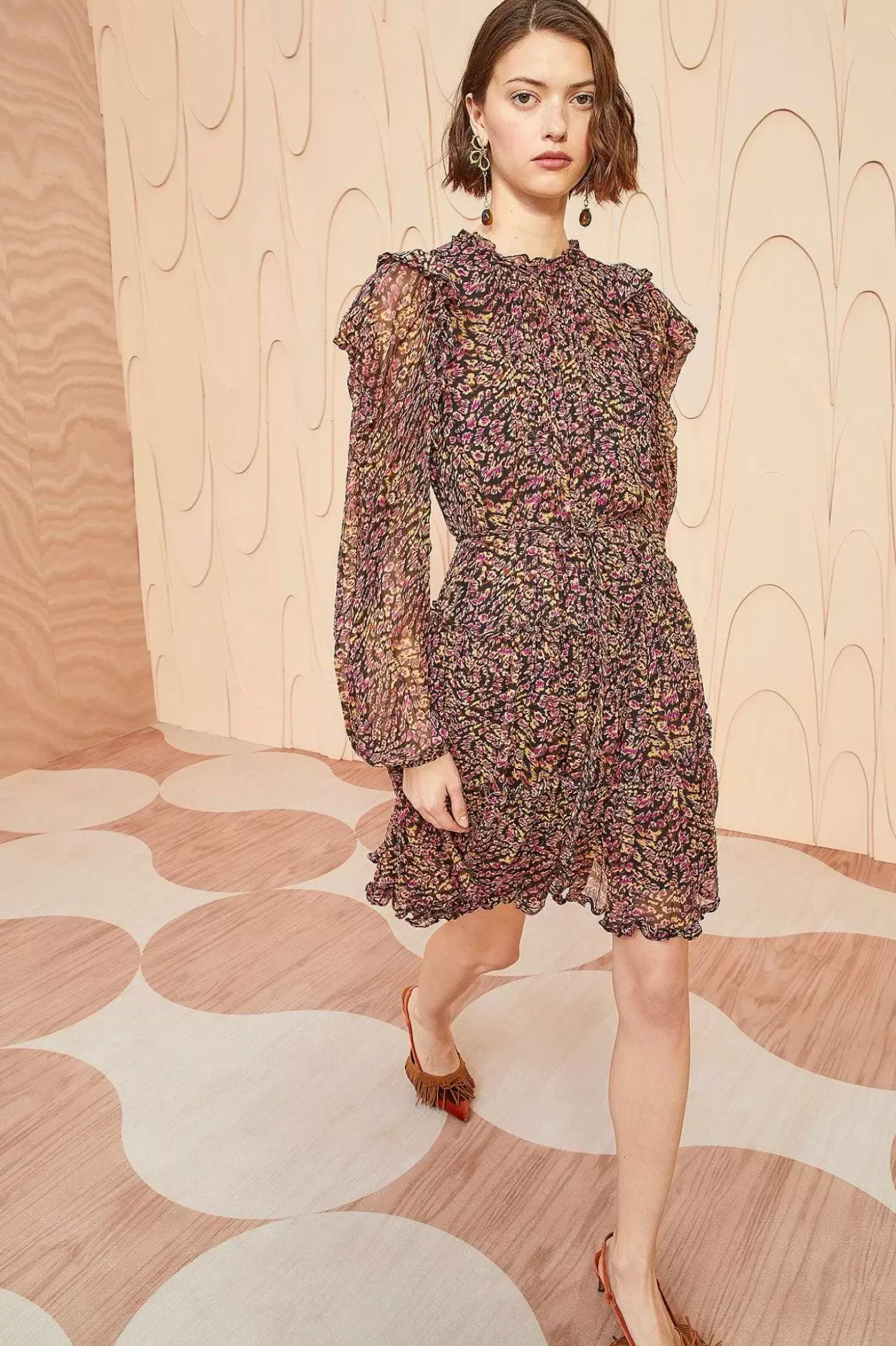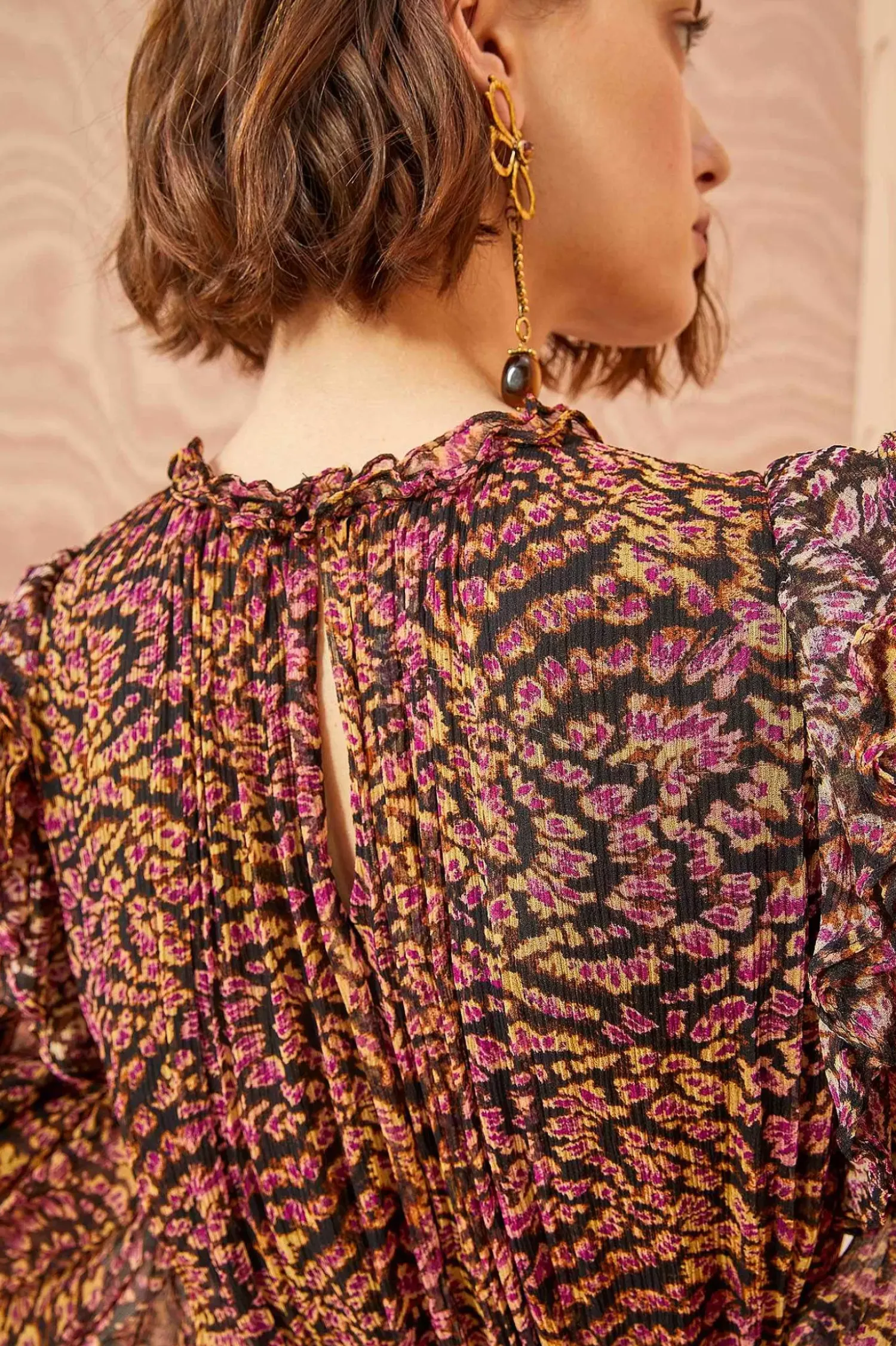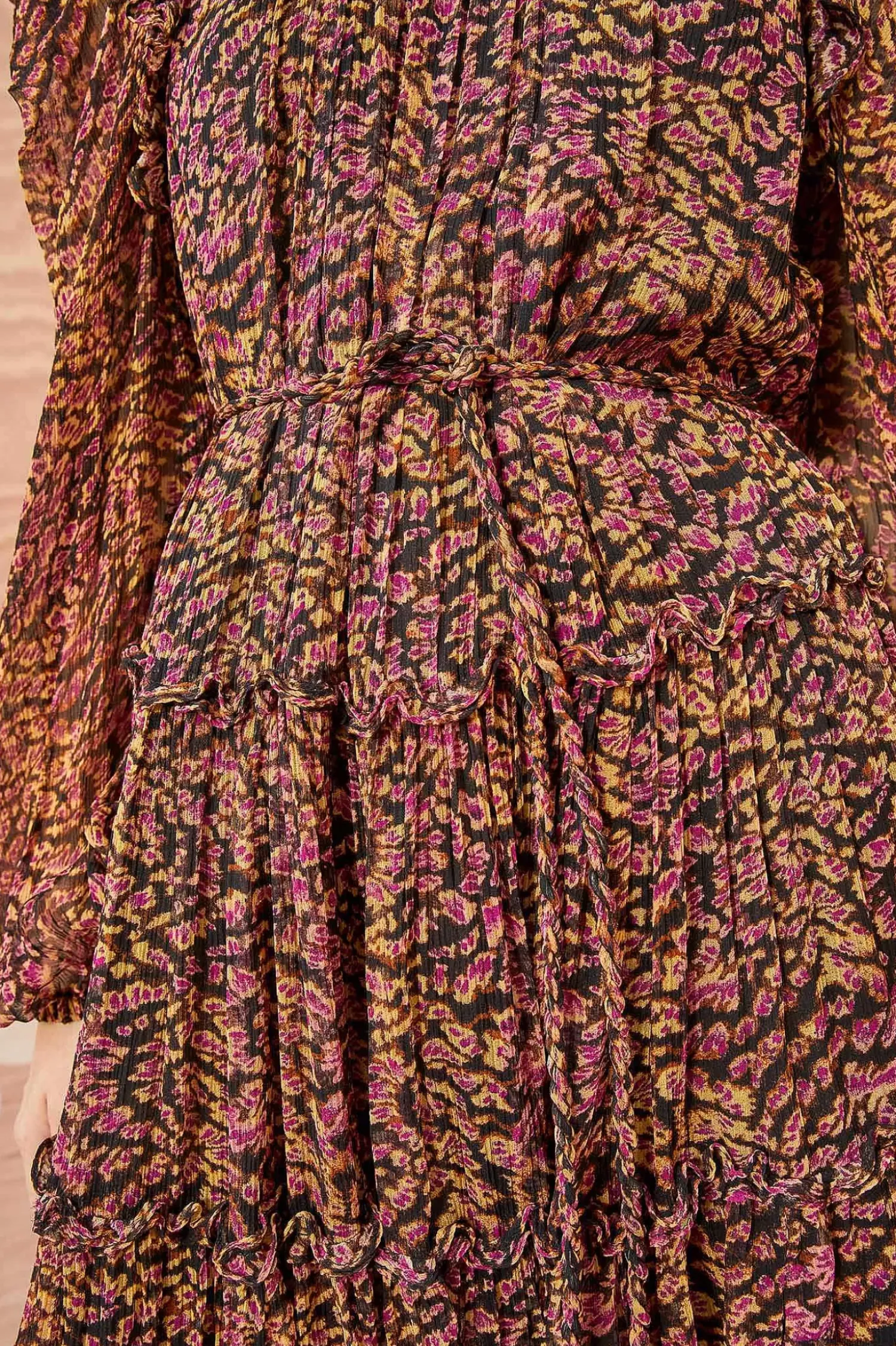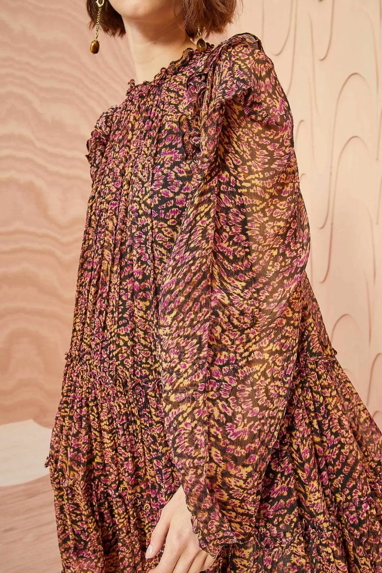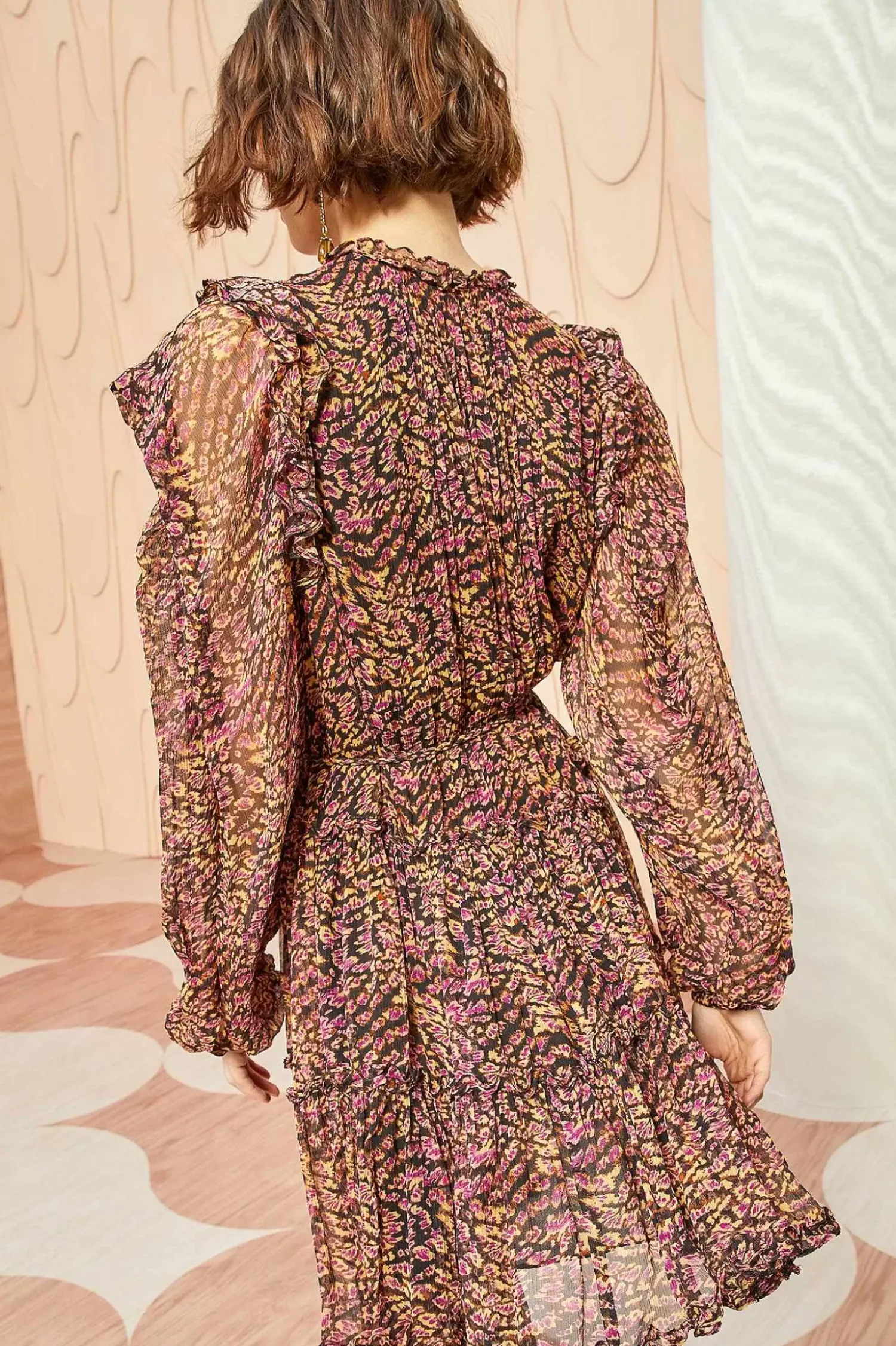 The Gaelle Dress Is Made From Luxurious Silk Crinkled Chiffon That’S Micro-Painted With A Lovely Brown And Pink Leopard Print. This Mini Dress Features Gently Puffed Sleeves, Curling Ruffle Trims, And A Removable Tie Belt For A Cinched Look. It Is Finished With A Back Button Keyhole Closure.
