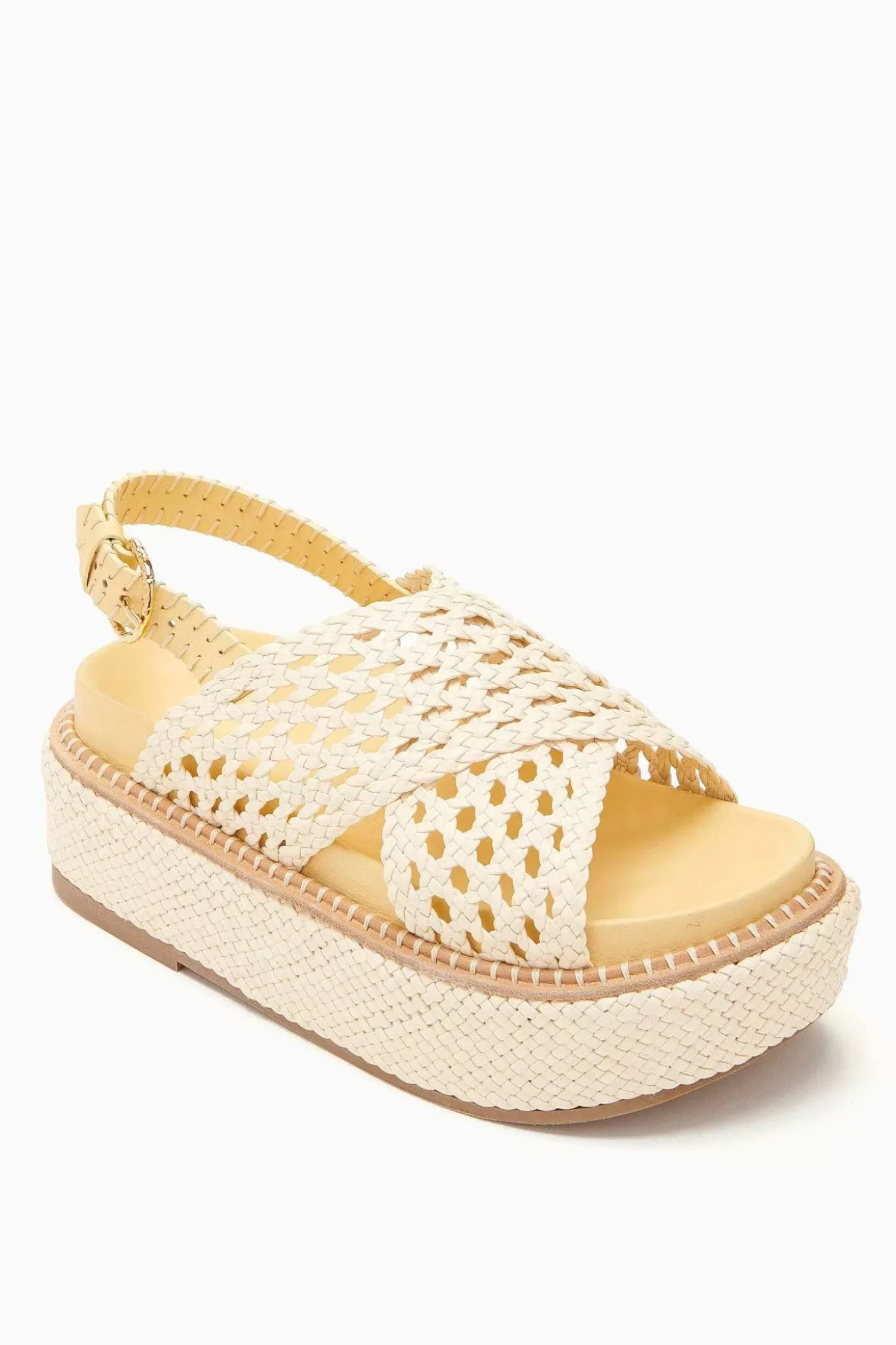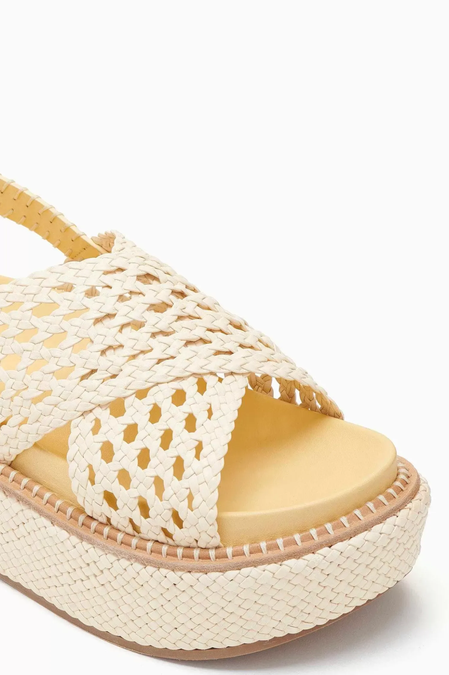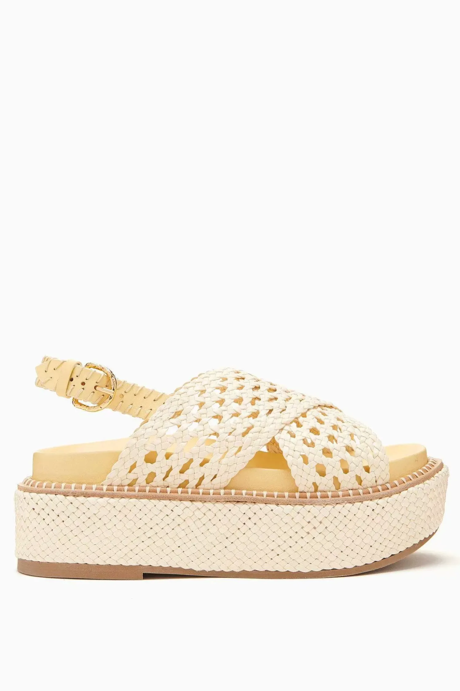 The Gili Woven Flatform Is A Beautiful Warm-Weather Sandal, Crafted From Light Yellow Leather. This Criss-Cross Style Sits Upon A Woven Leather Platform And Features A Back Strap For A Comfortable Fit. Finished With A Hand-Hammered, Shiny Brass Buckle.