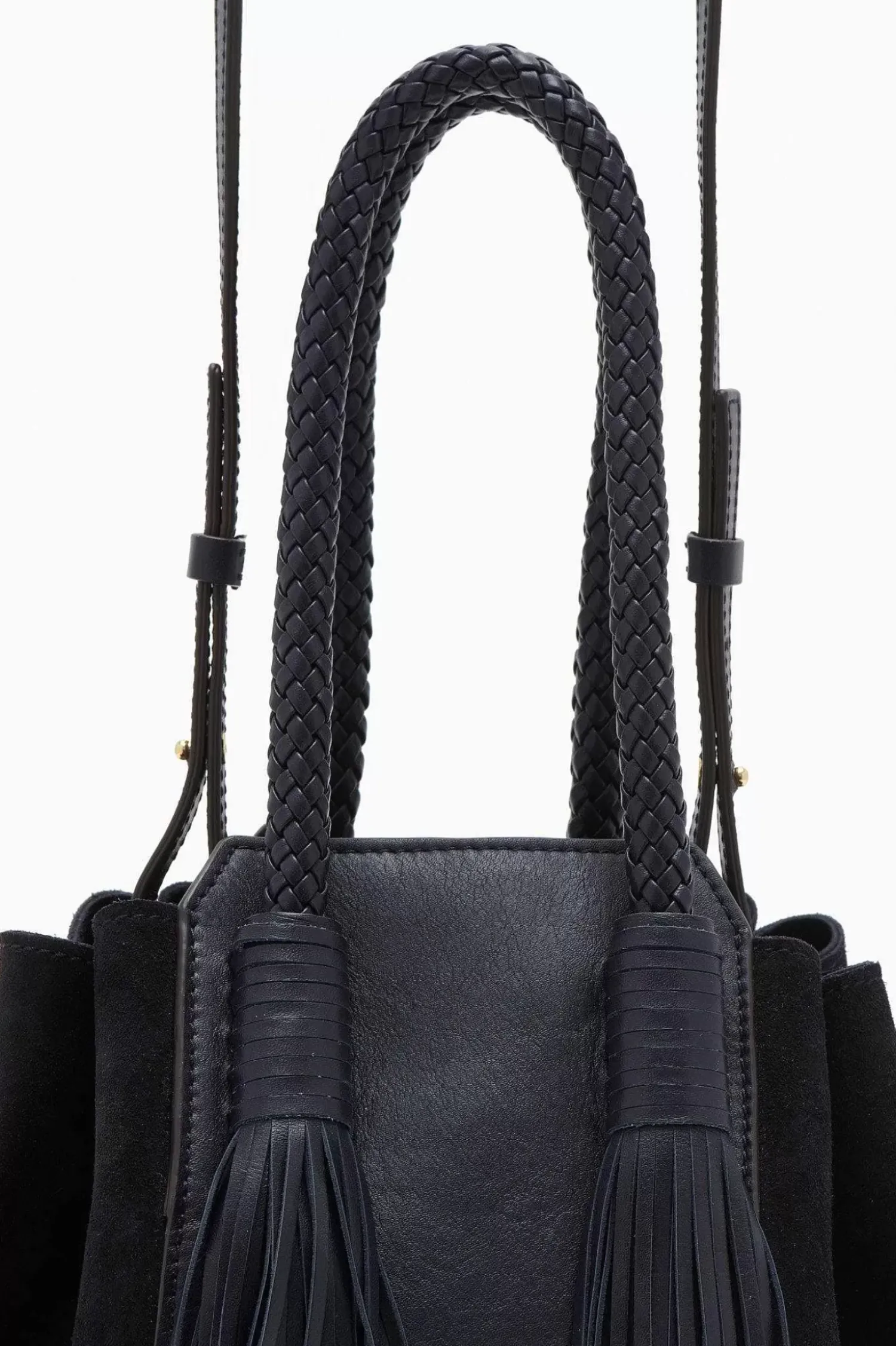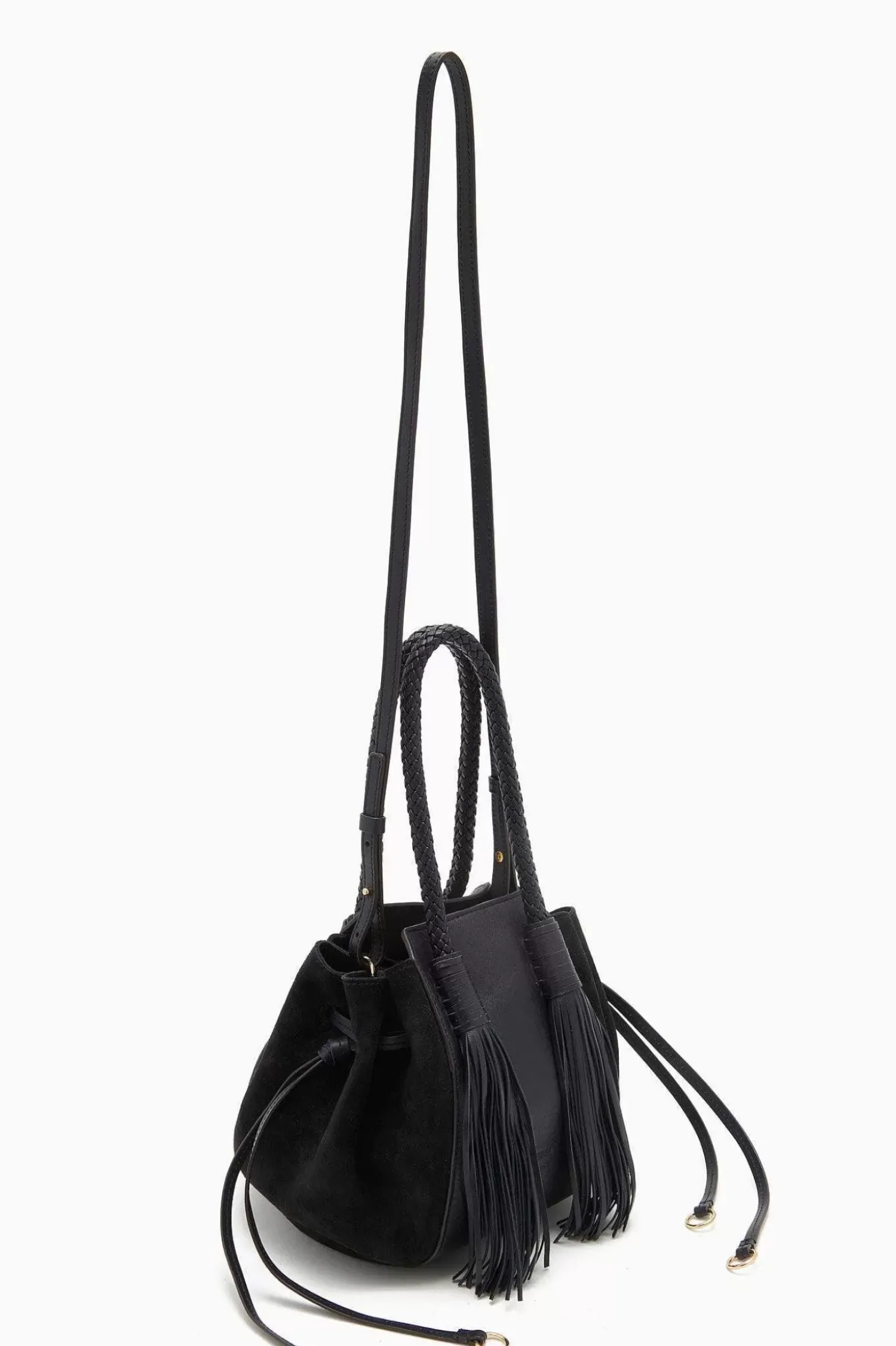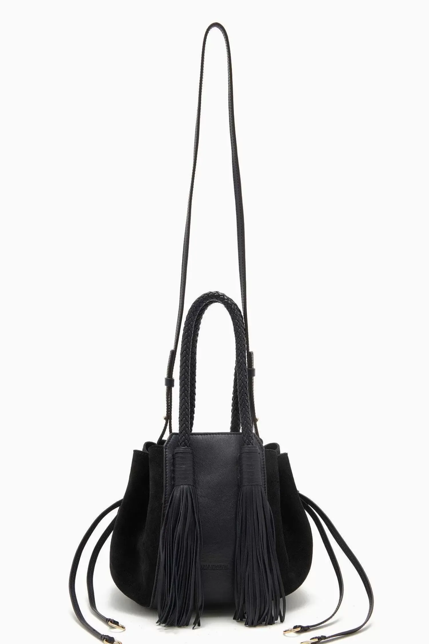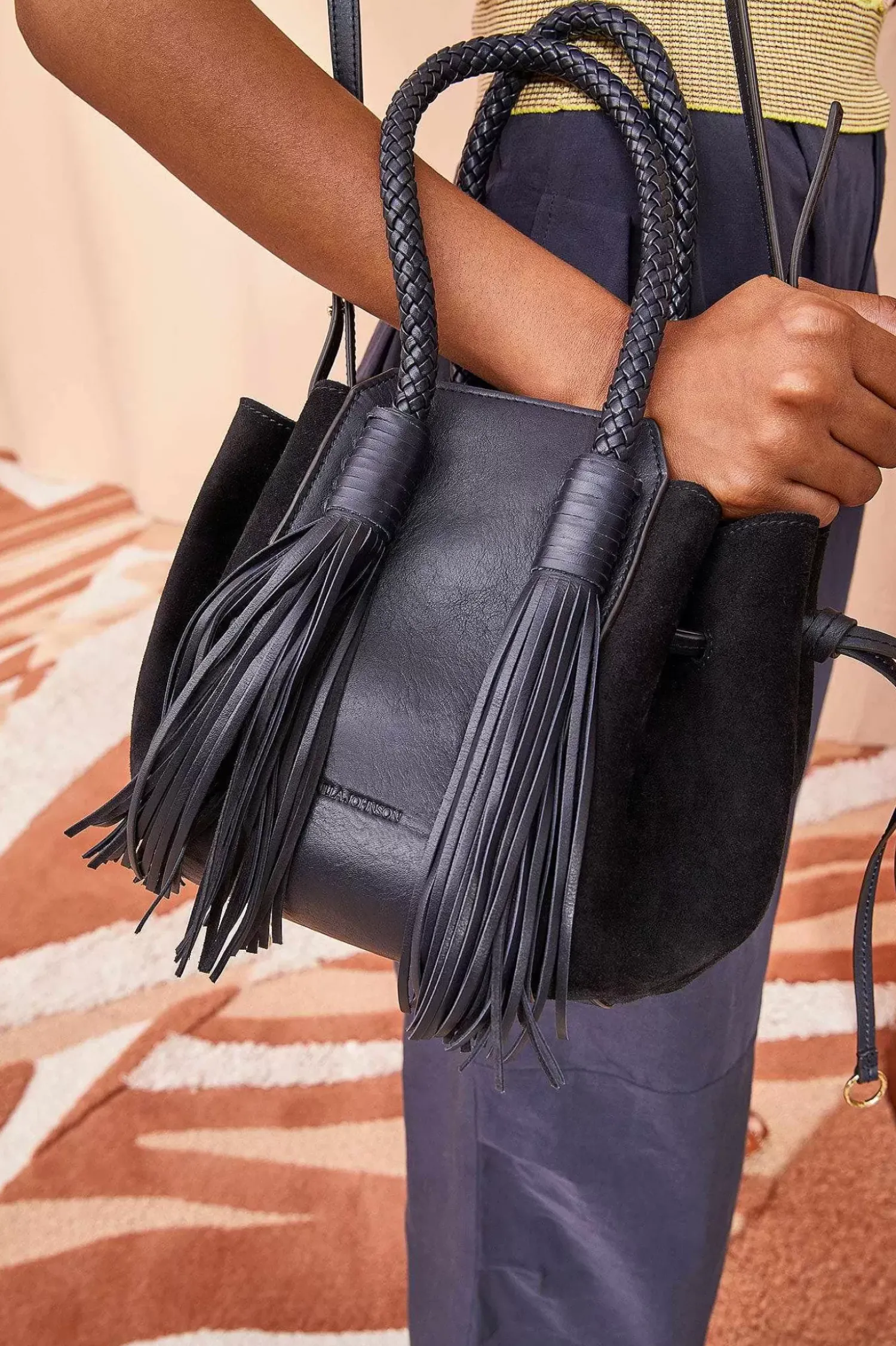 The Gio Bag Is Crafted In Italy From Navy Blue Suede And Soft Leather. This Structured Silhouette Is Defined By Its Two Long Tassel Details. A Removable Convertible Strap Allows Bag To Be Carried As A Handbag Or Across The Body. Finished With Antique Brass Detailing.