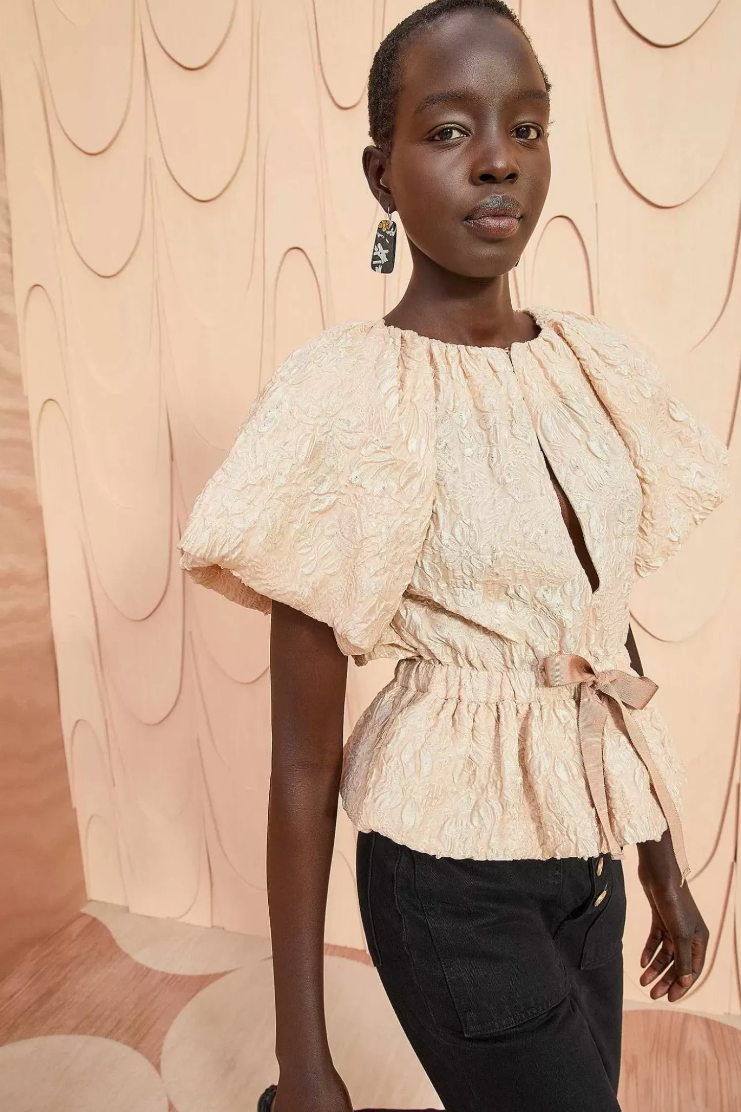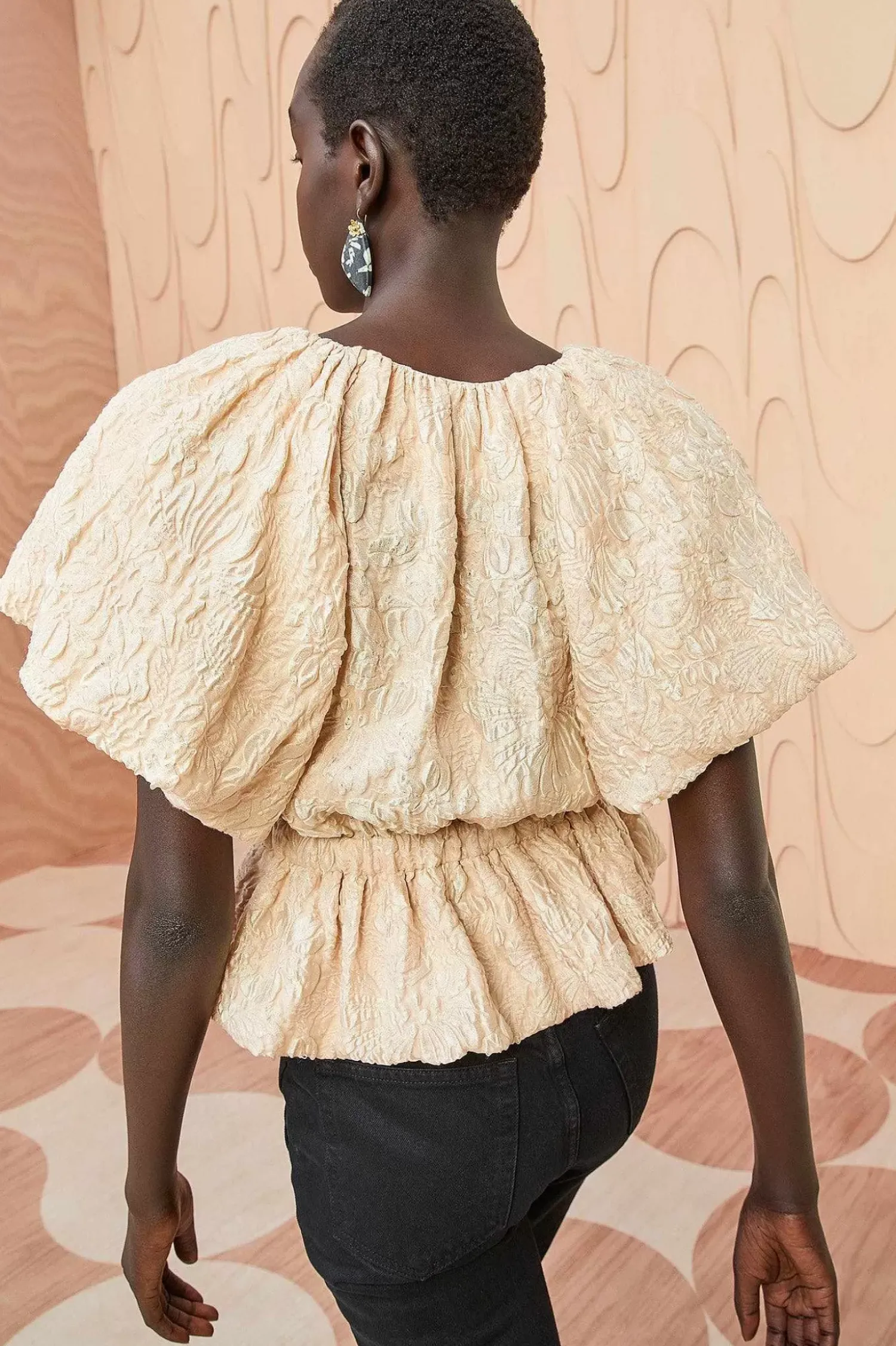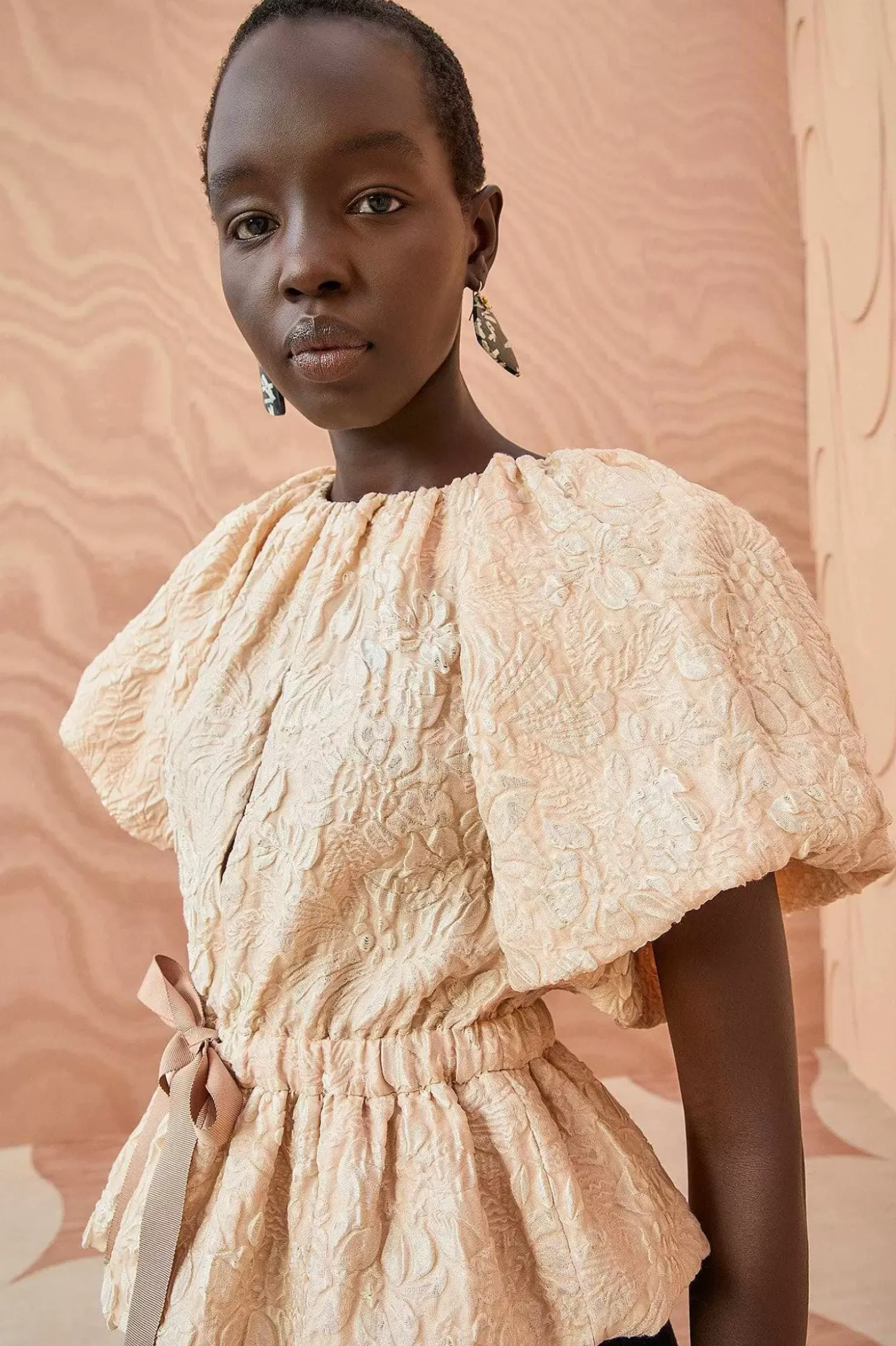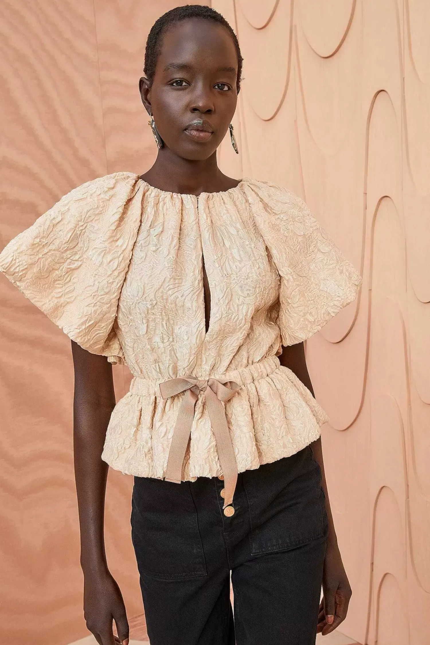 The Mirabelle Top Is Made From Our Standout Cloque Jacquard With A Gorgeous Moon Flower Motif. This Soft Pink Top Features Statement Puff Short Sleeves, A Concealed Button Closure With A Playful Keyhole, And A Grosgrain Waist Ribbon That Creates A Lovely Peplum Hem.