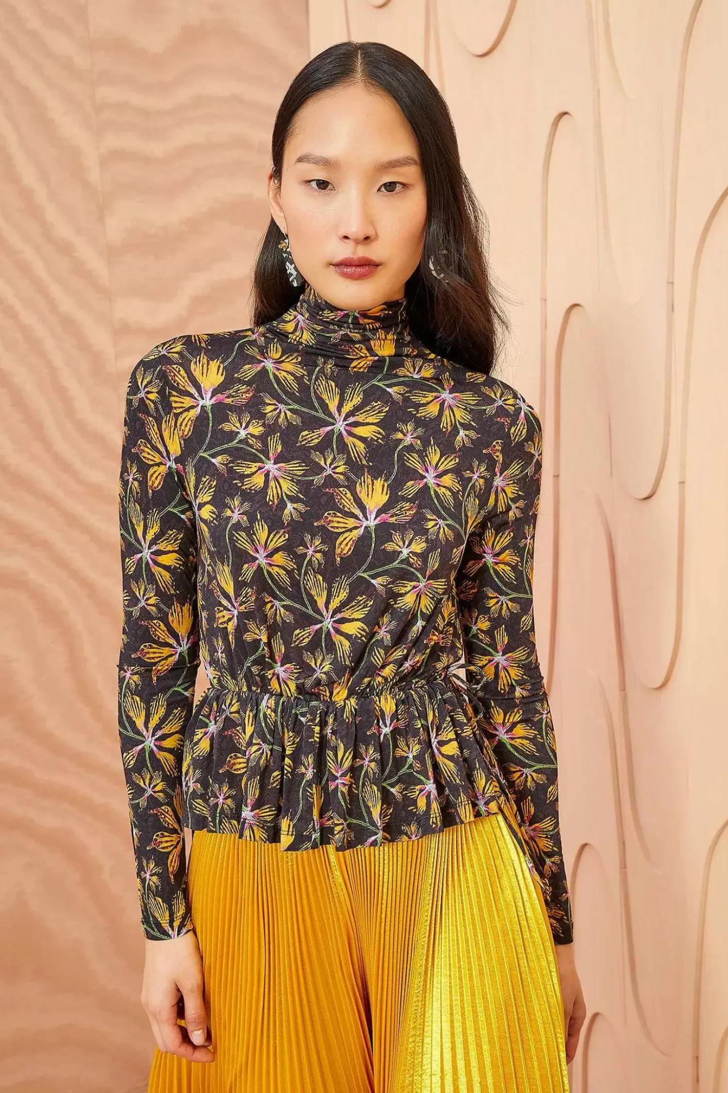 As Featured In Look 30 Of Our Autumn/Winter ’23 Runway Show, The Nina Top Is Made From Our Silken Draped Tricot Jersey And Printed In This Season’S Favorite Graphic Florals With Pops Of Yellow And Pink. This Lightweight Long-Sleeve Top Features A Ruched Waistband With Drawstring Ties And A Peplum Hem.