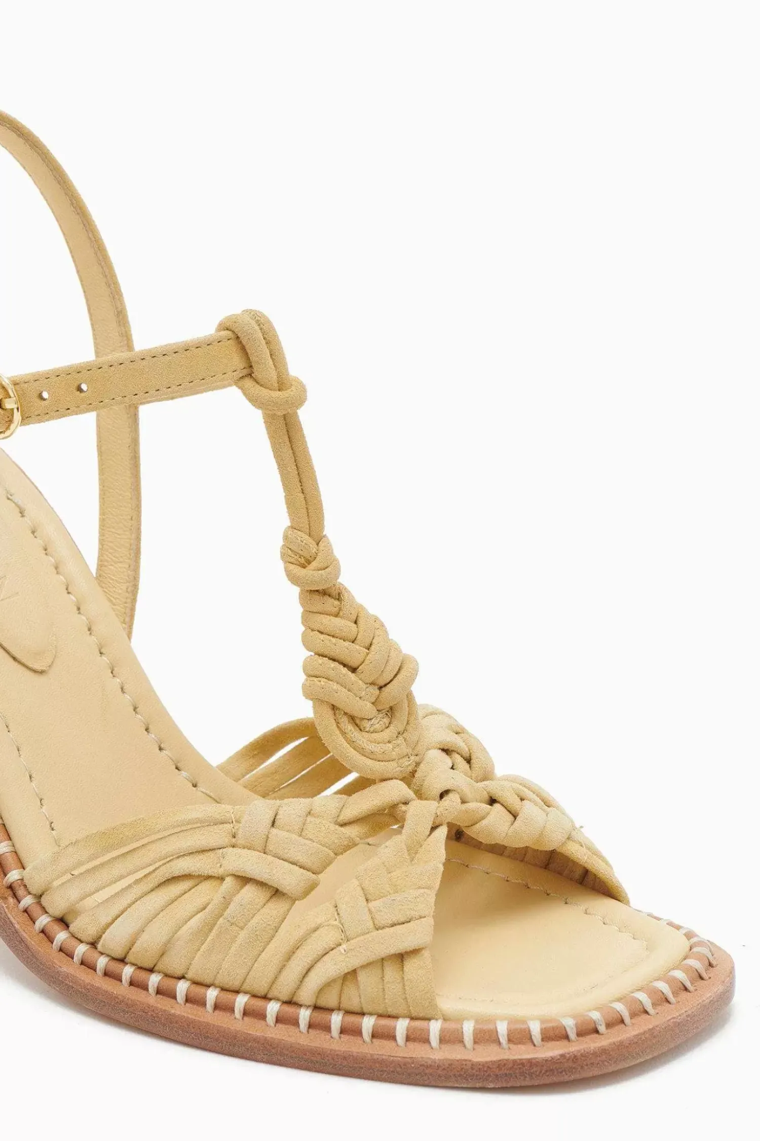 The Penina Macrame Braided High Heel Is Made Of Yellow Leather And Features Soft Braided Suede That Creates A Delicate Macrame-Inspired Design. This Open-Toed Silhouette Is Elegantly Elevated By A Stacked Cylinder Heel And Finished With A Shiny Brass Buckle.