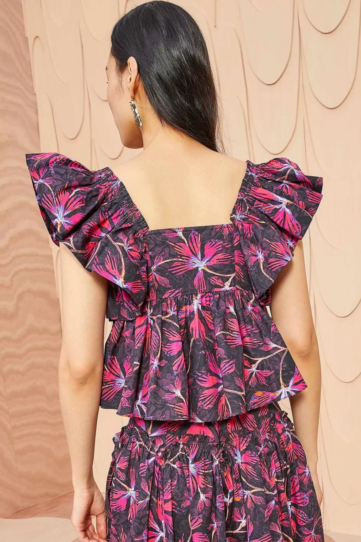 The Romi Top Is Crafted From Our Moonflower Printed Poplin With Vivacious Magenta And Hyacinth Hues On Solid Black. This Flutter Sleeve Top Has A Sweetheart Neckline, An Elegant Empire Waist, And Is The Perfect Companion To Our Handmade Denim.