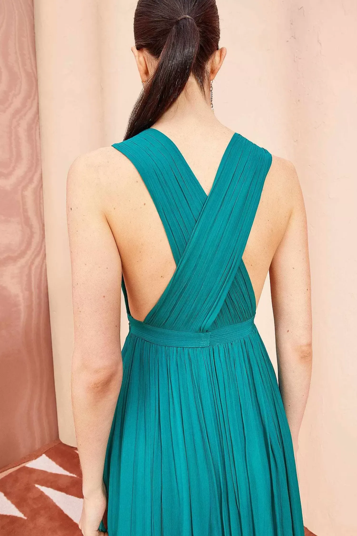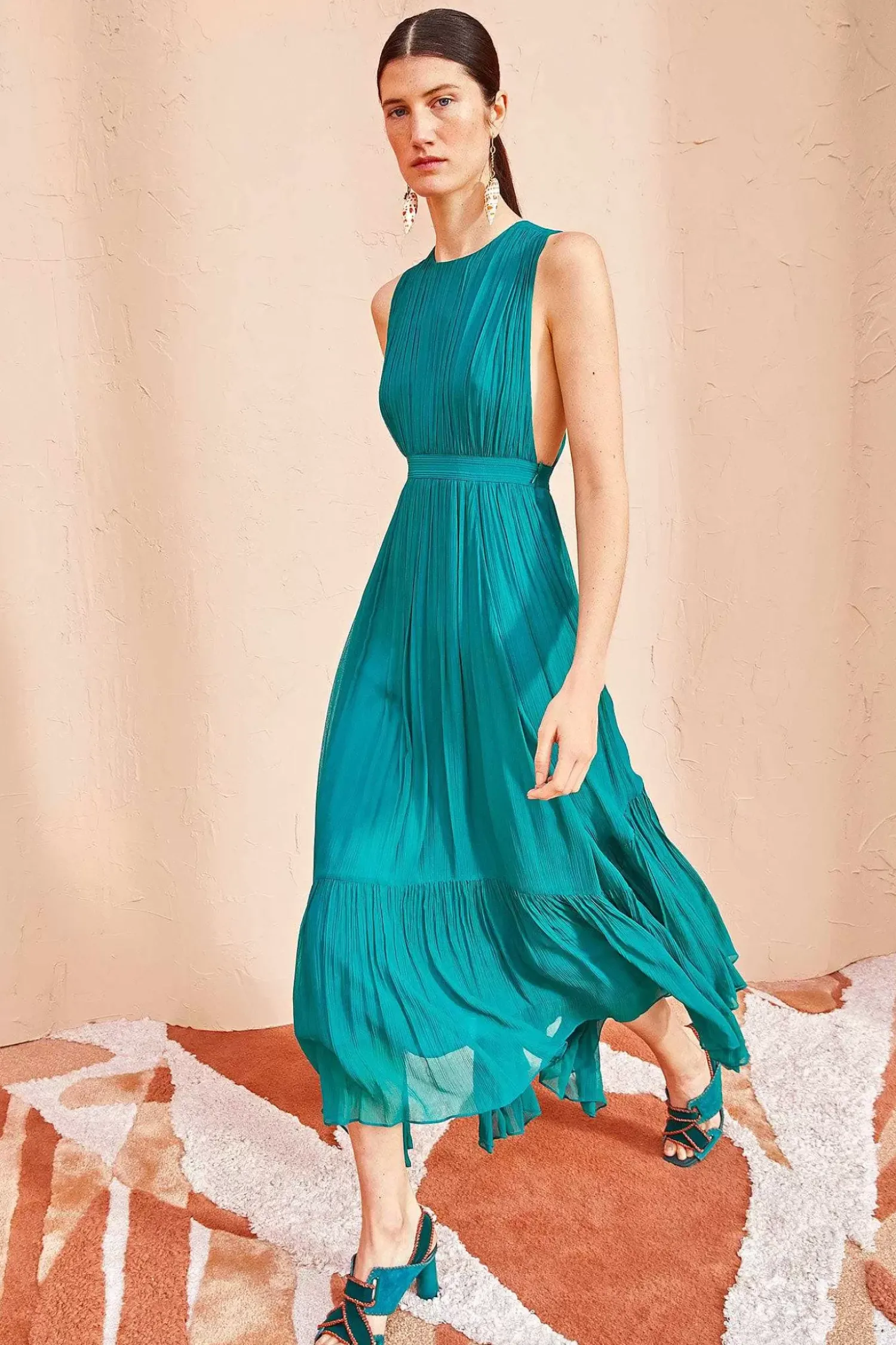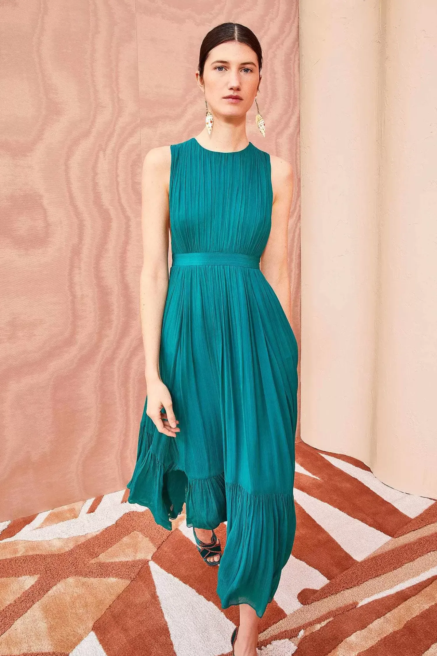 The Sarai Dress Is Cut In A Stunning Teal Diaphanous Silk Chiffon. This Flowing Dress Has A Handkerchief Midi-Length Hemline, A Fixed Waist And A Criss-Cross Back. It Is Finished With A Side-Seam Zipper.