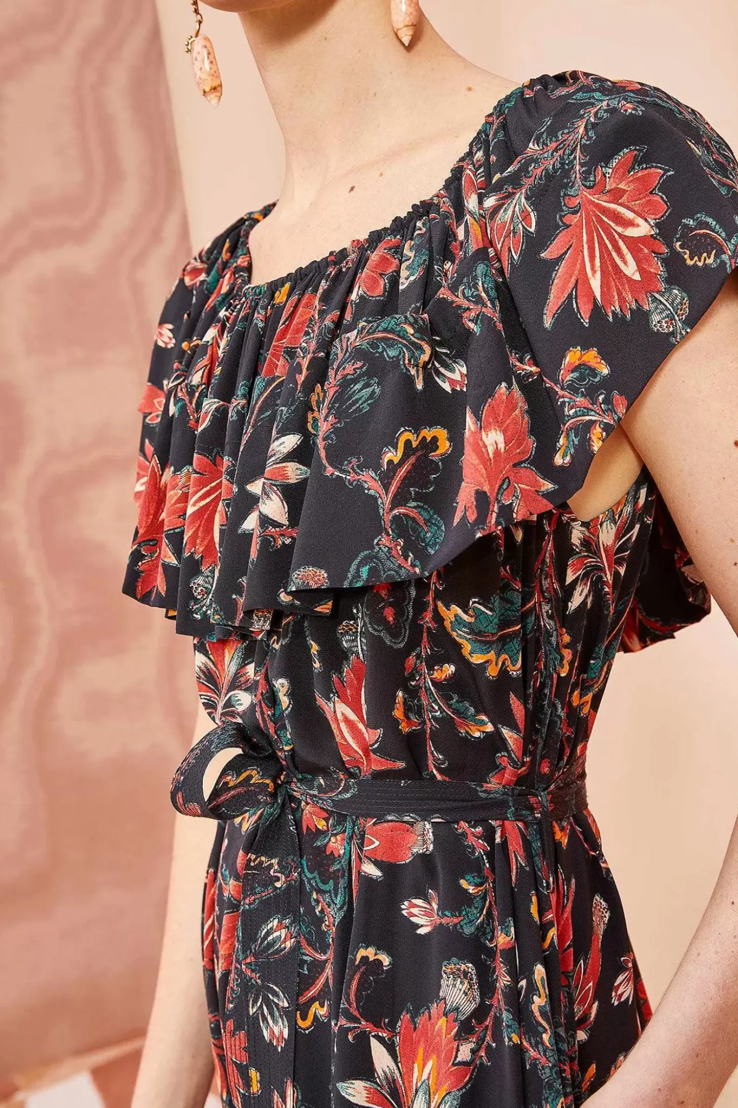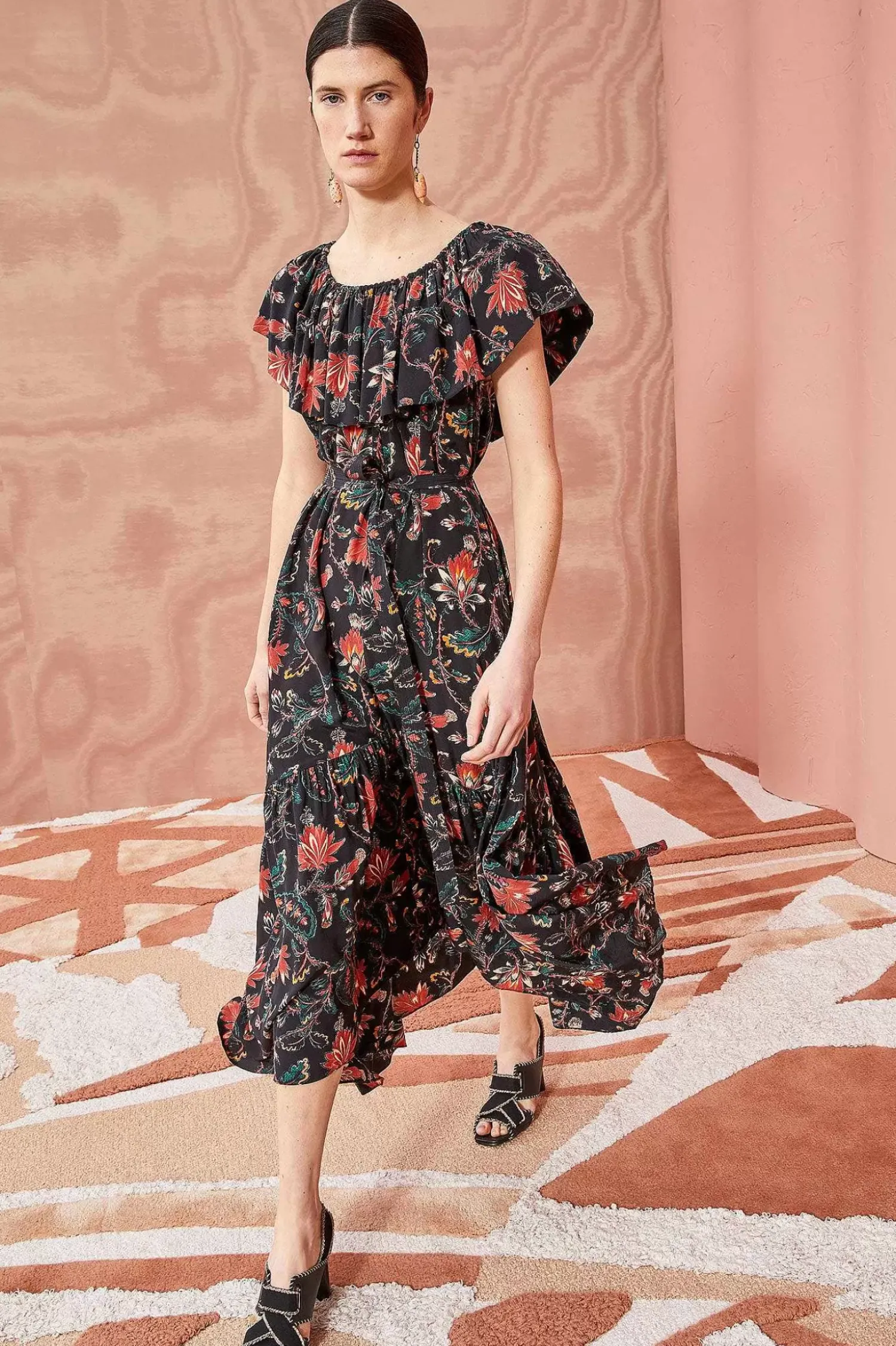 The Skye Dress Is Crafted From Our Signature Crepe De Chine Featuring A Floral Print With A Black Base That Pops With Hints Of Crimson And Green. This Maxi Dress Is Defined By Its Exaggerated Ruffle Along The Neck, A Full Tiered Skirt, A Functional Tie At The Waistband And Side-Seam Pockets. This Romantic, Summery Silhouette Can Be Worn On Or Off The Shoulder.