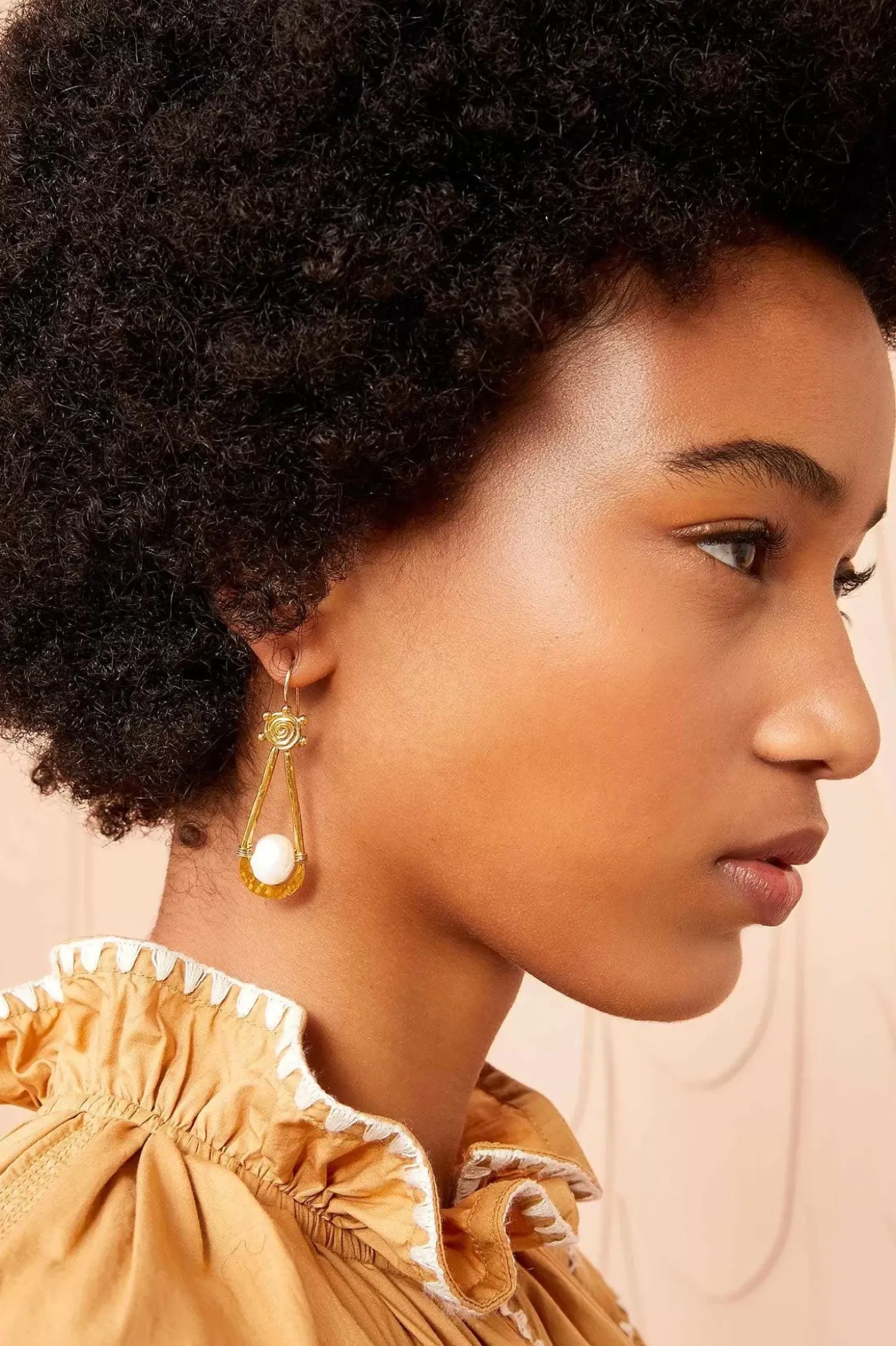 The Spiral Drop Stone Earring Is Hand-Hammered From Recycled Brass With A Spiral Motif Inspired By Ancient Craft Techniques And Is Strewn With A Luminous Freshwater Pearl. All Of Our Jewelry Is Masterfully Handcrafted By Our Long-Term Artisan Partners In Nairobi, Kenya, So Each One Is Unique. It Fastens With A Gold Wire Hook.