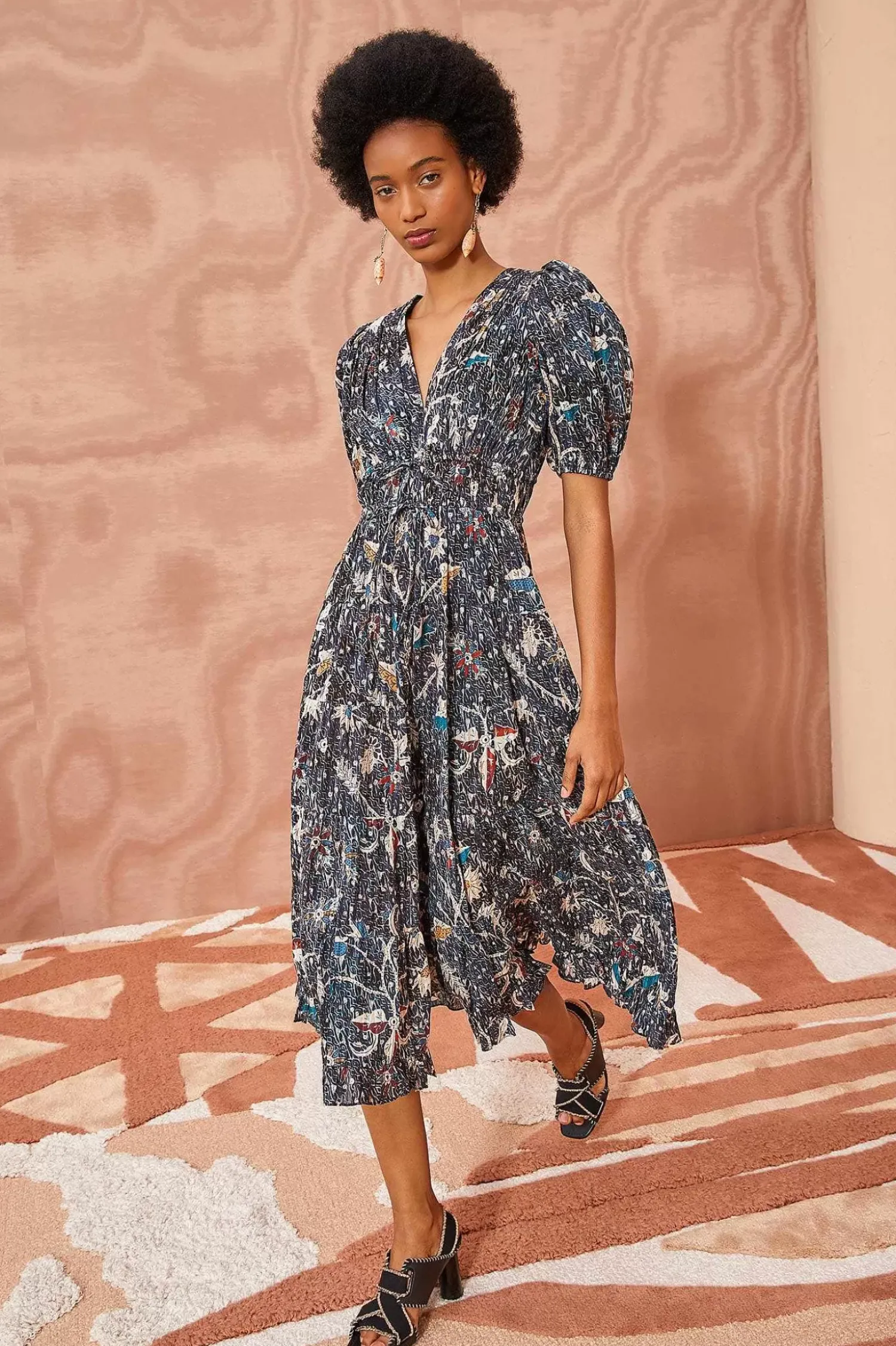 The Thelma Dress Is An Effortless Silhouette Crafted In Our Signature Shadow Stripe Cotton. This Graphic Midi Dress Features A Blue And Grey Batik-Inspired Print, And Is Defined By Puff Sleeves, And A Ruched Bodice With Two Drawstring Ties At The Fitted Waist. Finished With Side-Seam Pockets.