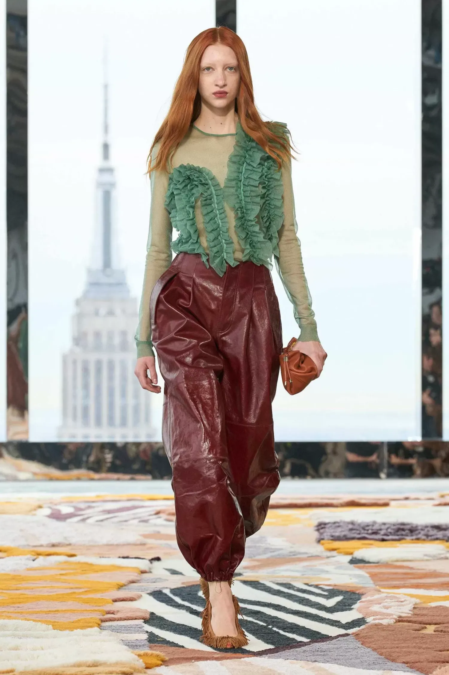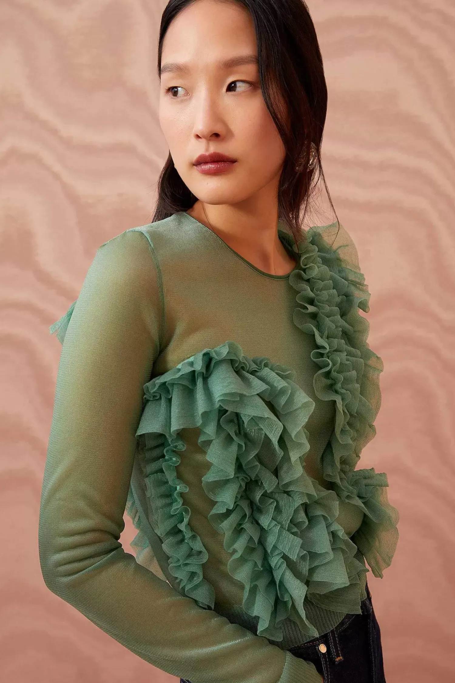 As Featured In Look 6 Of Our Autumn/Winter ’23 Runway Show, The Theodora Pullover Is A Sheer Knit That’S Adorned With An Explosion Of Fluttering Frills Across The Bodice. This Jade Green Gossamer Top Features A Crewneck, Long Sleeves, And Is Finished With Ribbed Trims.