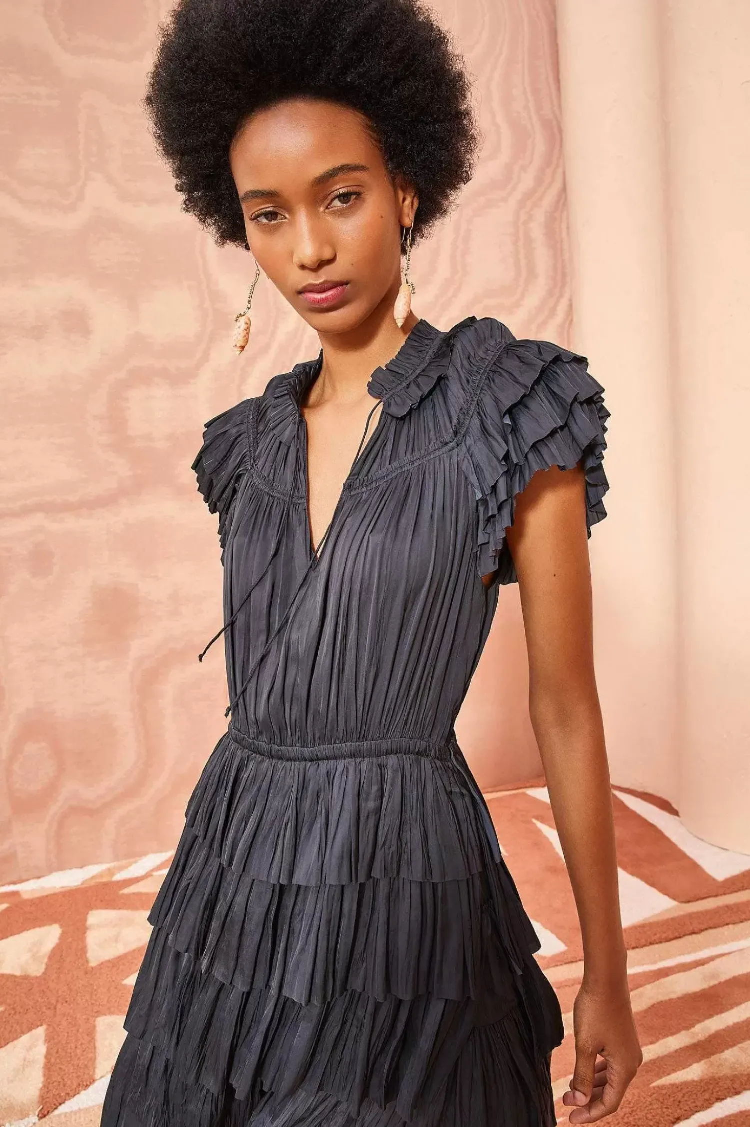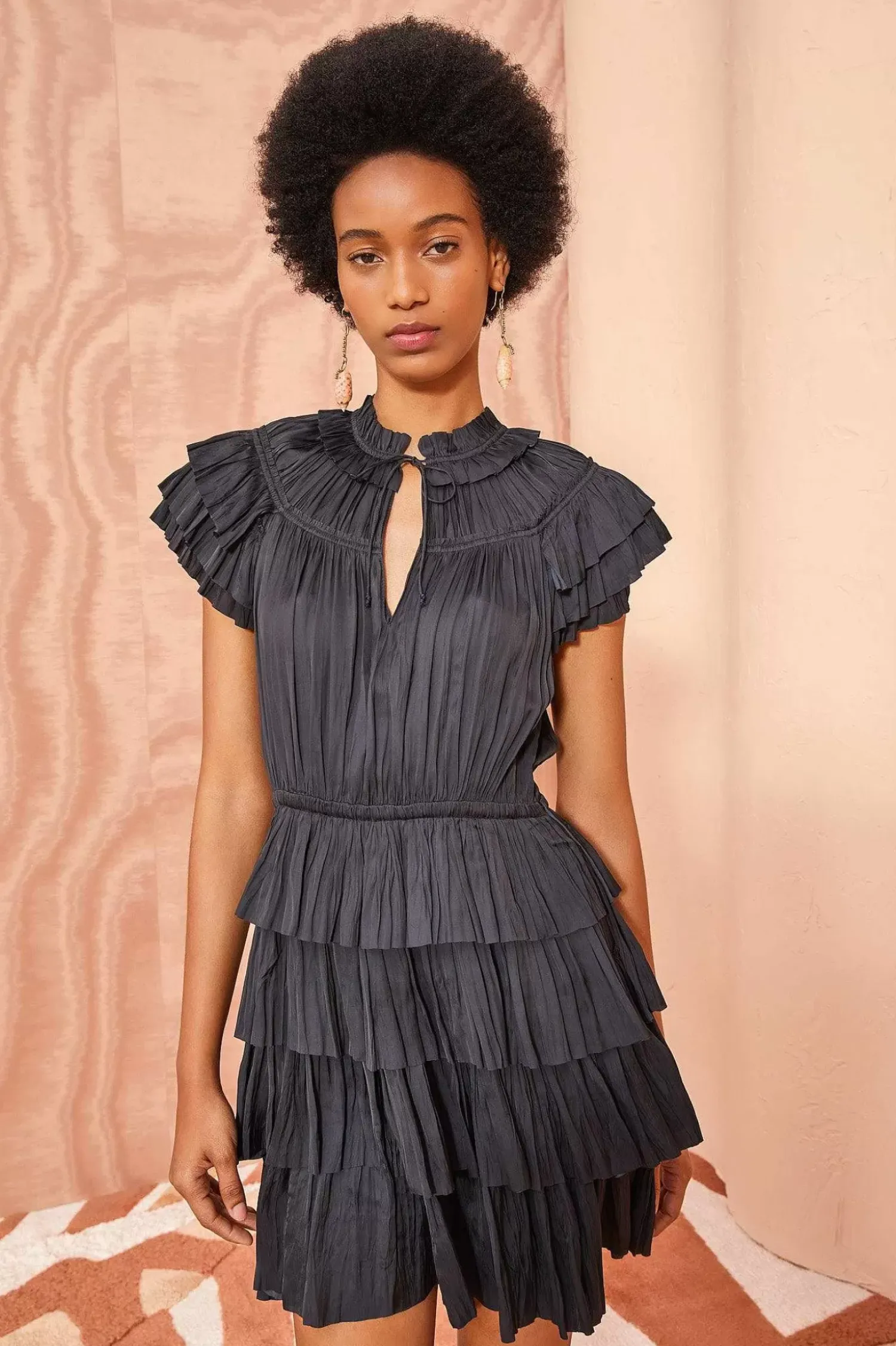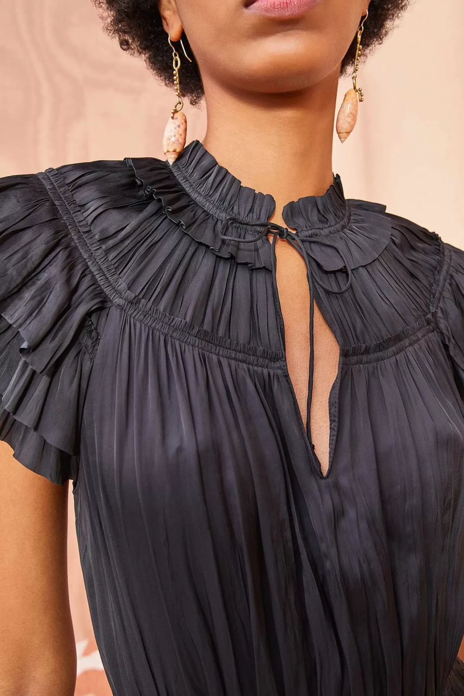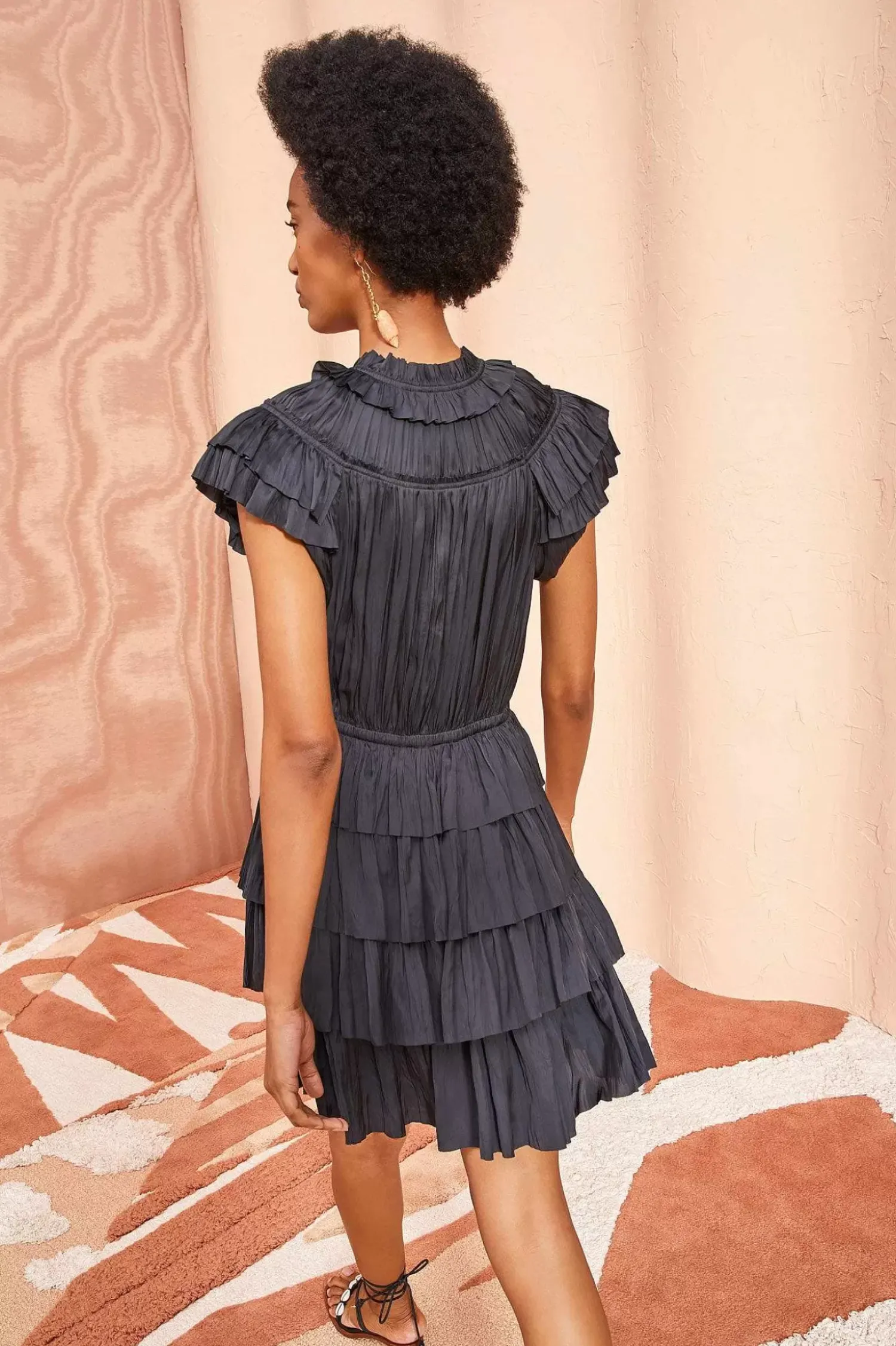The Vesna Dress Is A Short-Sleeved Black Mini Dress Crafted From Our Signature Crushed Plissé Satin. This Perfect Party Dress Is Defined By Ruffled Layers That Adorn The Sleeves And Skirt, Which Is Mirrored By A Gorgeous Ruffle Detail At The Neck That Is Completed With A Delicate Tie. Finished With A Side-Seam Zipper.