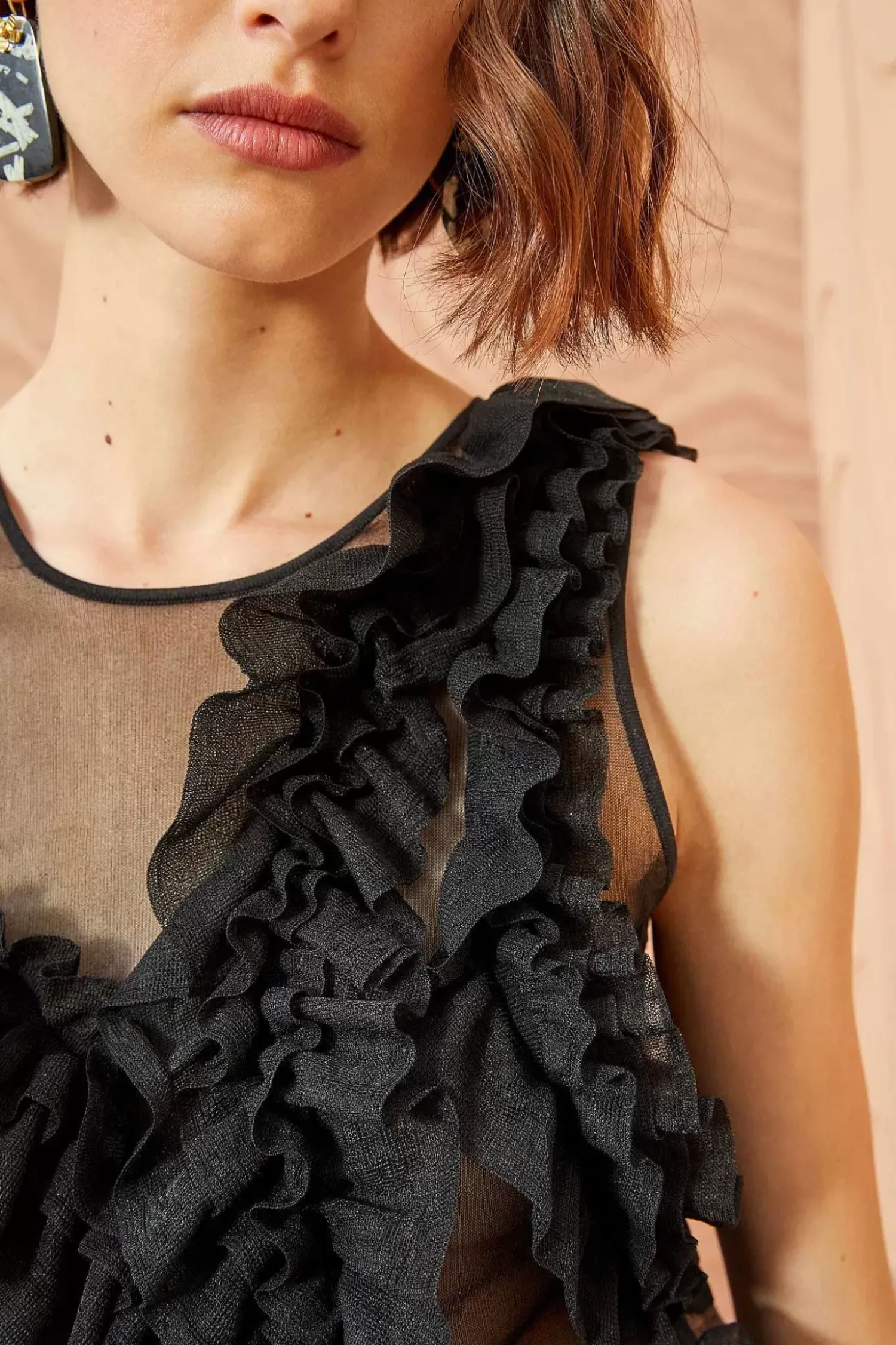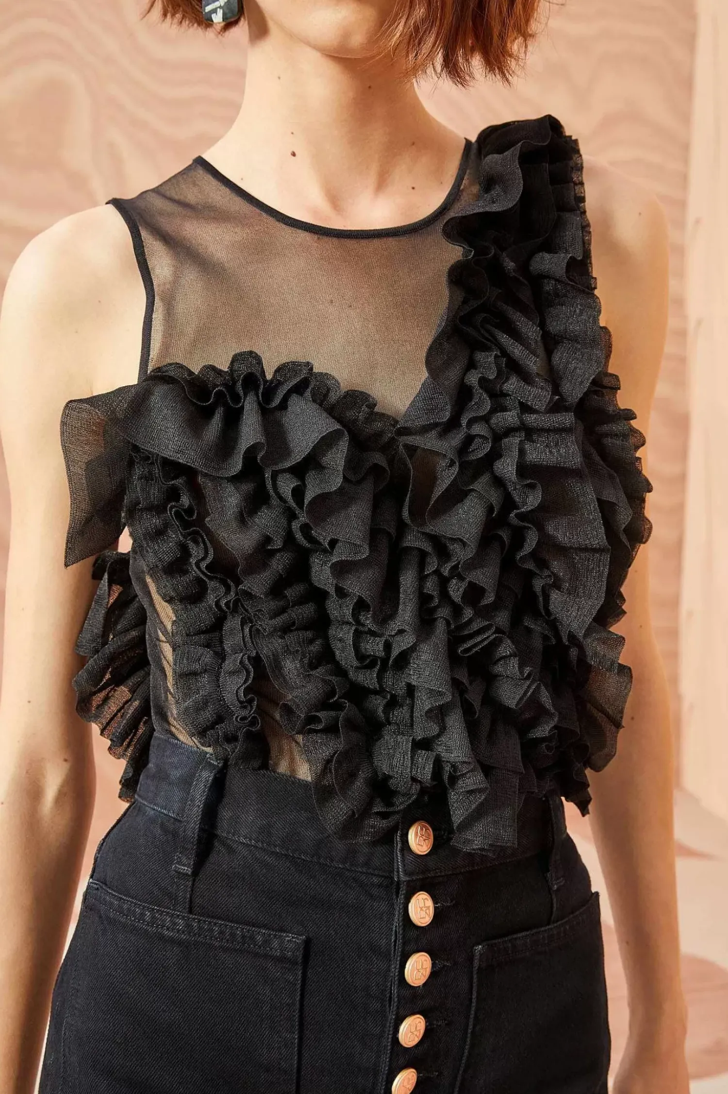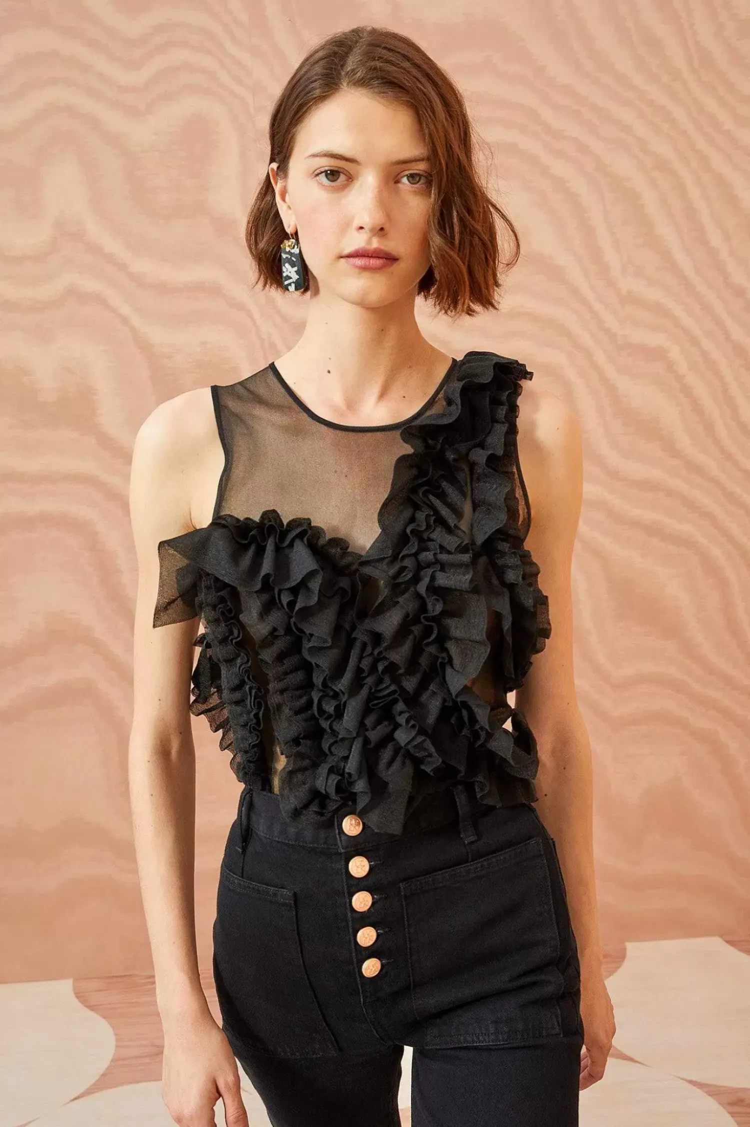 As Featured In Look 38 Of Our Autumn/Winter ’23 Runway Show, The Winnifred Top Is Made From Our Translucent Frills Knit, A Sheer Top Adorned With A Strategically Placed Explosion Of Fluttering Frills Across The Bodice. Pair This Black Sleeveless Top With The Sarafina Skirt For The Full Look.