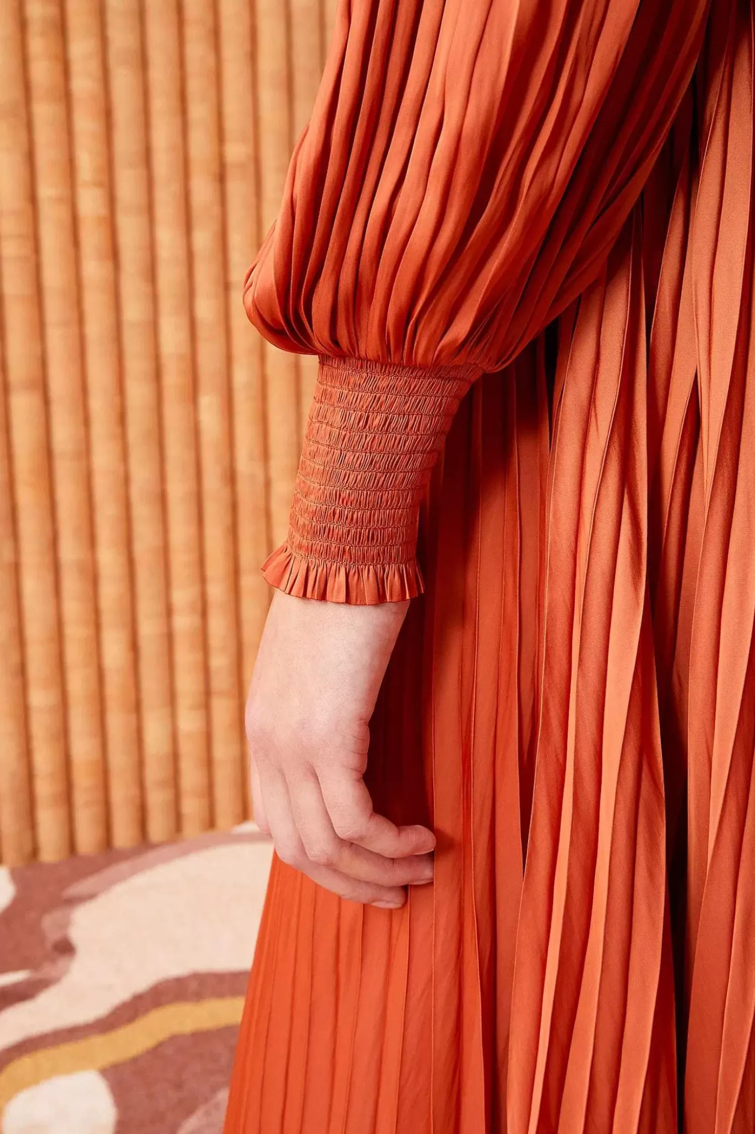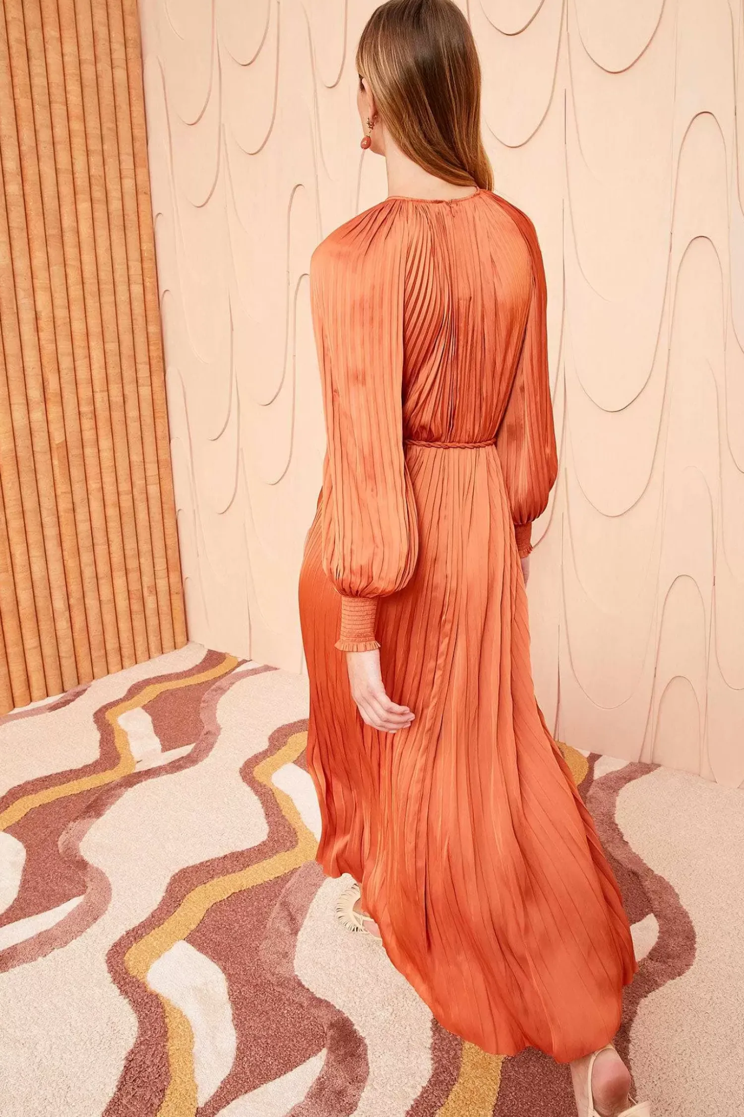 Crafted From Our Signature Plisse Satin, The Zora Dress Is A Pleated Beauty In A Gorgeous Earthy Orange. This Long-Sleeve Dress Features A Voluminous Midi Silhouette That You Can Temper With The Braided Belt And Has Smocked Cuffs. It Is Finished With A Center-Back Keyhole Button Closure.