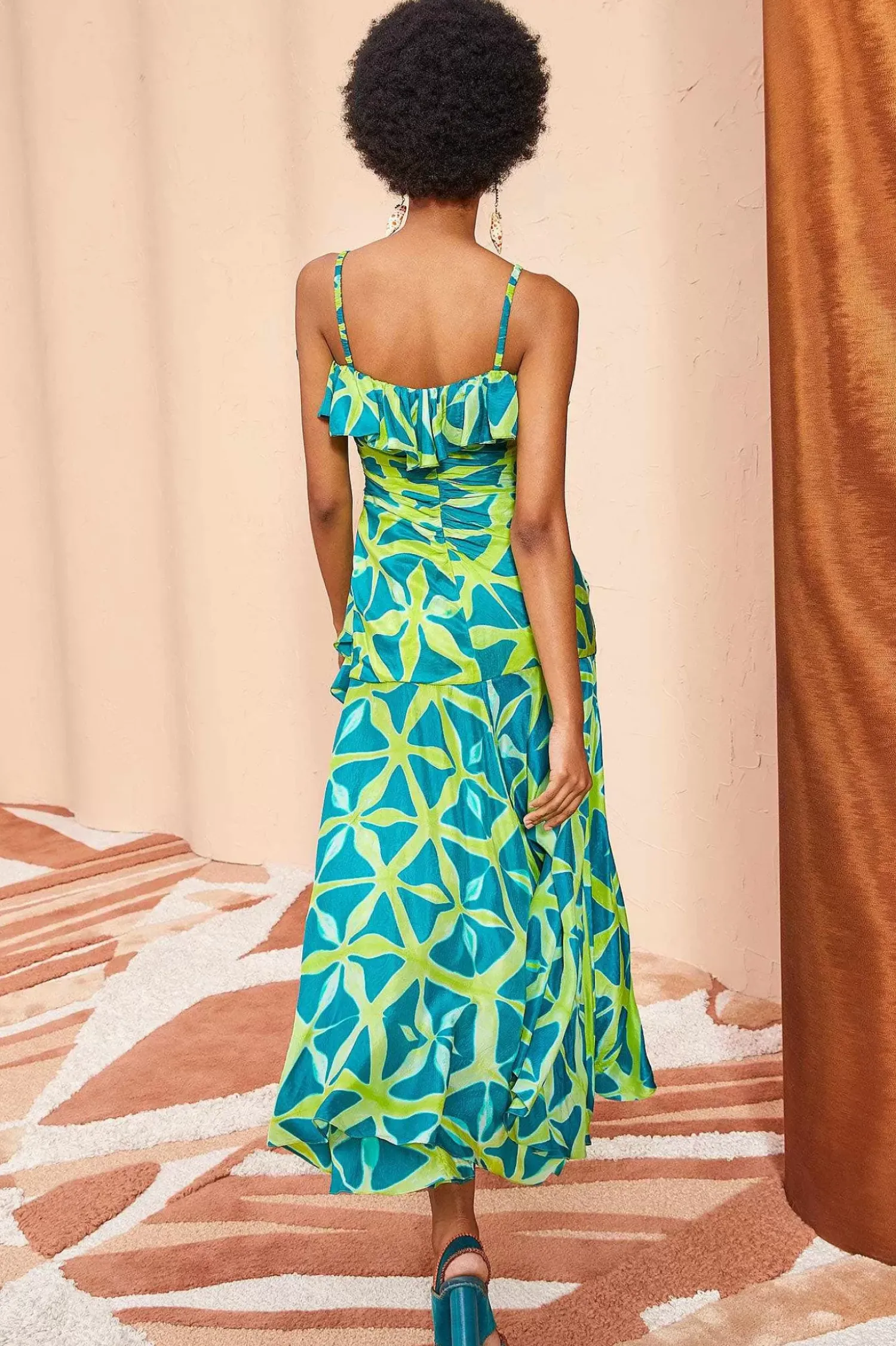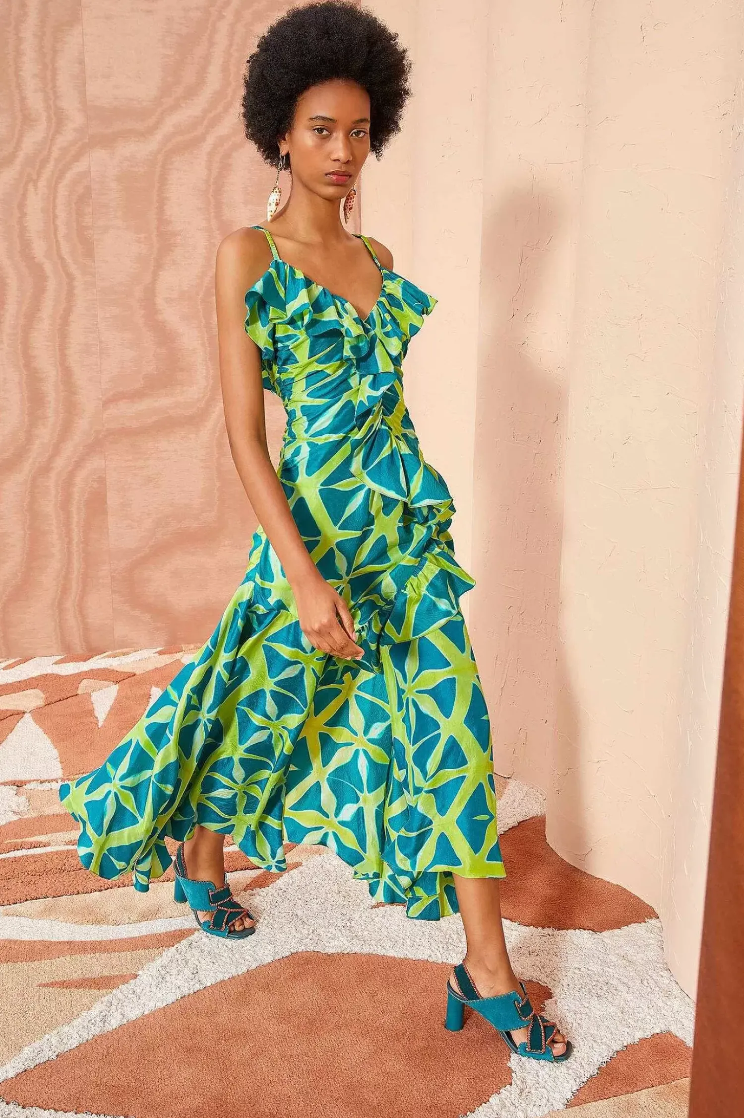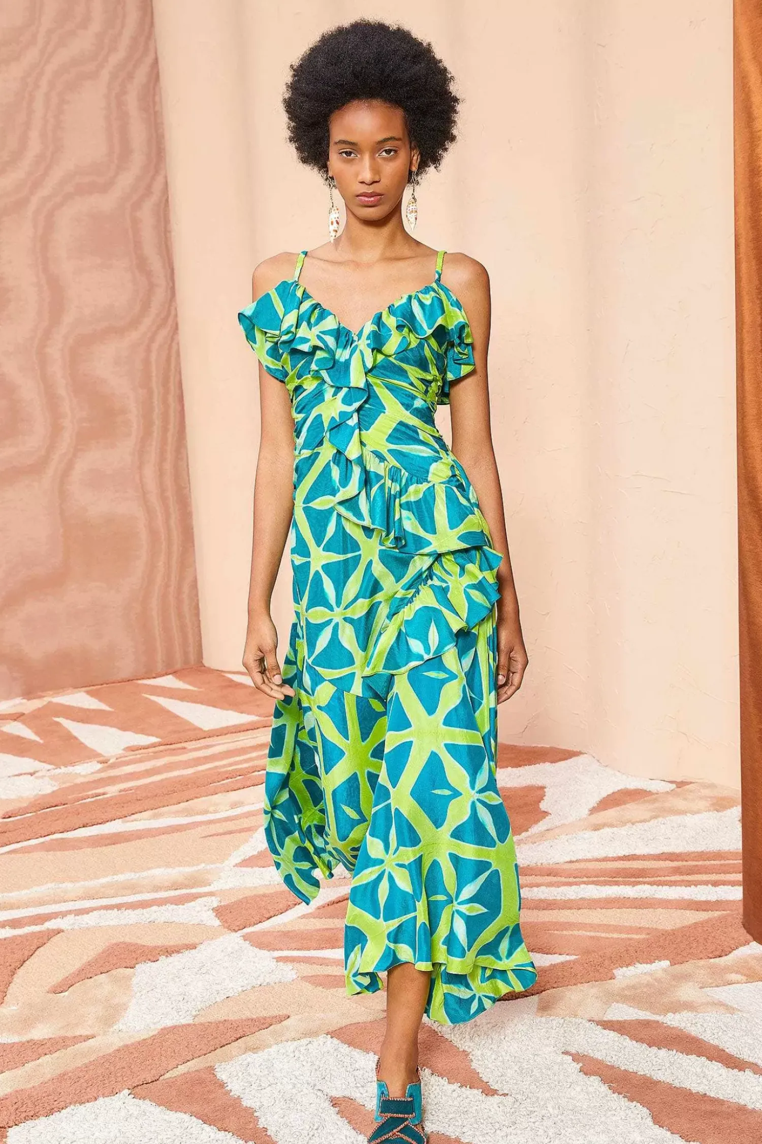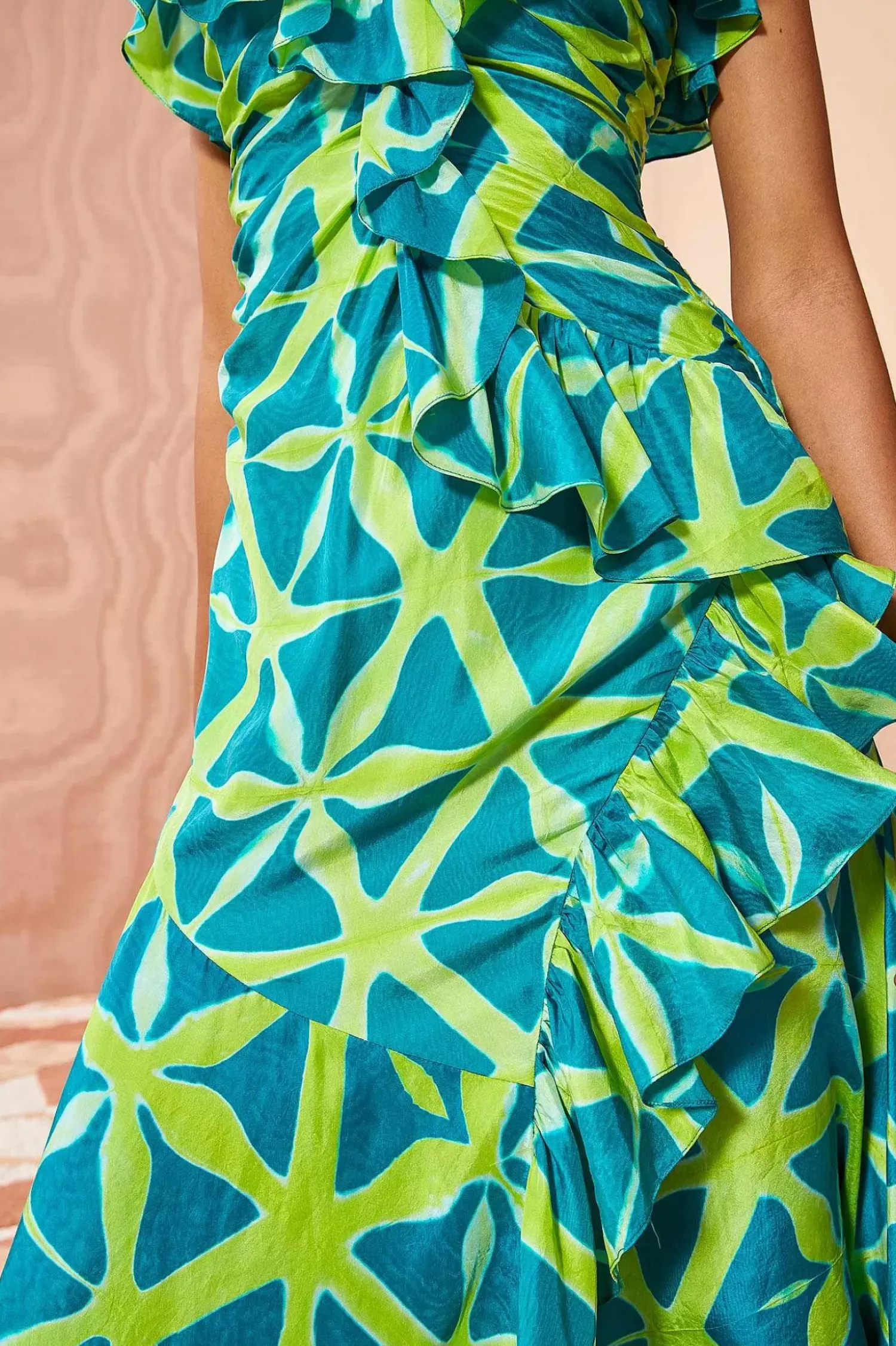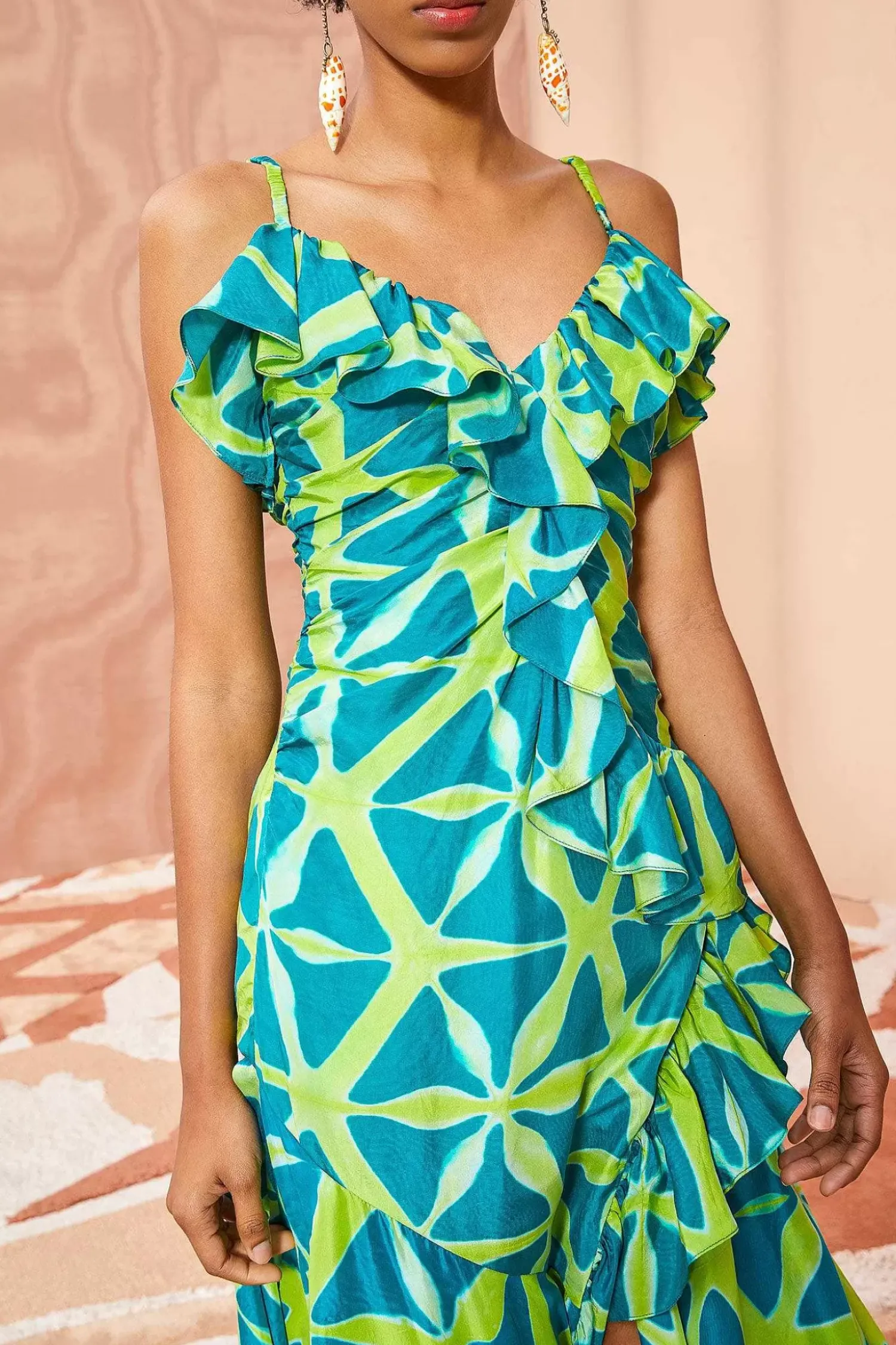 As Featured In Look 34 Of Our Pre-Fall ’23 Lookbook, The Zoya Dress Is Handcrafted By A Collective Of Women In Bangalore Using An Intricate Technique Known As Clamp Dyeing That Creates Beautifully Prismatic Patterns In Vibrant Blue And Green Hues. No Two Pieces Are Alike. This Exquisite Midi Dress Has A Ruched Bodice Detailed With Ruffles Along The Neckline That Cascade Into The Skirt. It Is Finished With A Side-Seam Zipper Closure.