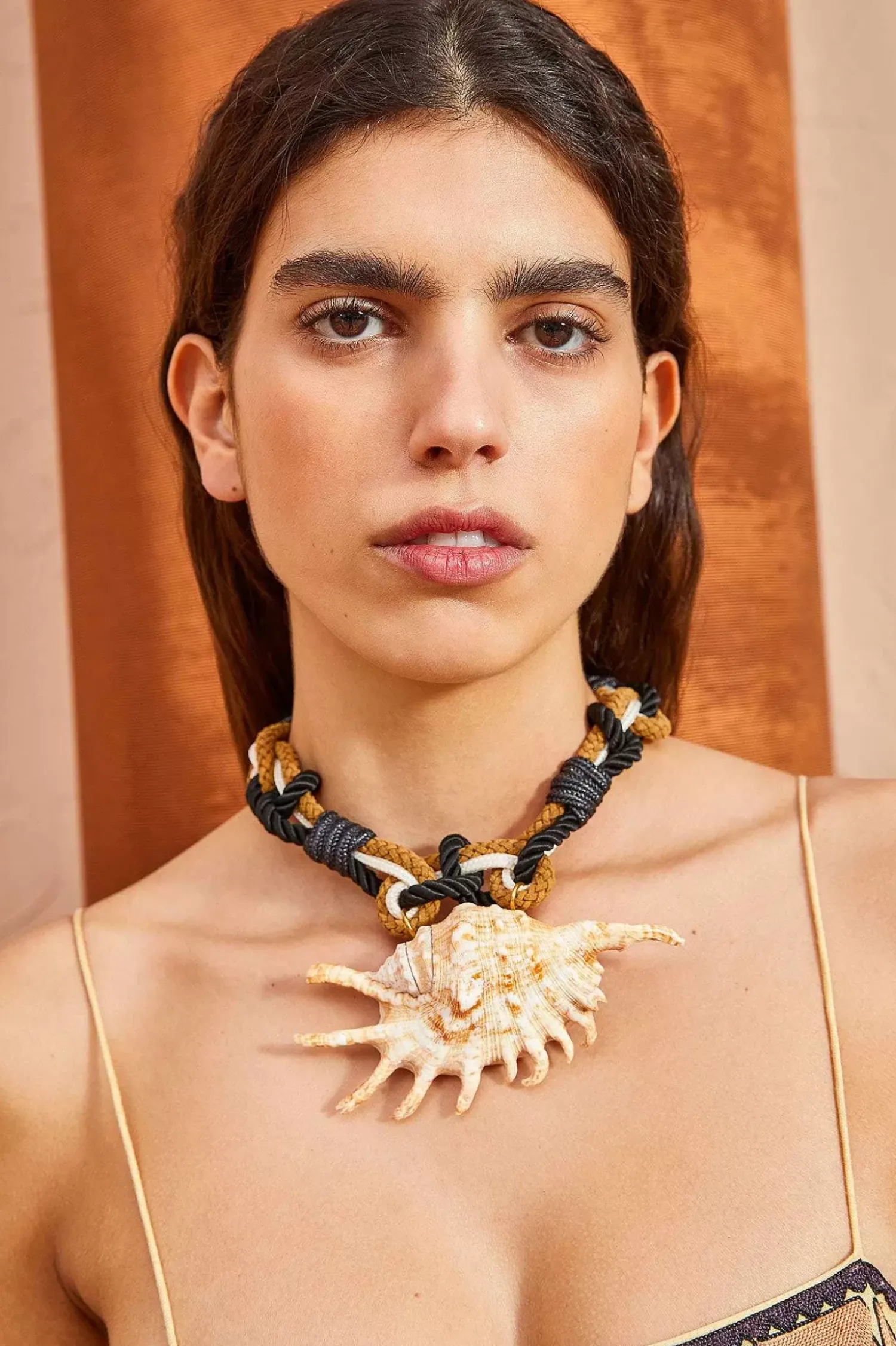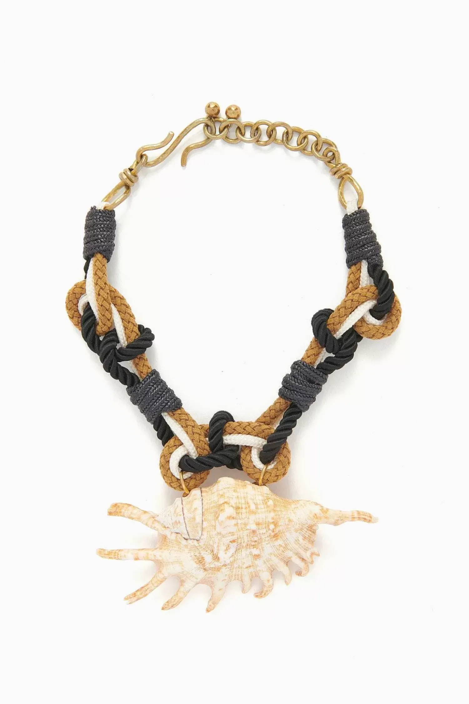 As Featured In Look 22 Of Our Pre-Fall Lookbook, The Hand Macrame Rope And Shell Necklace Is A Stunning Addition To Our Jewelry Collection. Crafted From Hand-Hammered Brass, Multi-Hued Macrame Rope, And A Spider Shell Pendant, This Necklace Is A Mesmerizing Statement Piece. It Is Finished With An Adjustable Brass Closure.