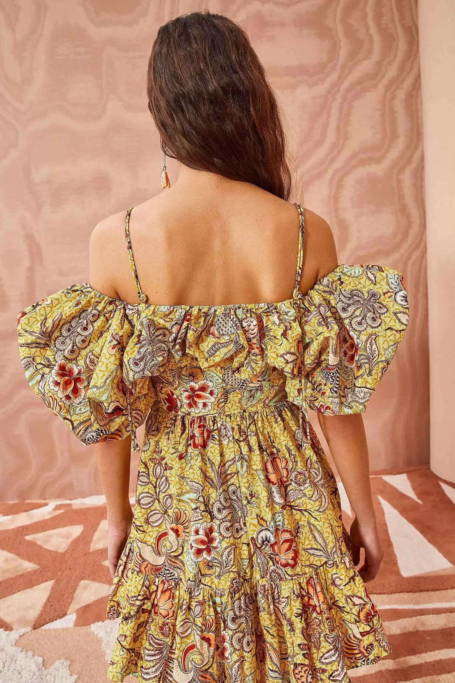 The Lila Dress Is Cut In Our Wild Hibiscus Poplin Print, A Bold Floral Boasting Lively Yellow And Red Hues. This Off-The-Shoulder Minidress Features A Corset-Style Bodice Layered Underneath A Poufed Ruffle That Runs Along Each Shoulder. It Is Finished With Delicate, Adjustable Shoulder Straps, Pockets And A Hidden Side-Seam Zipper.