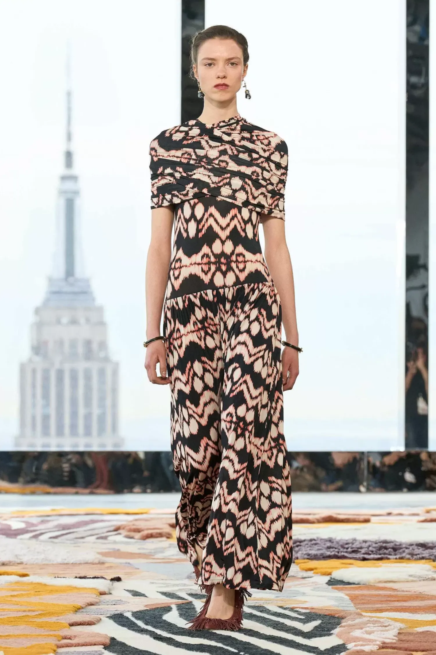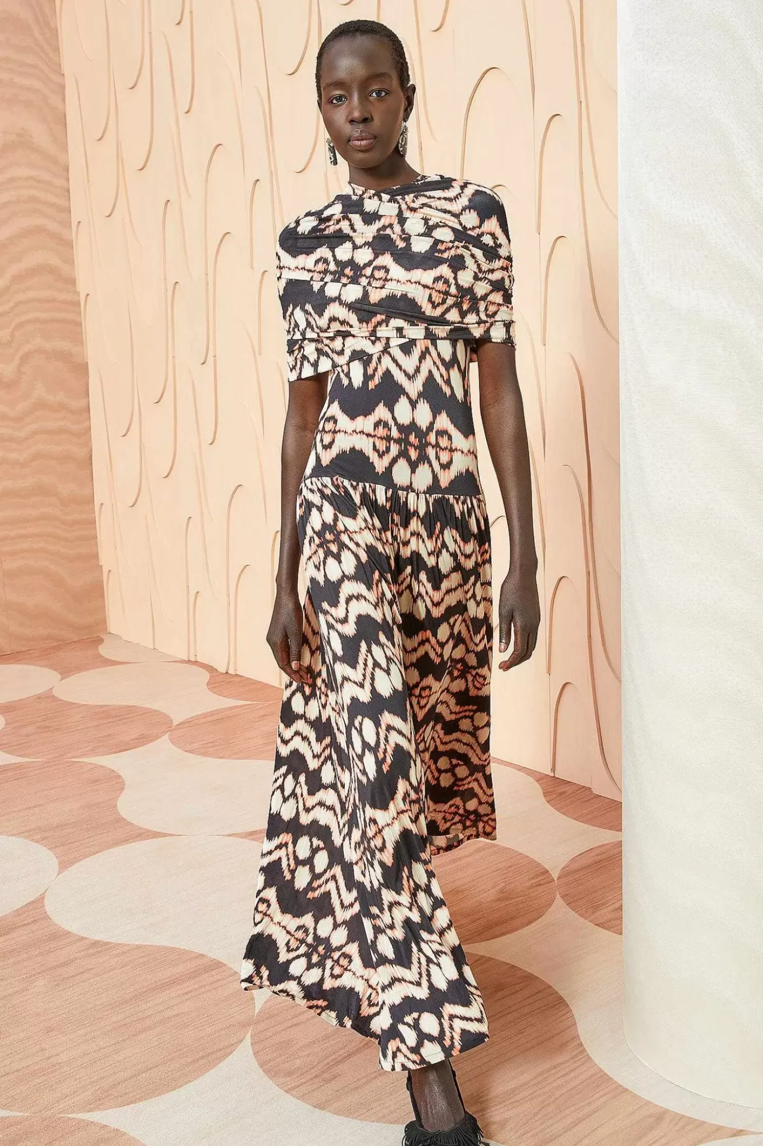 As Featured In Look 43 Of Our Autumn/Winter ’23 Runway Show, The Livia Dress Is Cut From Our Silken Draped Tricot Jersey In A Graphic Ikat-Inspired Cream And Black Pattern. The Bodice Is Inspired By Grecian Sculptures, Made With An Exaggerated Ruched Overlay Which Comes Down Each Arm. It Is Finished With A Gathered Maxi-Length Skirt.