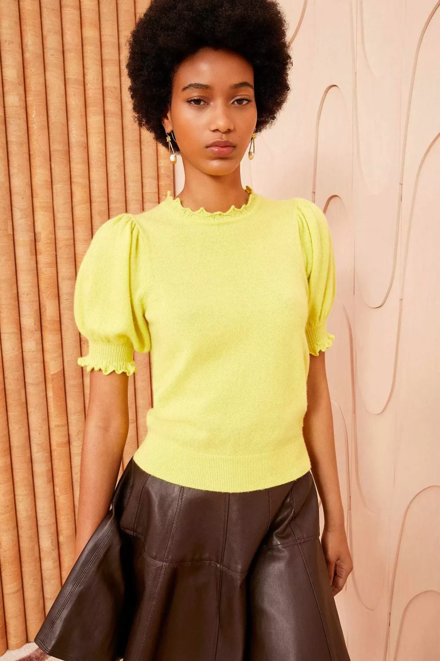 Our Lotta Top Is Spun From Luxurious Cashmere In A Classic Silhouette, Making It A Forever Staple. This Delightful Bright Yellow Top Has Puff Short Sleeves And Is Finished With Pointelle Ruffles At The Collar And Cuffs.