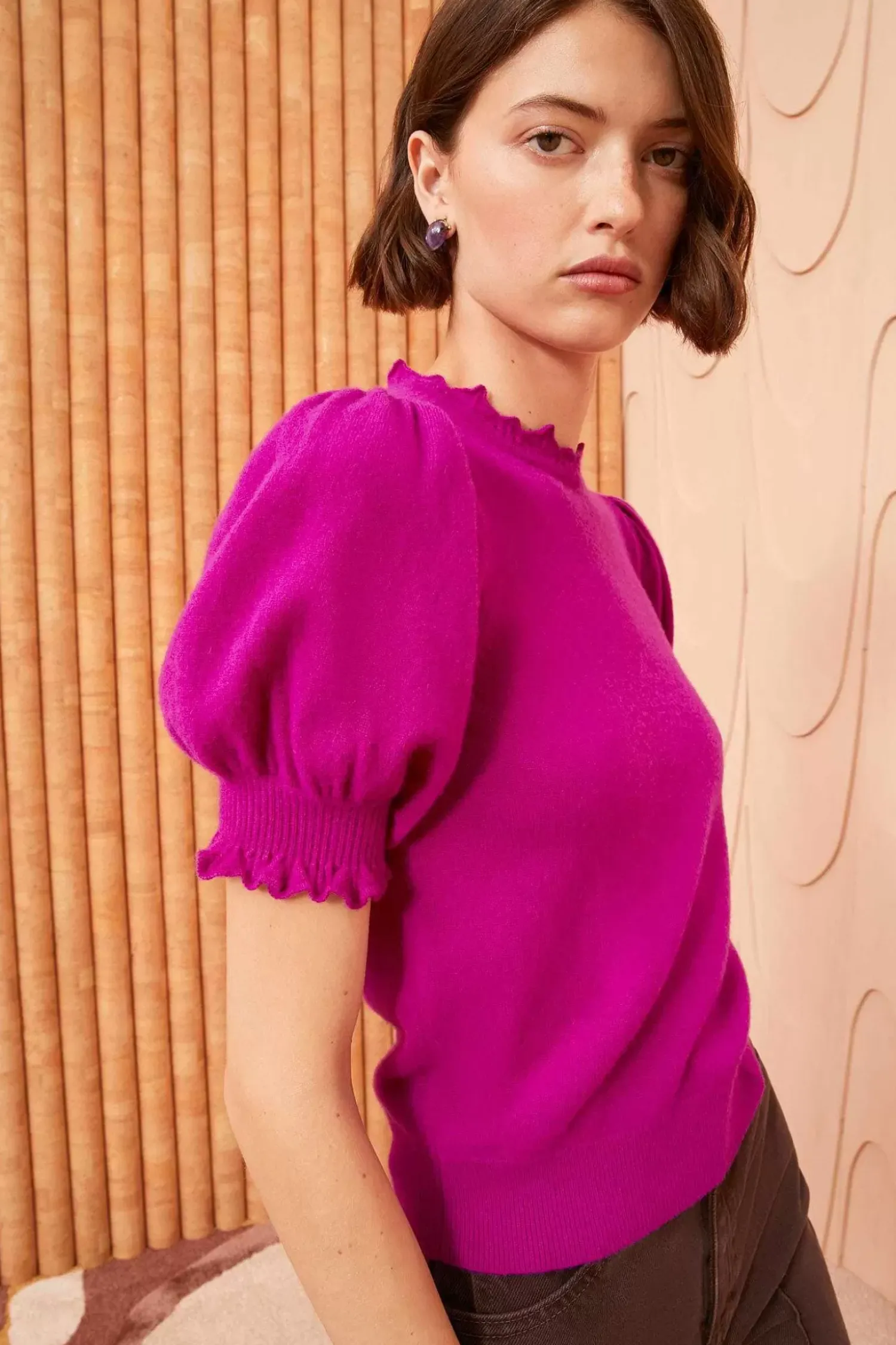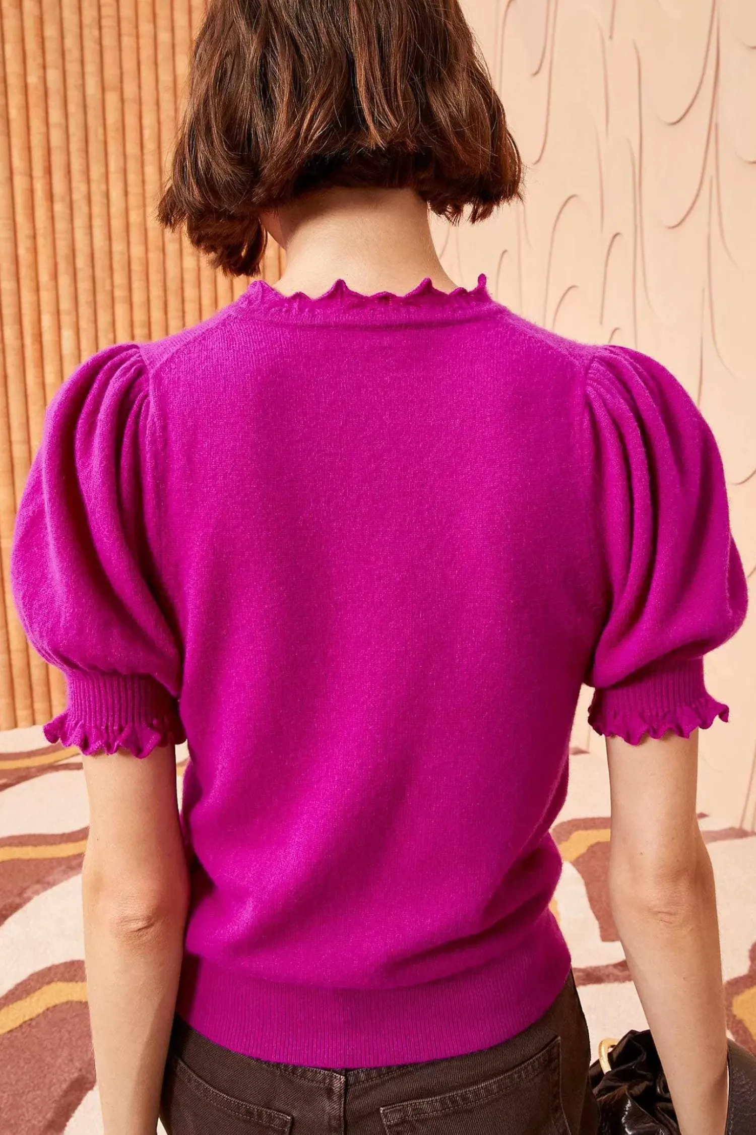 Our Lotta Top Is Spun From Luxurious Cashmere In A Classic Silhouette, Making It A Forever Staple. This Vivid Fuchsia Top Has Puff Short Sleeves And Is Finished With Pointelle Ruffles At The Collar And Cuffs.