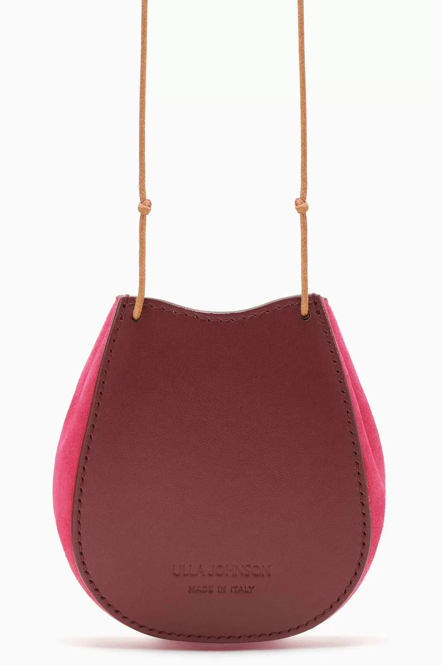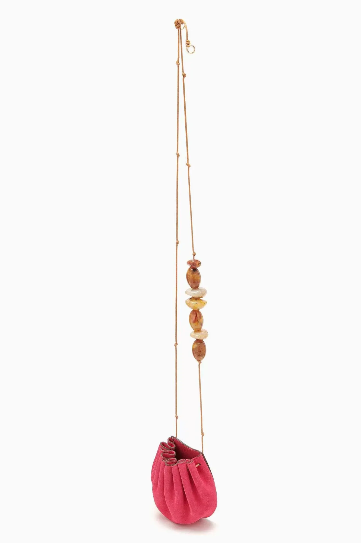 The Paloma Ruched Pochette Returns This Season, In A Gorgeous Pink Colorblock Suede. This Mini Crossbody Handbag Has A Drawstring Opening And A Thin Tubular Strap That Is Detailed With Tonal Resin Stones And Brass Hoops At Each End.