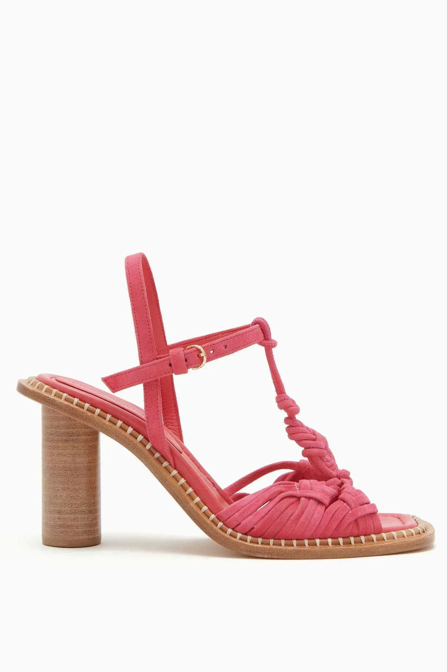 The Penina Macrame Braided High Heel Is Made Of Hot Pink Leather And Features Soft Braided Suede That Creates A Delicate Macrame-Inspired Design. This Open-Toed Silhouette Is Elegantly Elevated By A Stacked Cylinder Heel And Finished With A Shiny Brass Buckle.