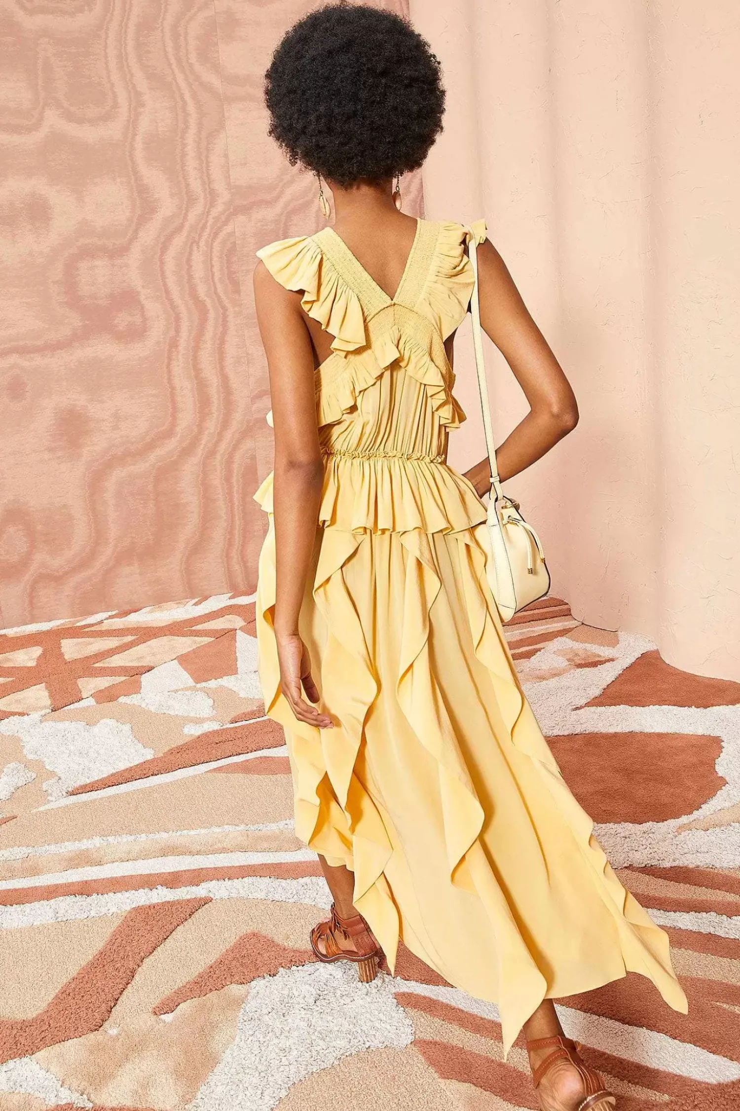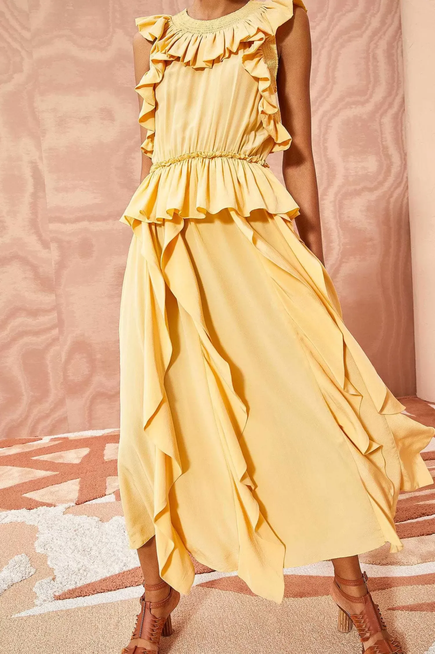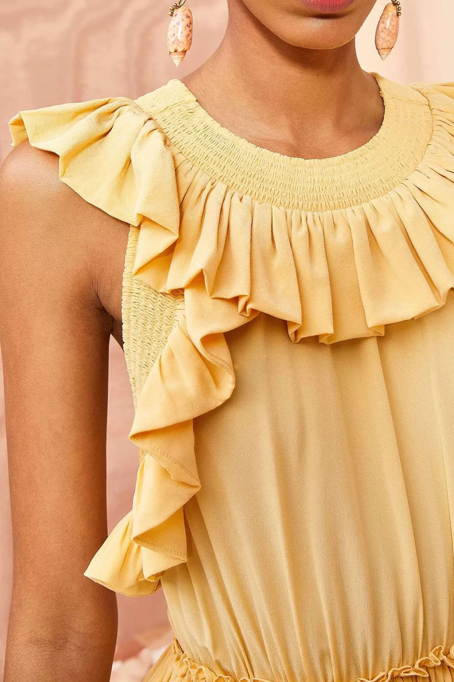 As Featured In Look 17 Of Our Pre-Fall ’23 Lookbook, The Violeta Dress Is Crafted In 100% Silk Crepe De Chine, A Flowing Fabrication That Is Manipulated Through Dense Smocking And Cascade Ruffles That Trail The Bodice And Skirt. This Pale Yellow, Romantic Frock Is Finished With A Side-Seam Zipper And Pockets.