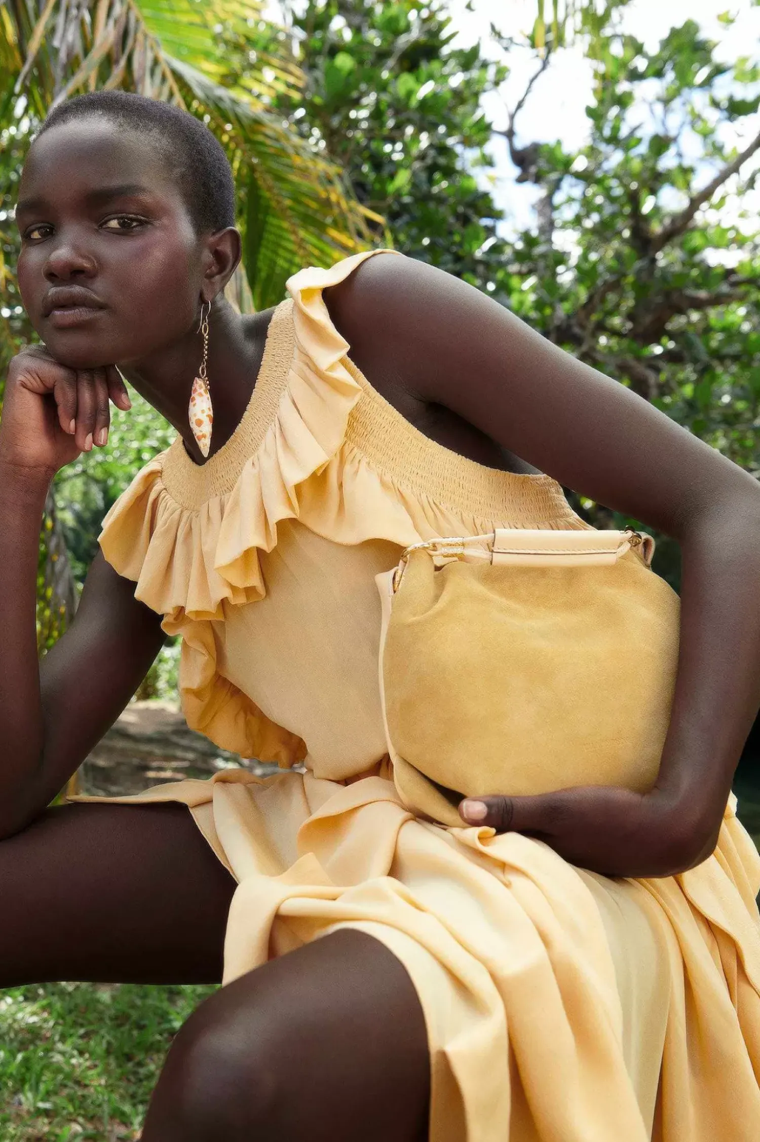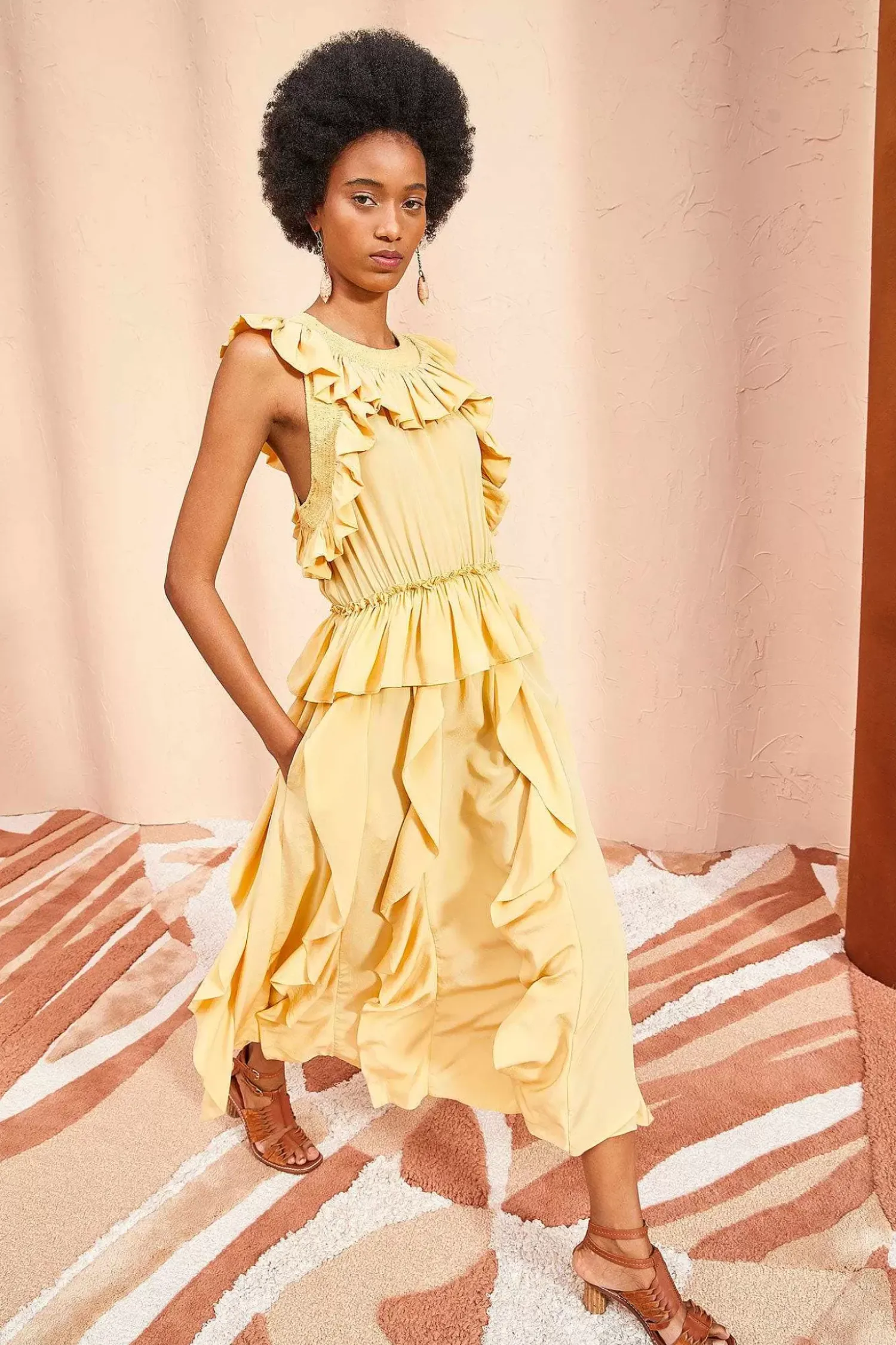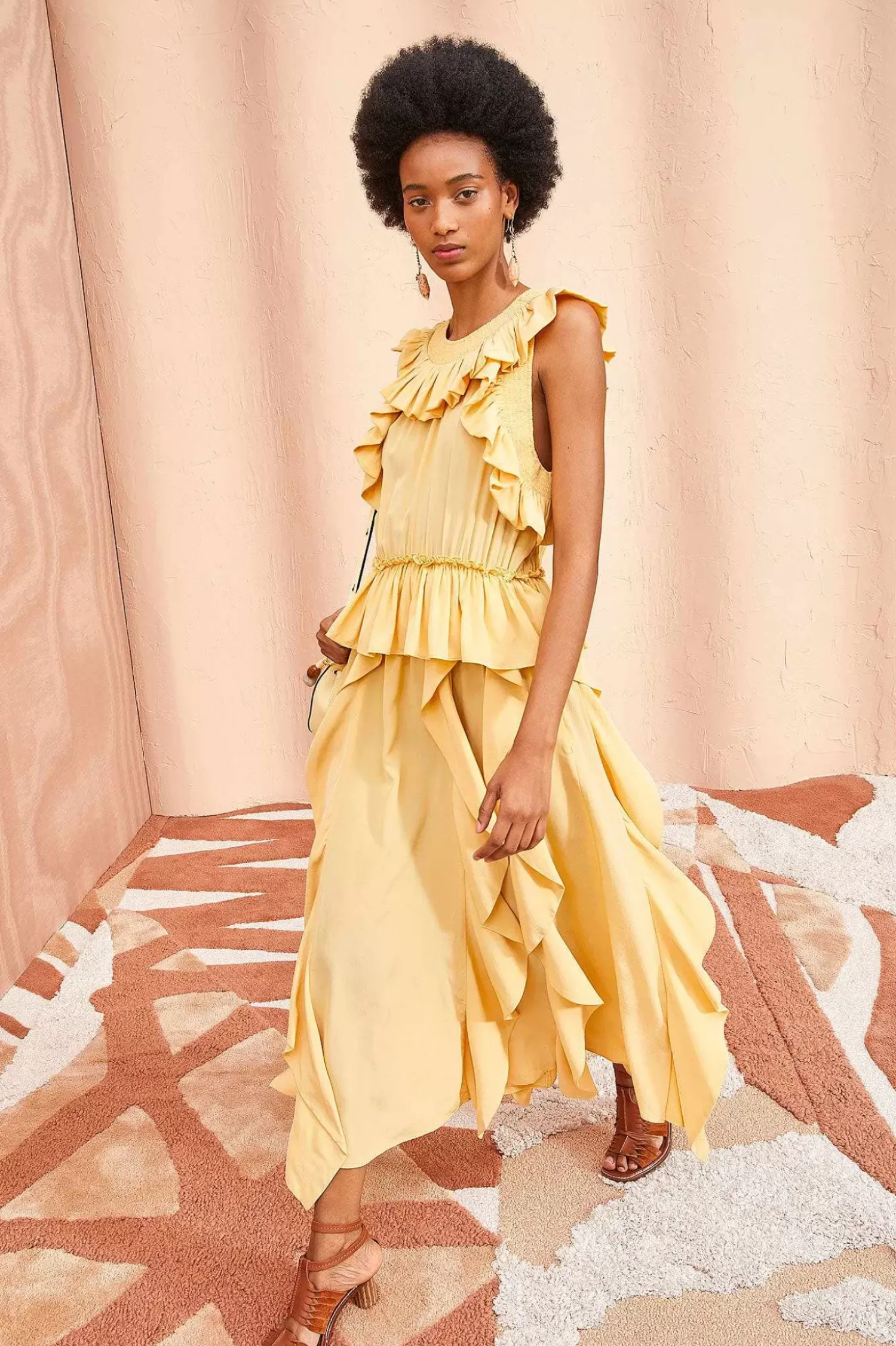 As Featured In Look 17 Of Our Pre-Fall ’23 Lookbook, The Violeta Dress Is Crafted In 100% Silk Crepe De Chine, A Flowing Fabrication That Is Manipulated Through Dense Smocking And Cascade Ruffles That Trail The Bodice And Skirt. This Pale Yellow, Romantic Frock Is Finished With A Side-Seam Zipper And Pockets.