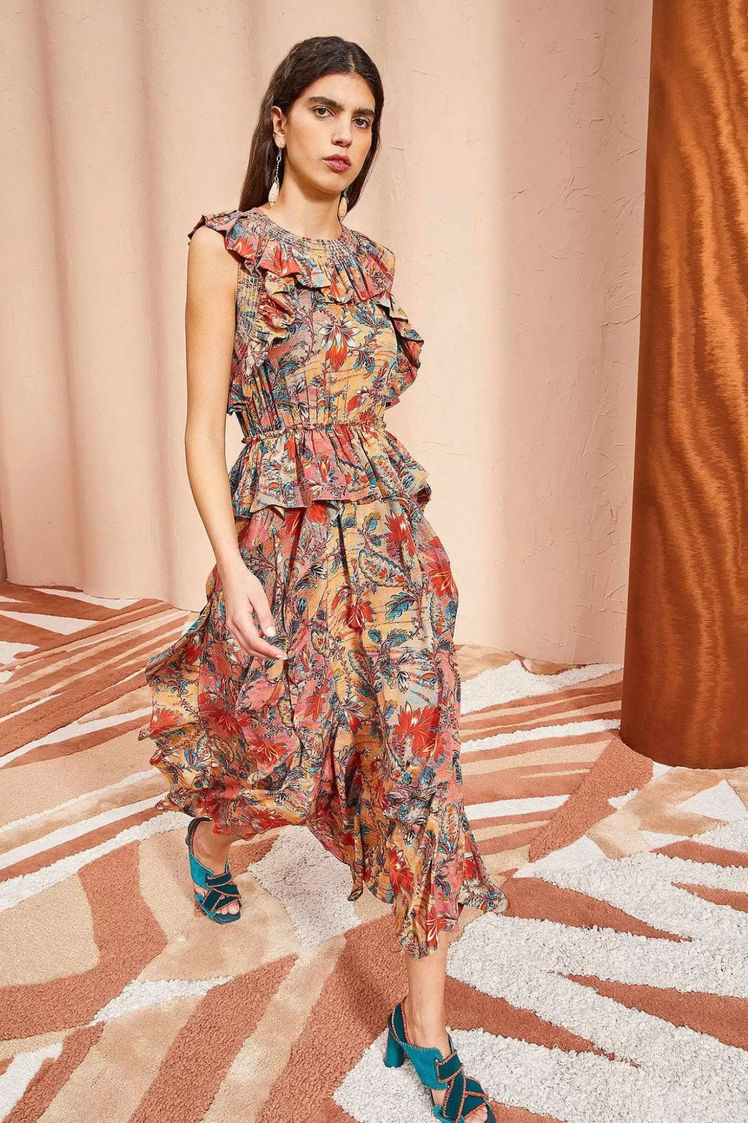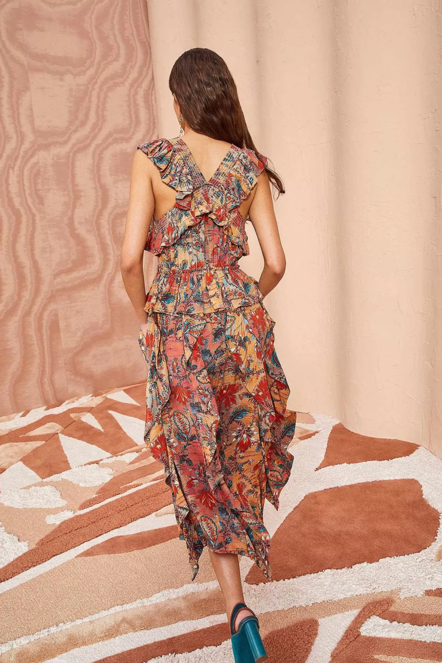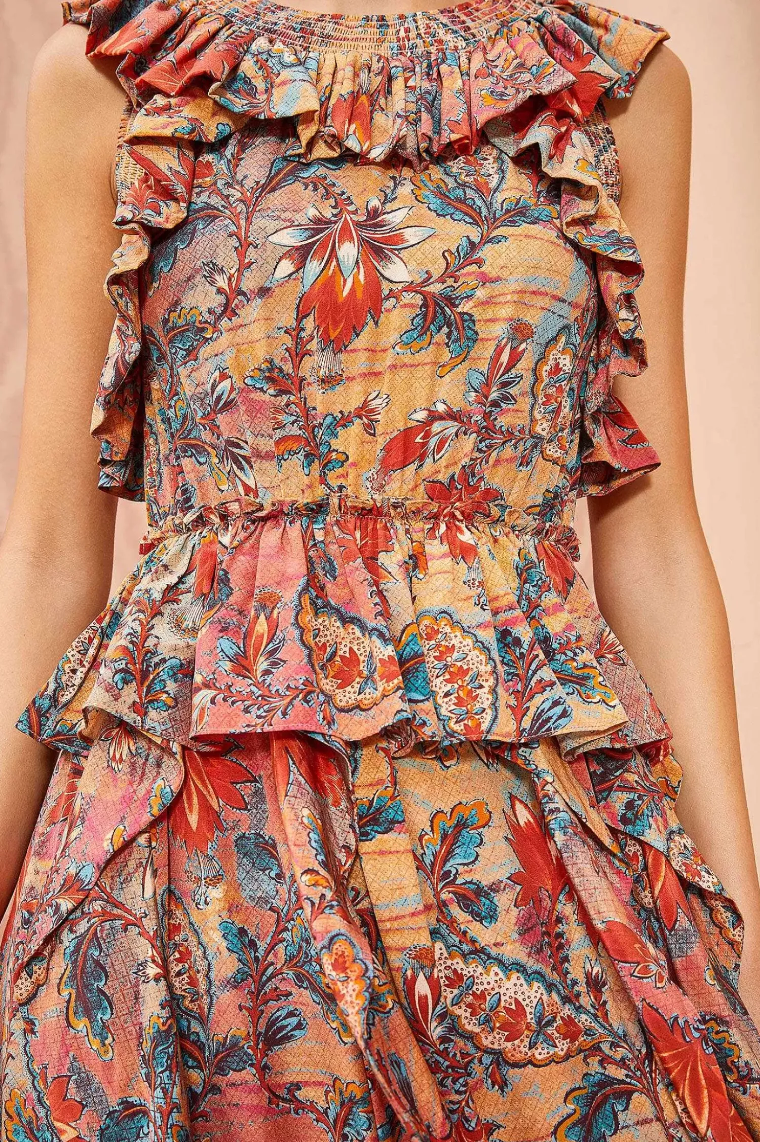 The Violetta Dress Is Crafted In Our 100% Silk Crepe De Chine, Featuring A Stunning Orange, Red And Blue Floral Print. This Gorgeous Sleeveless Silhouette Is Defined By Its Ruffled Bodice, Fitted Waistline, And Cascading Ruffles Along The Skirt. It Is Finished With A Side-Seam Zipper.