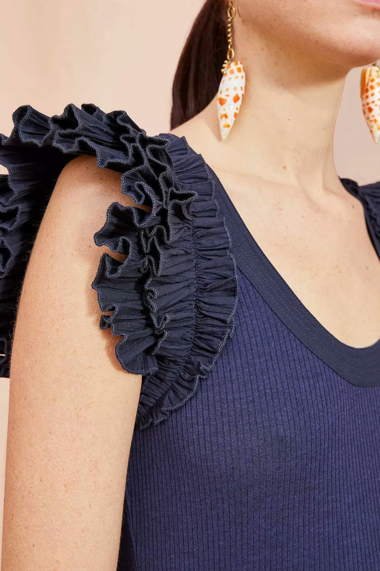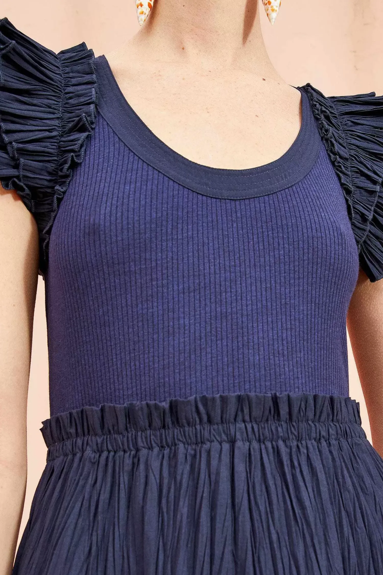 Our Virginia Dress Is Created By Mixing Two Sumptuous Fabrics Together. Its Body-Skimming Bodice Is Crafted From Our Ultra-Fine Ribbed Knit, And The Skirt Is Made From Our Signature Pleated Poplin, Designed With Three Tiers That Fall Into A Full, Floaty Skirt. This Stunning Navy Midi Dress Has Soft Poplin Flutter Sleeves That Are Layered To Create Subtle Drama At Each Shoulder, And A Round Neckline. Finished With Side-Seam Pockets.