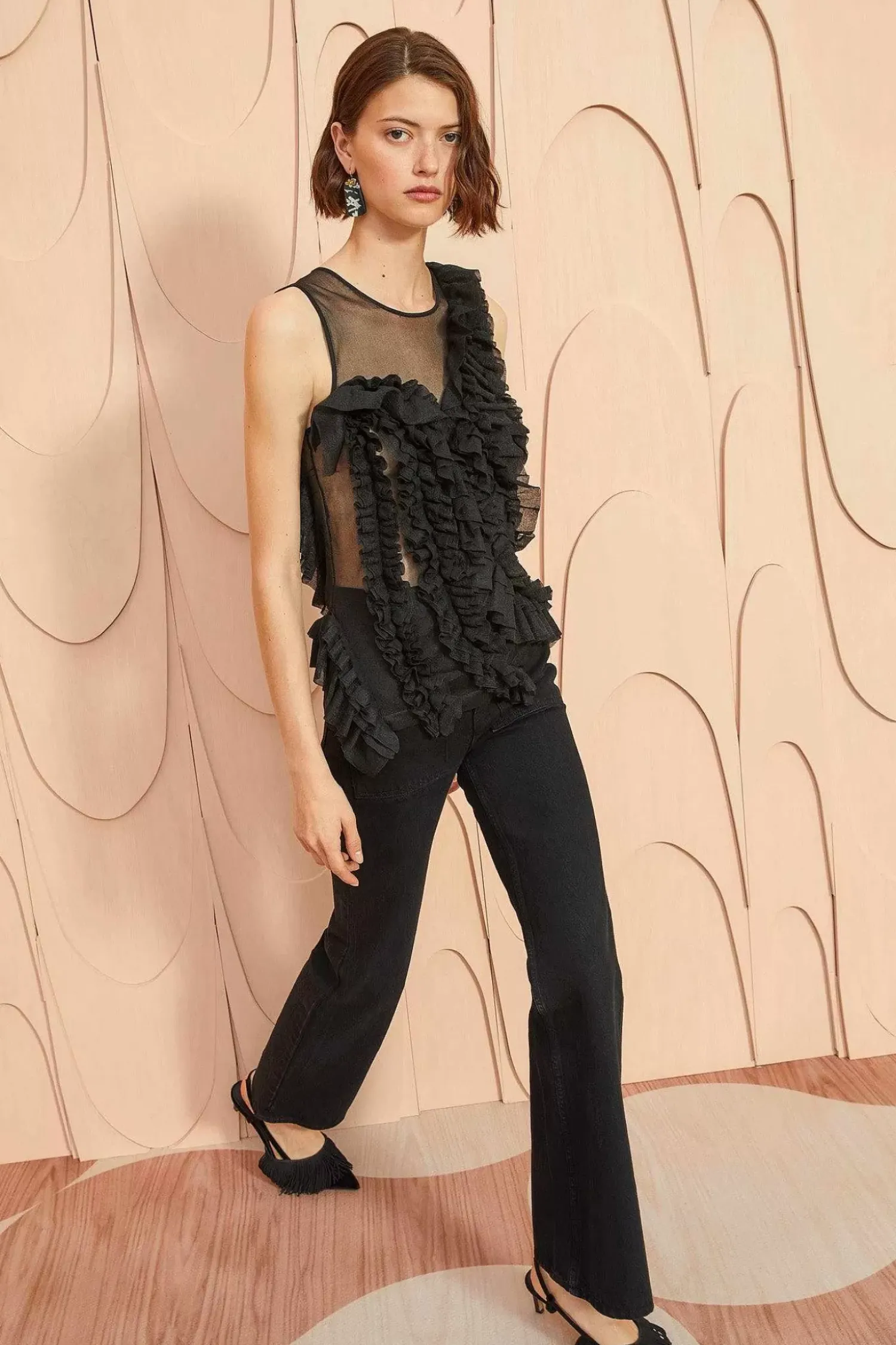 As Featured In Look 38 Of Our Autumn/Winter ’23 Runway Show, The Winnifred Top Is Made From Our Translucent Frills Knit, A Sheer Top Adorned With A Strategically Placed Explosion Of Fluttering Frills Across The Bodice. Pair This Black Sleeveless Top With The Sarafina Skirt For The Full Look.
